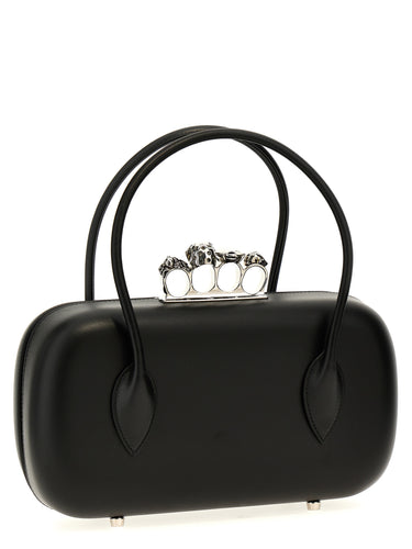 'The reverse' leather clutch with leather handle, metal ring handle decorated with crystals and zip opening.