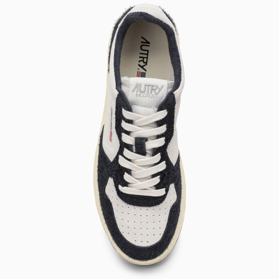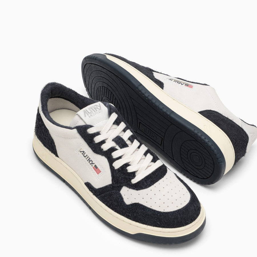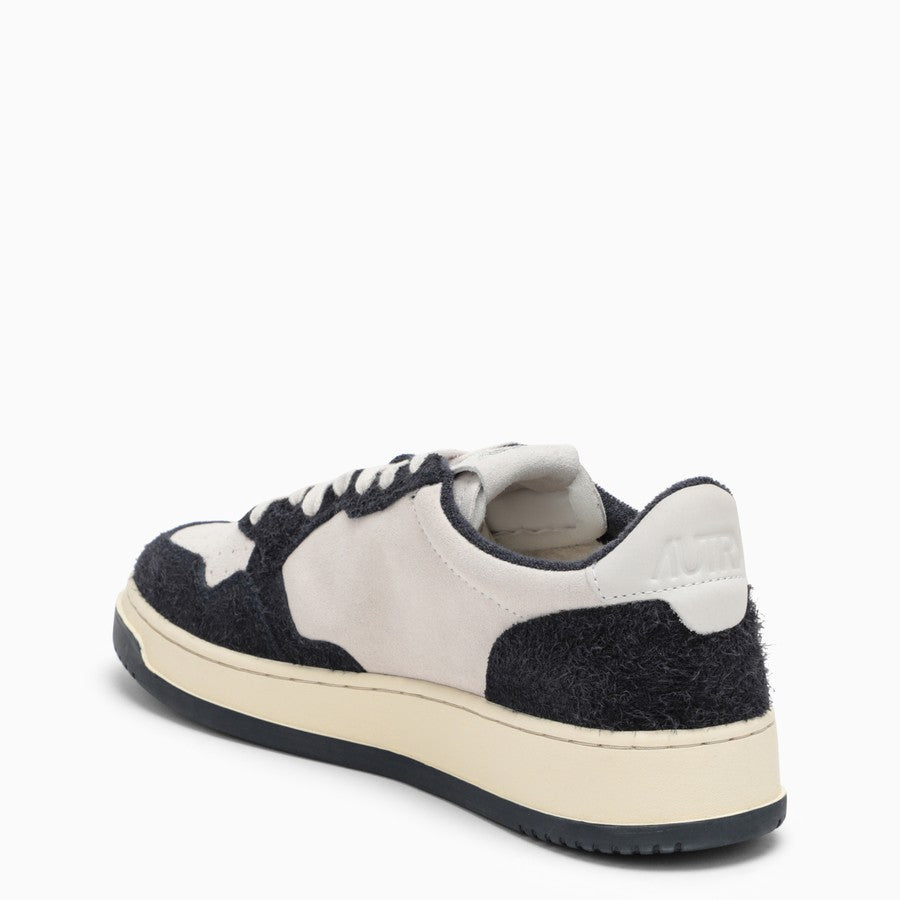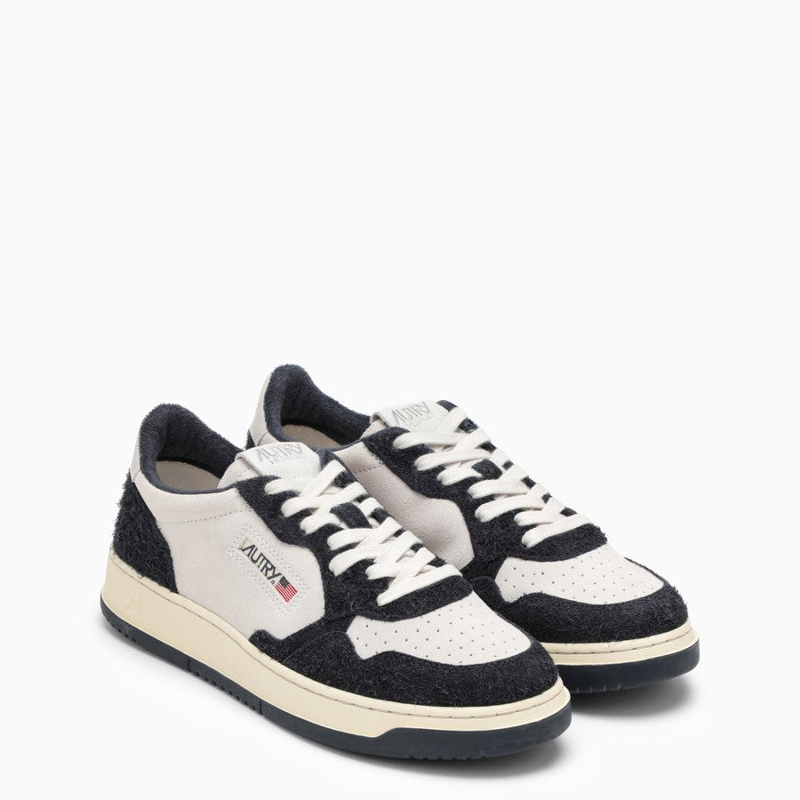 White and space-coloured leather low top trainers with side logo, perforated toe, lace-up front fastening, leather tongue with tone-on-tone stitched label, padded collar, embroidered logo on back heel, leather and cotton terry lining and cream-coloured rubber sole.