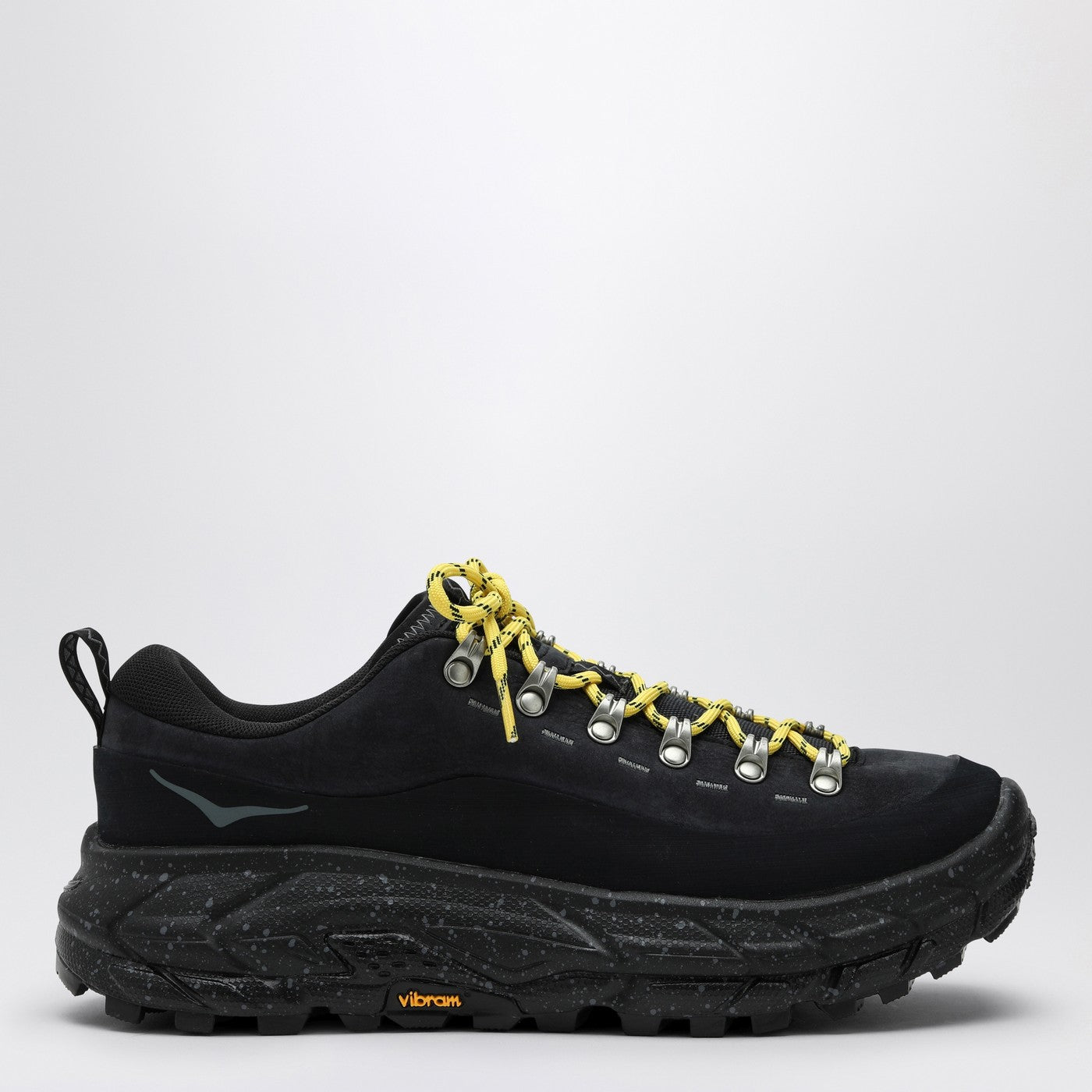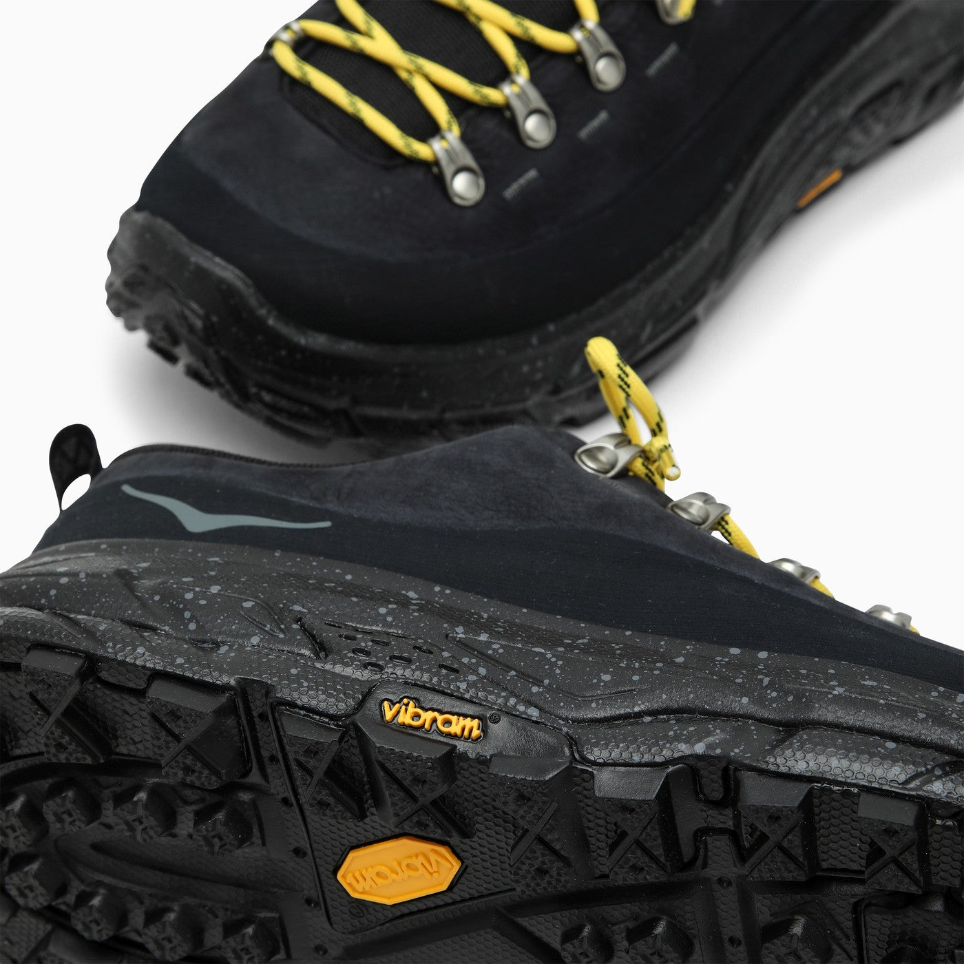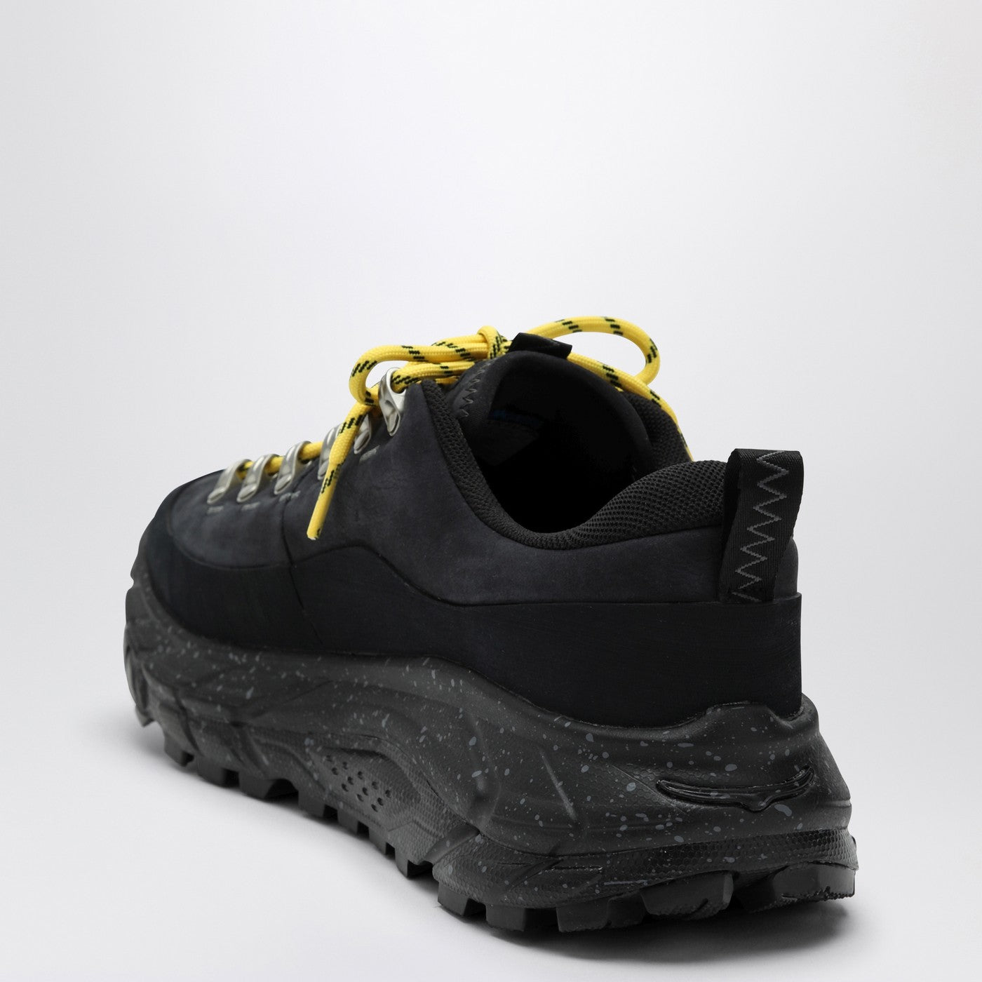 Low top trainer by HOKA ONE ONE featuring a black nubuck upper, rounded toe, yellow lace-up fastening, Vibram Megagrip sole, metal eyelets and anti-mud rubber elements.