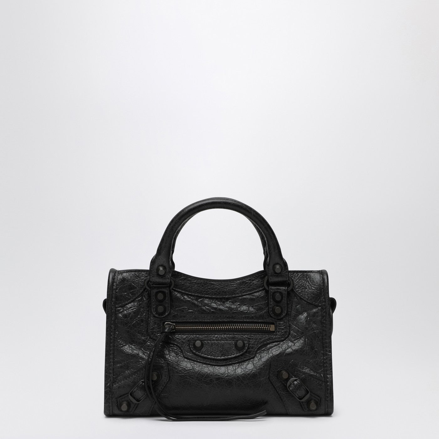 Mini tote bag by Balenciaga in black Arena Storico lambskin leather featuring two top handles, an adjustable and removable shoulder strap, a zip fastening, a leather zip puller, a front zip pocket and an interior zip pocket.
