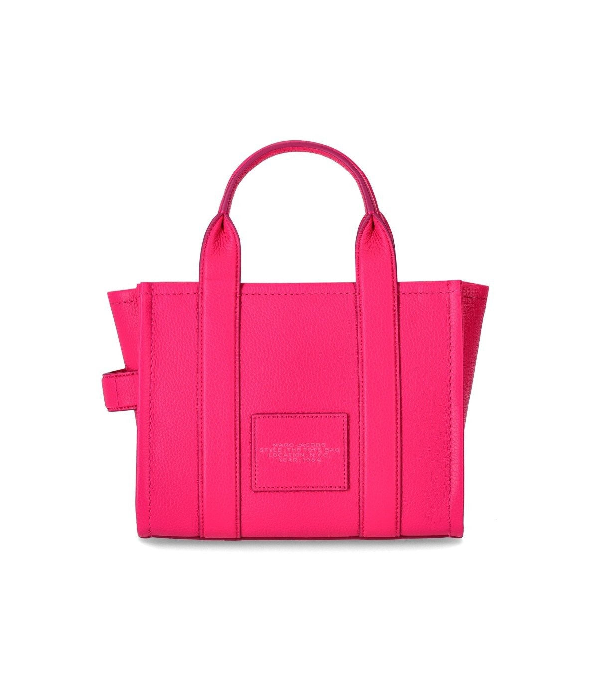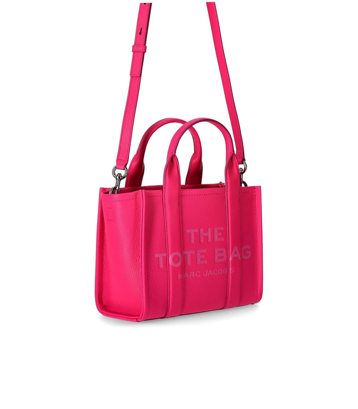 The Leather Small Tote handbag by Marc Jacobs made of fuchsia pebbled leather. Front logo, gold hardware, interior with a slip pocket and zip closure. Adjustable and removable shoulder strap. Measurements 26x13x21 cm. Composition: 100% pebbled leather.