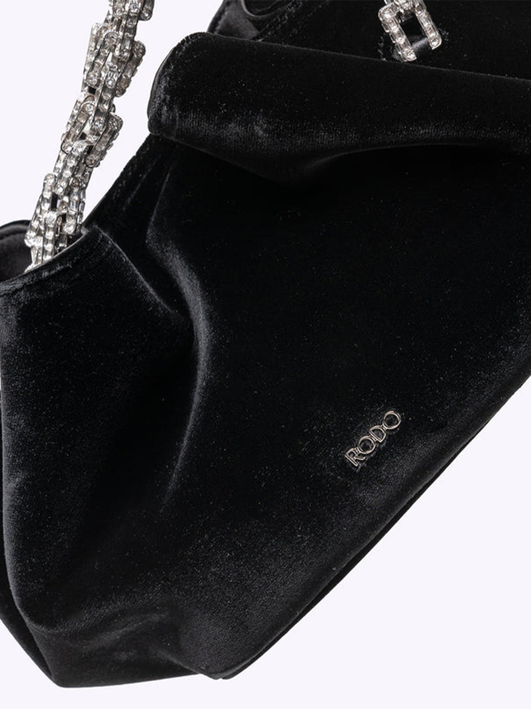 The Eva Small velvet bag with jewel chain handle stands out for its rounded shape, making it an always elegant and original choice for special occasions.