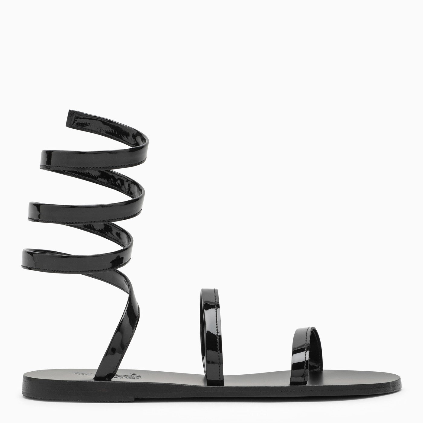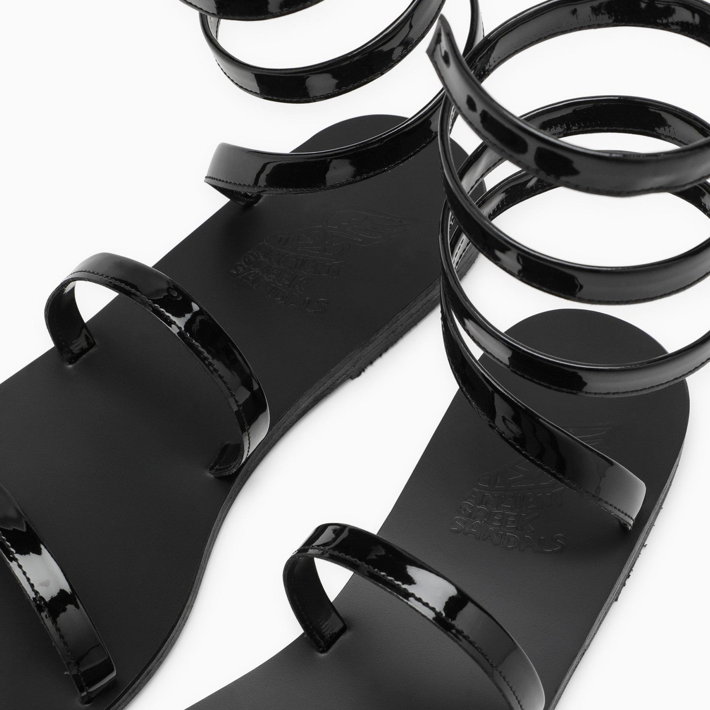 Meloivia sandals from Ancient Greek Sandals in black leather. Handcrafted sandals shaped with a spiral of straps that wind around the ankles and toes, featuring open toe, leather and rubber sole.