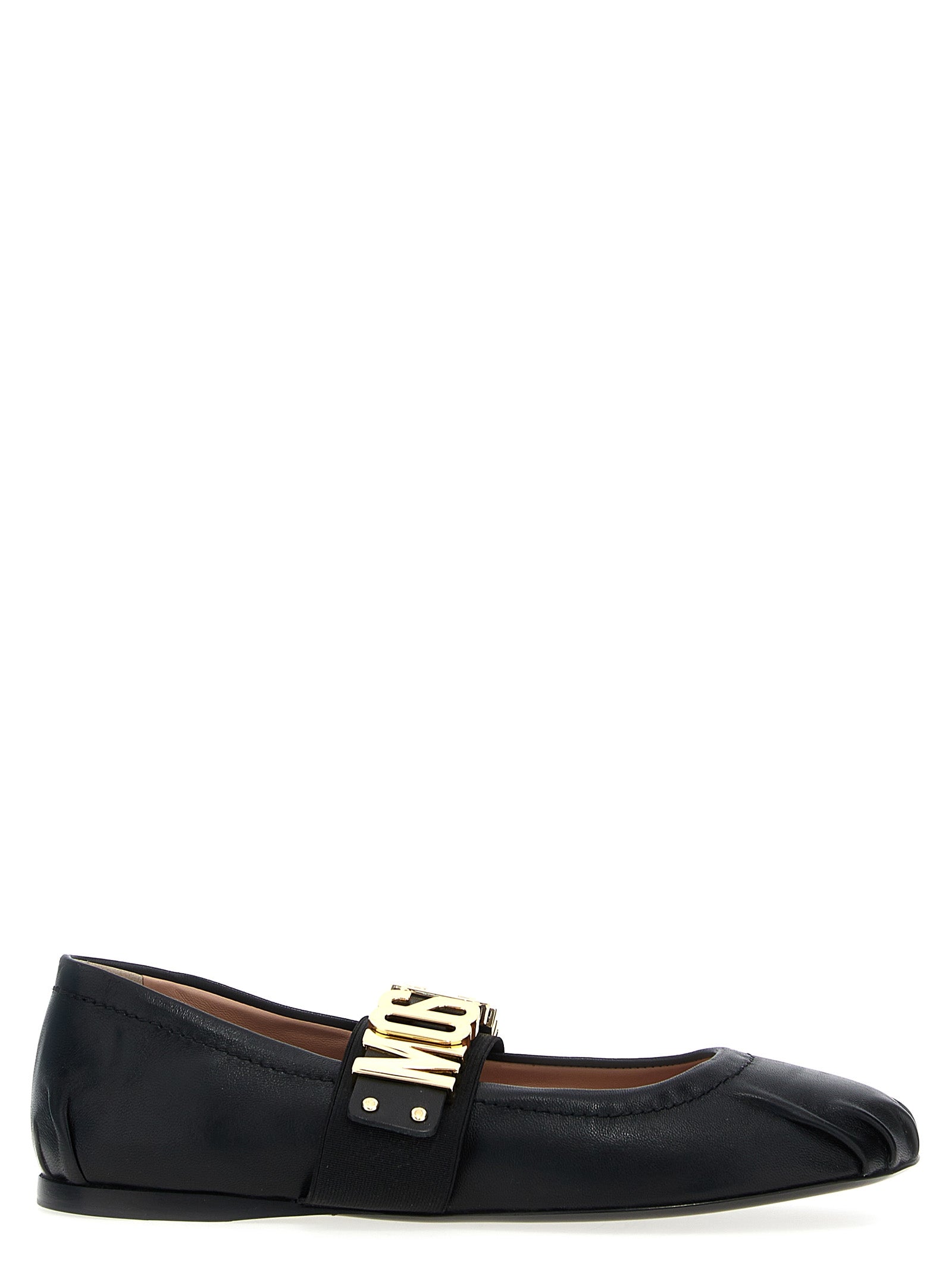 Nappa ballet flat, elastic with gold metal logo, leather sole.