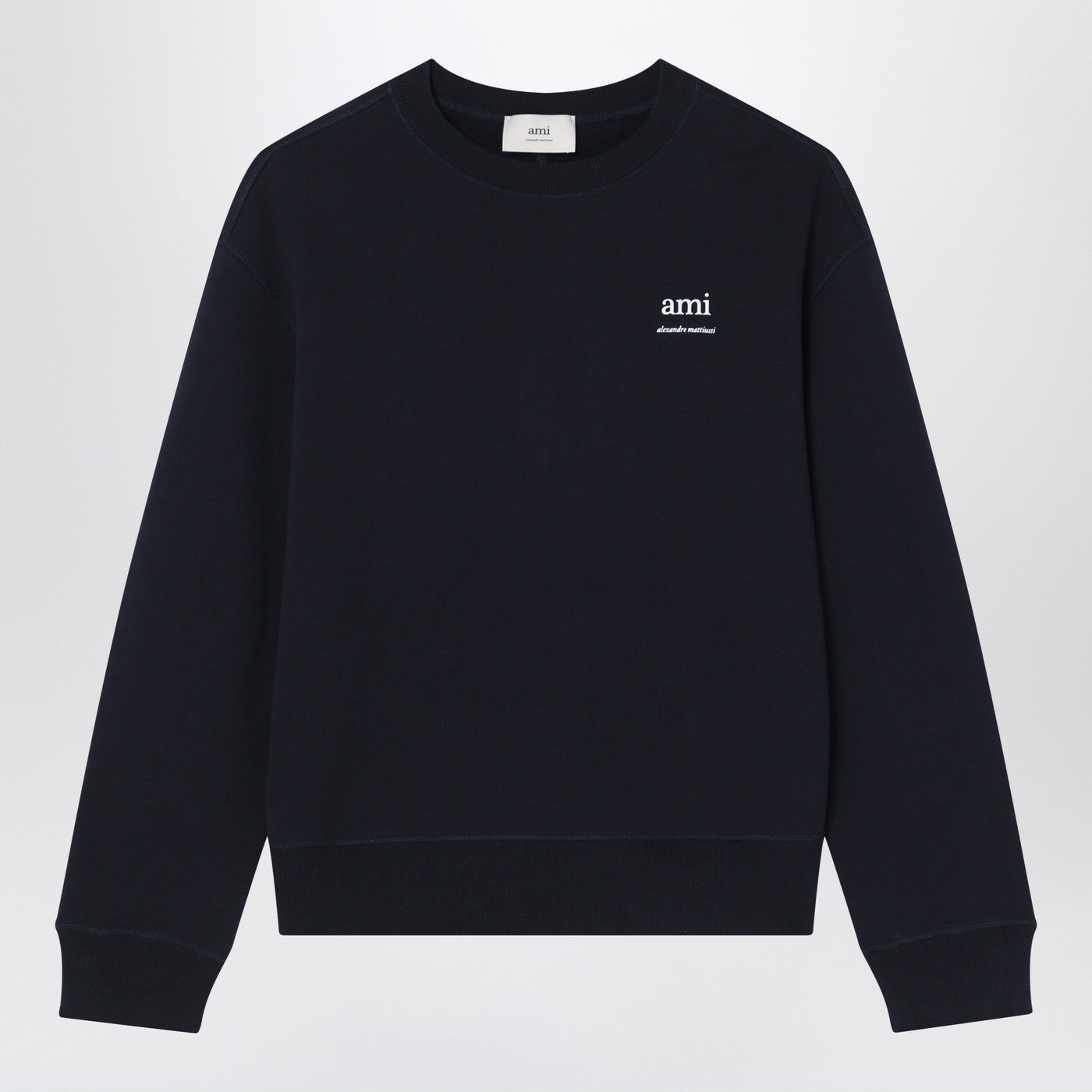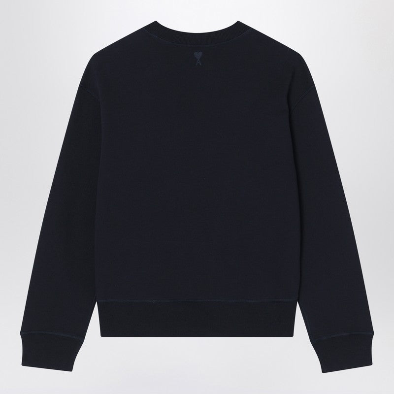 Navy blue organic cotton crew neck sweatshirt by Ami Paris, featuring long sleeves, contrasting logo lettering on the chest, tone-on-tone Ami de Coeur embroidery on the back, and ribbed edges.