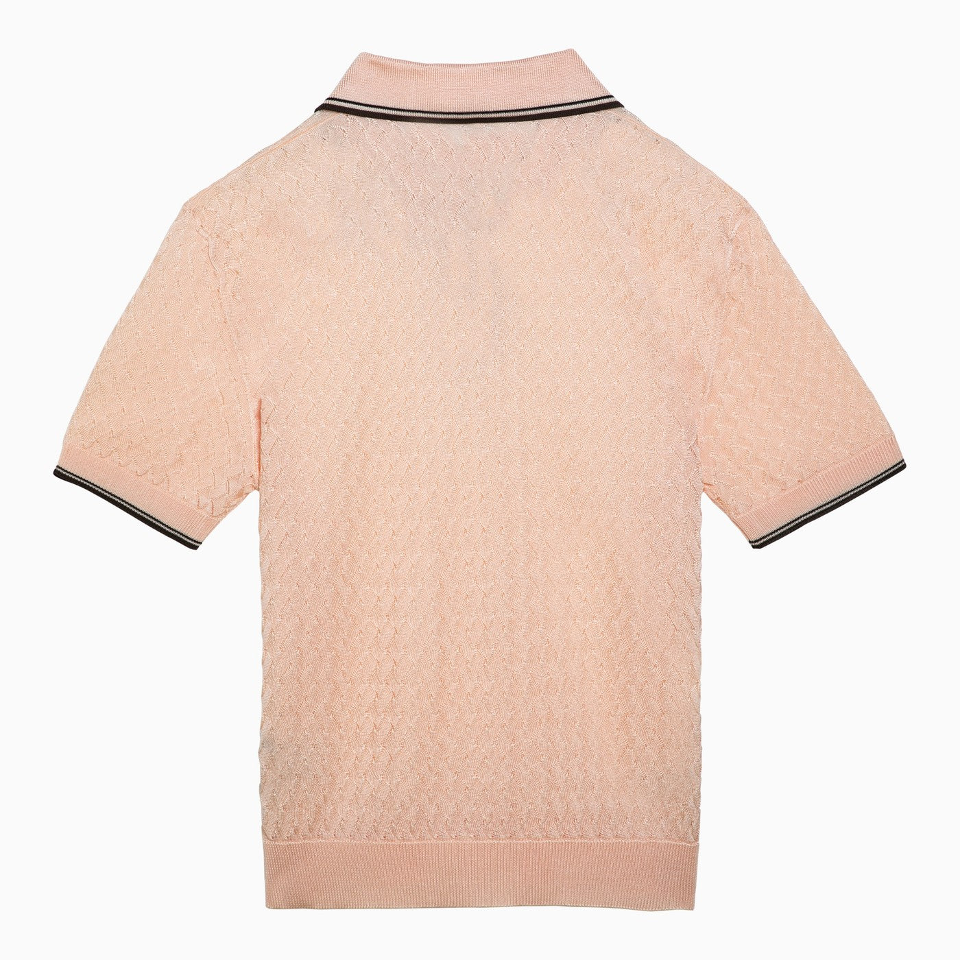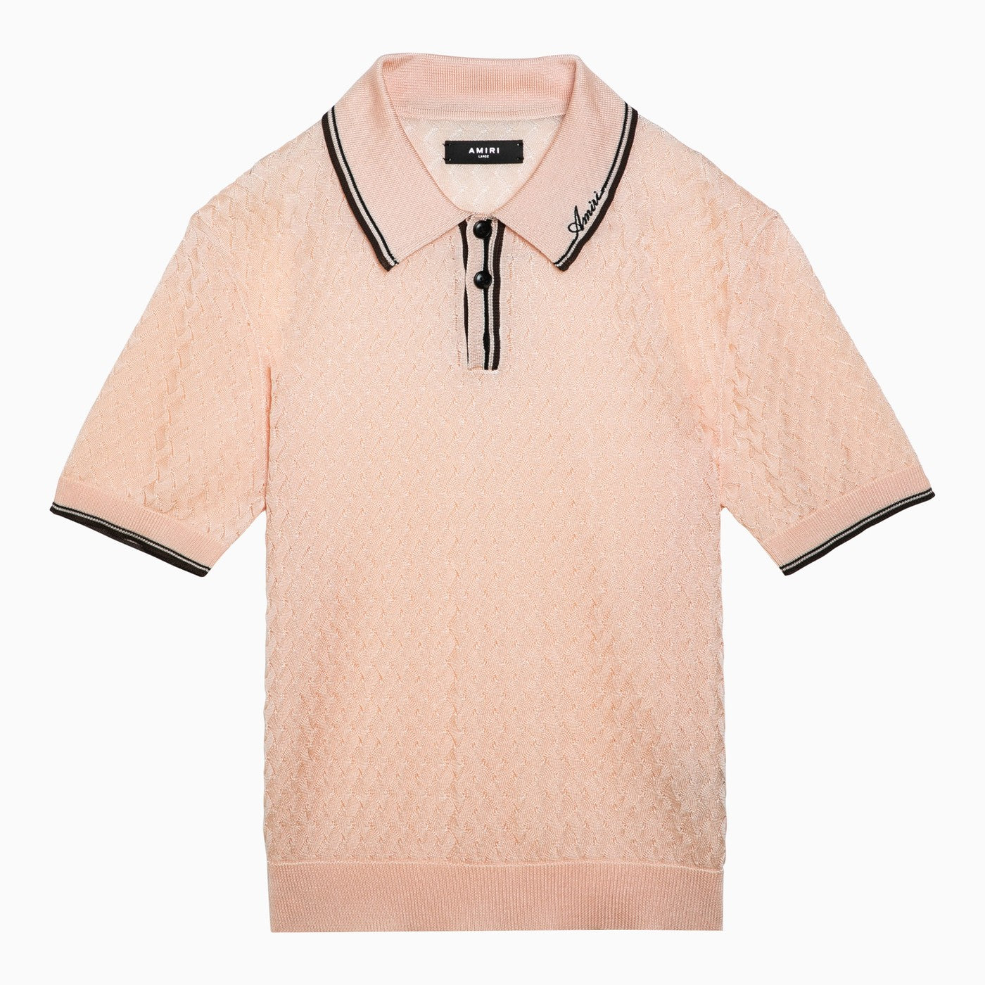 Light pink viscose knit polo shirt from Amiri features short sleeves, classic collar with contrasting detail and lettering logo, buttons on front and ribbed hem.