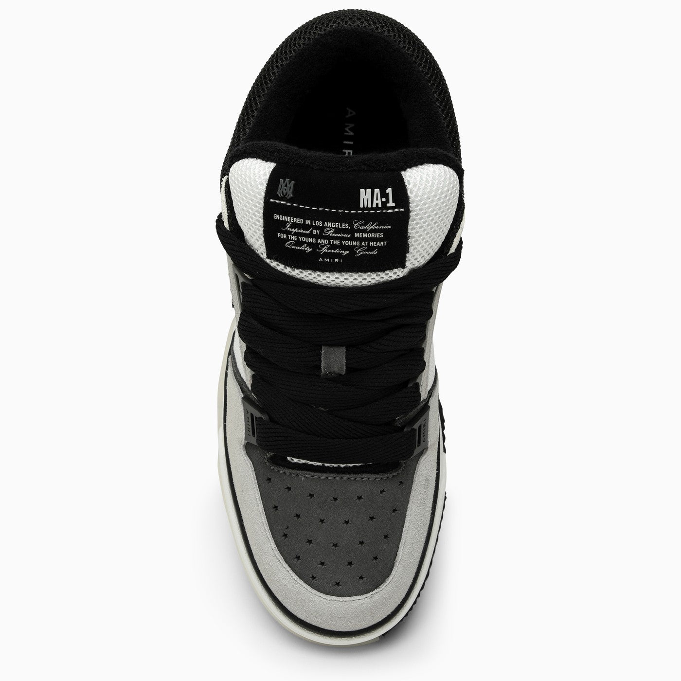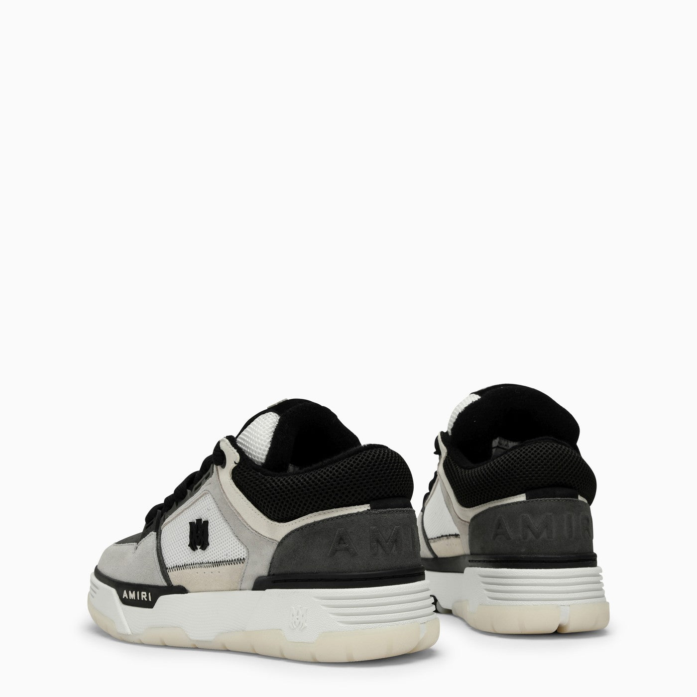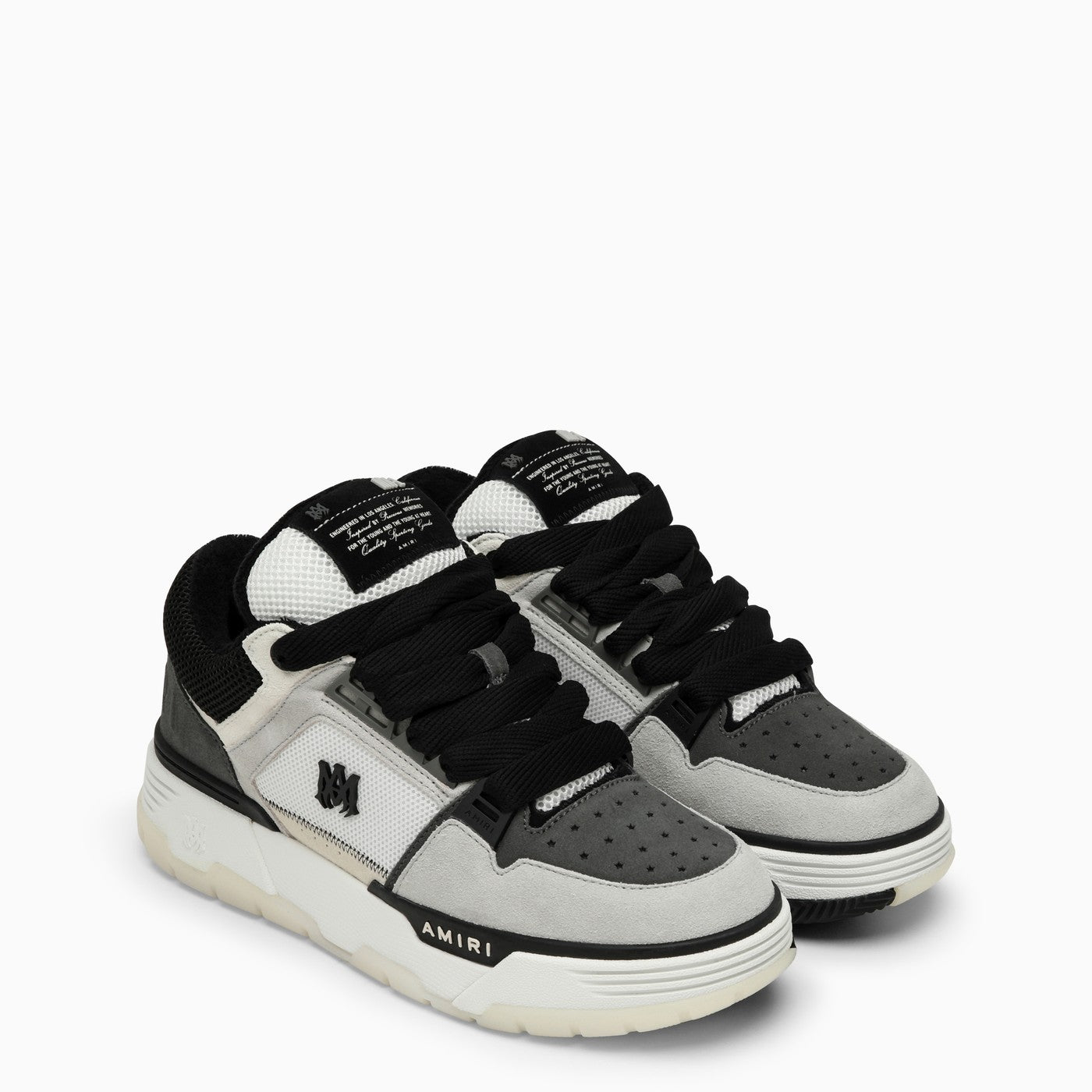 Black/grey/white leather and textile low top trainer from Amiri featuring a perforated round toe, lace-up fastening, padded logo tongue, rear lettering logo and rubber sole.