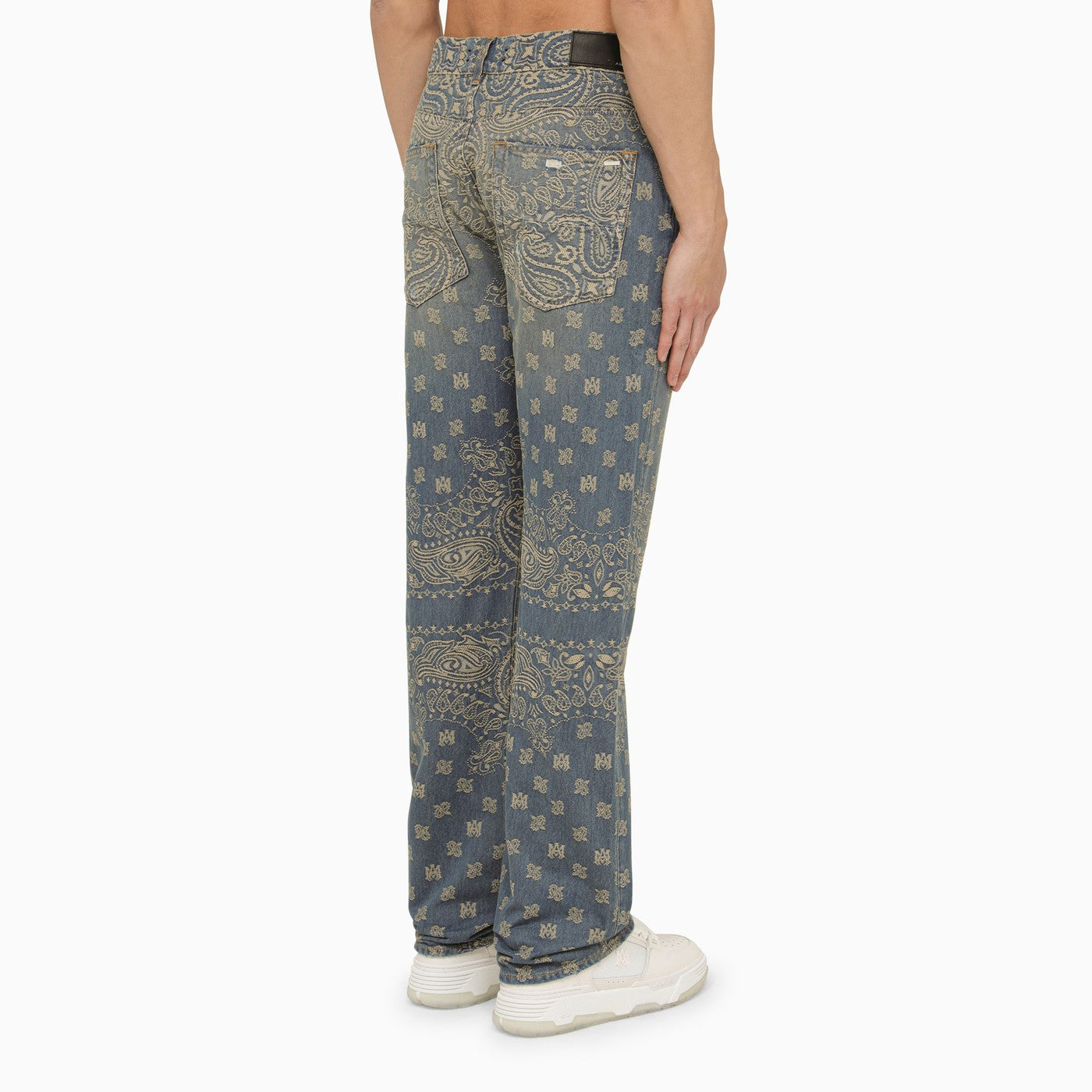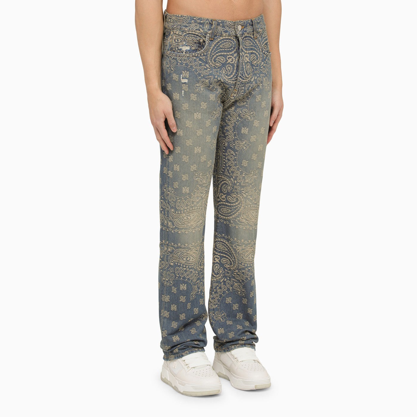 Indigo blue cotton denim regular jeans from Amiri featuring an all-over bandana pattern, a front zip and button fastening, belt loops, five classic pockets and a back logo patch.
