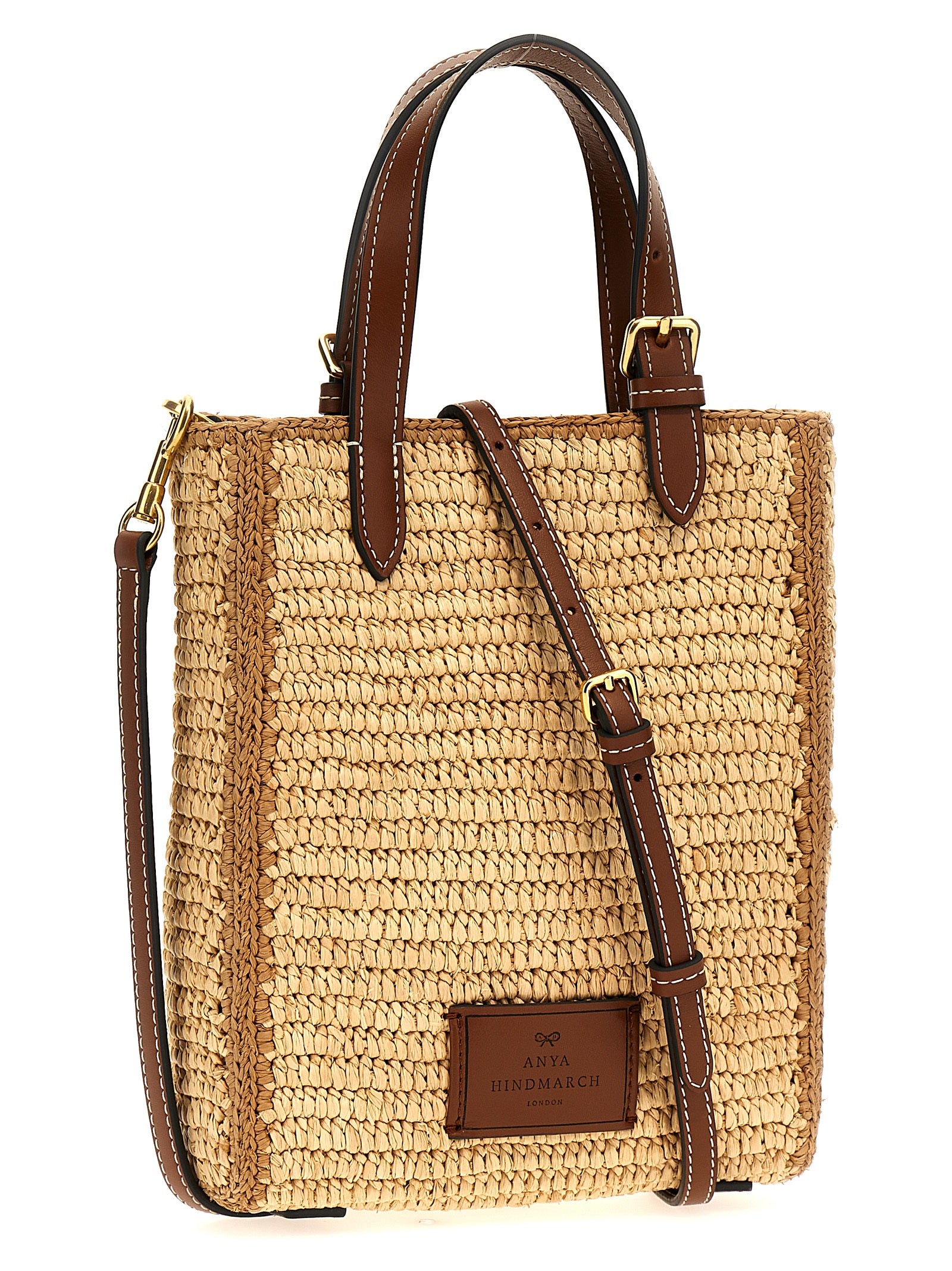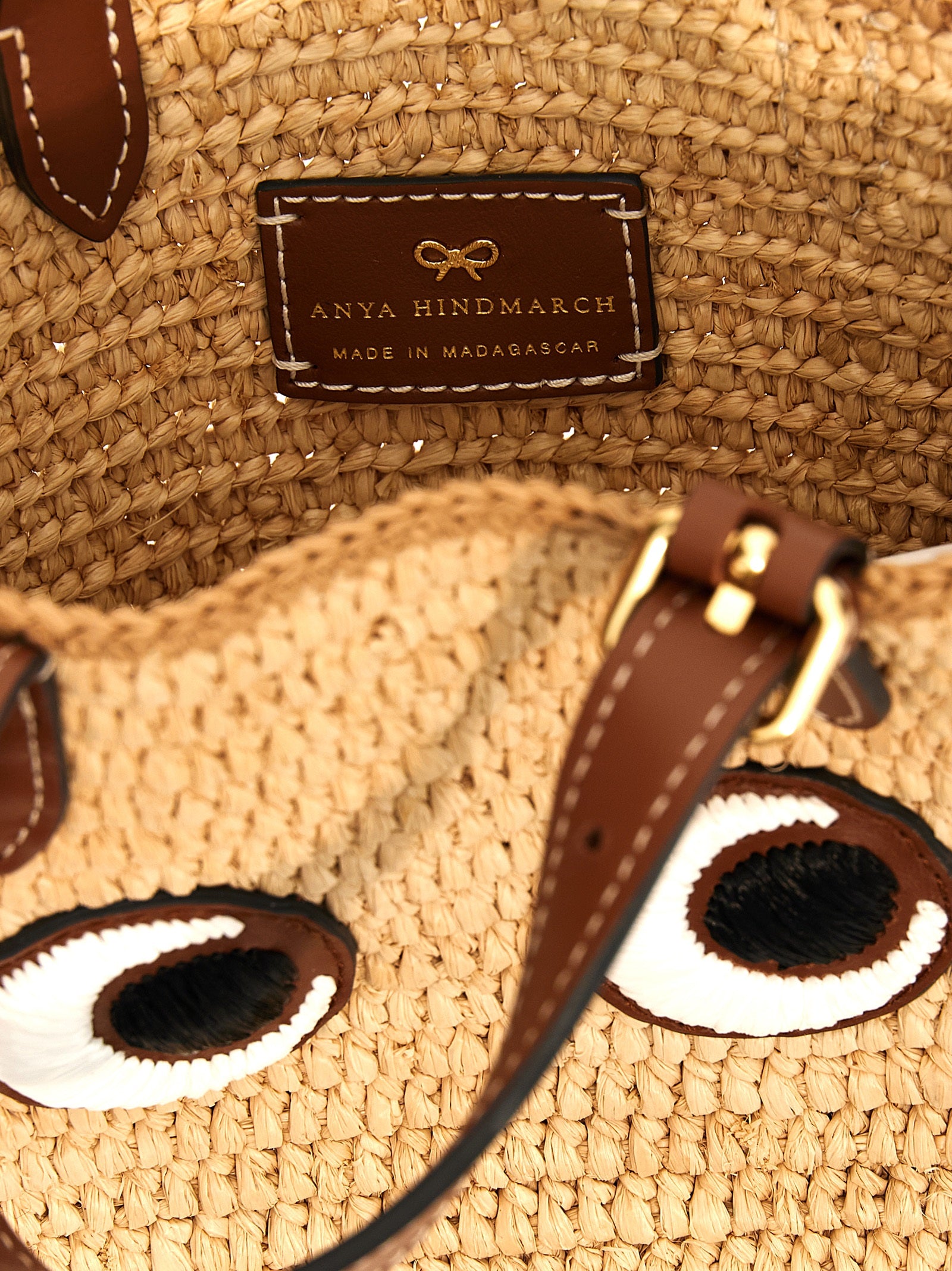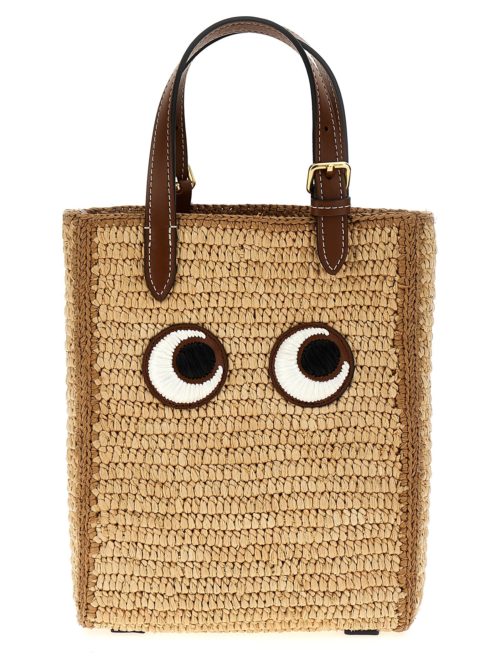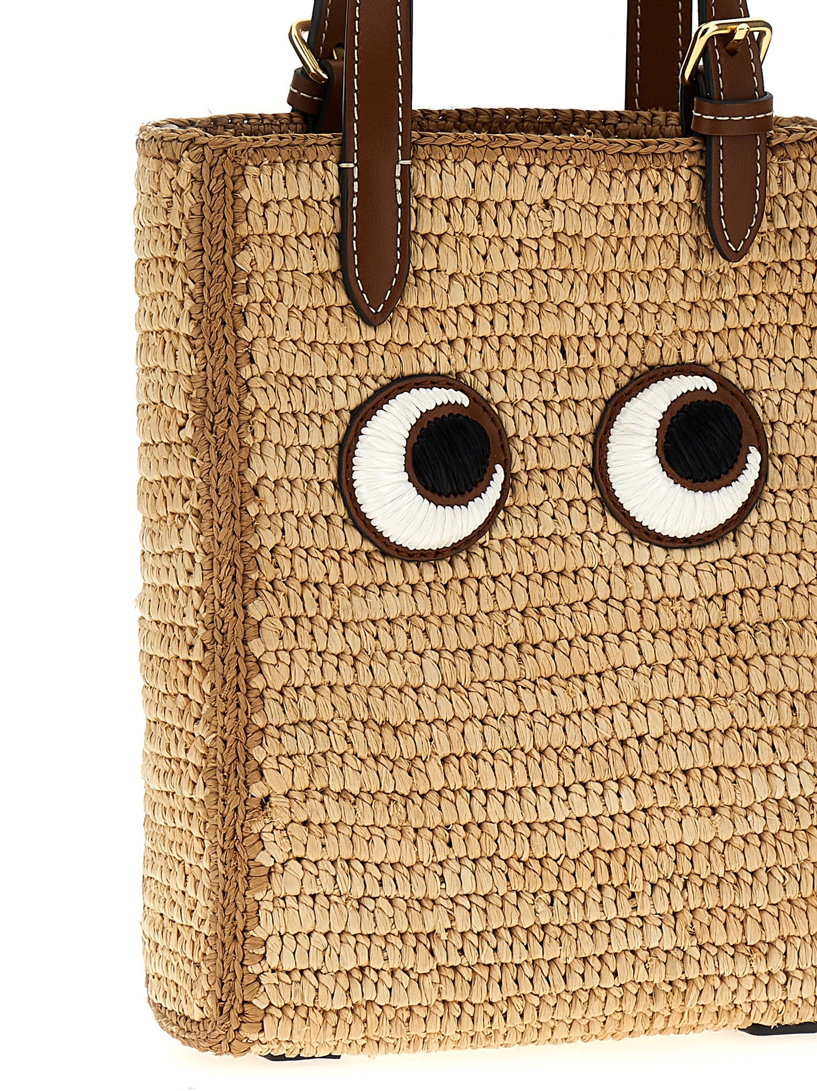 'Mini Eyes N/S' straw shopping bag with leather details, double handle, adjustable and removable shoulder strap, front embroidery.