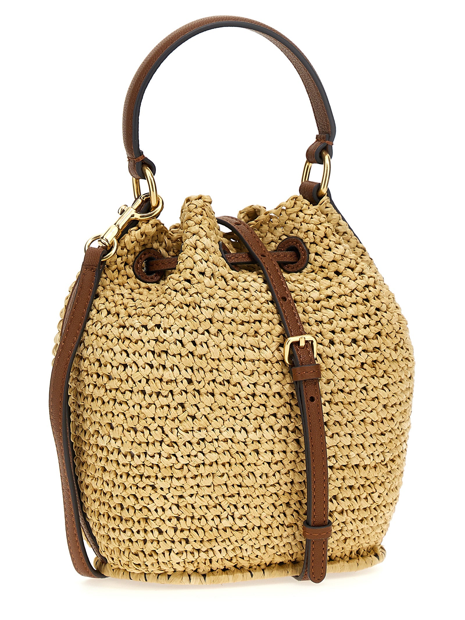 'Raffia Eyes Drawstring' raffia crossbody bag with leather details, short top handle, adjustable and removable shoulder strap, drawstring closure.