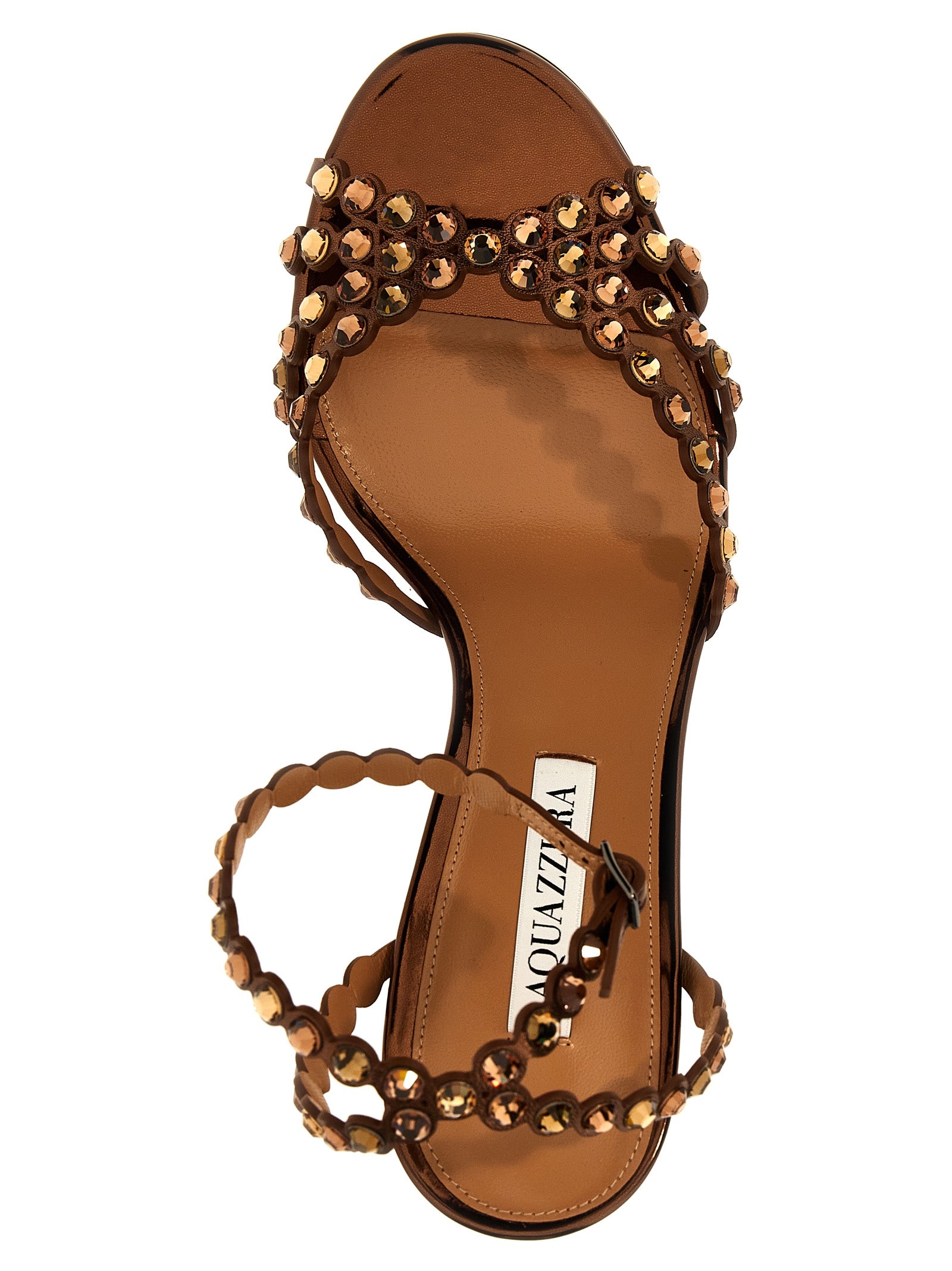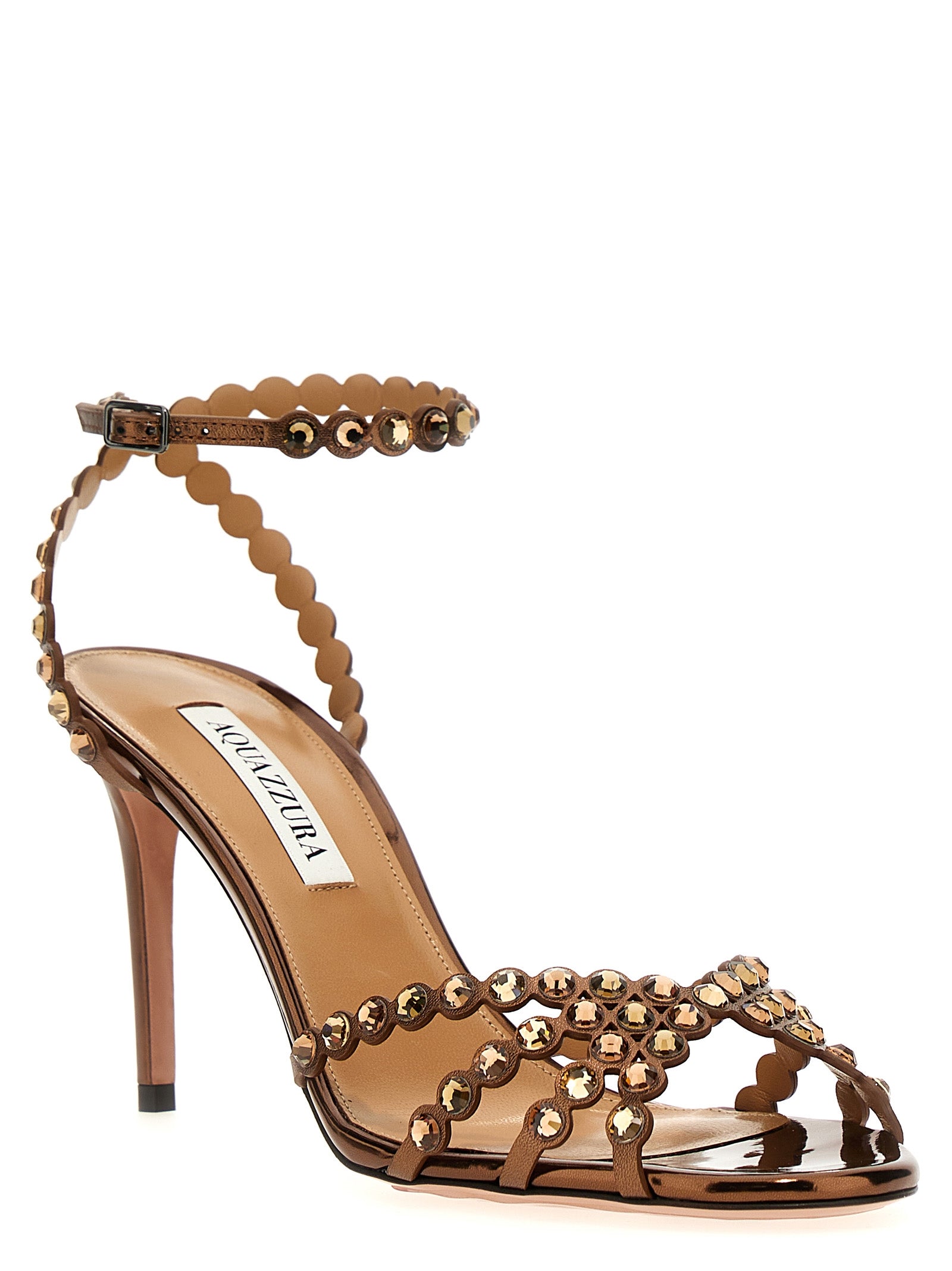 'Tequila' sandals in 'Super Specchio' fabric with rhinestone appliqué, ankle strap, heel. 'Espresso' coloring.