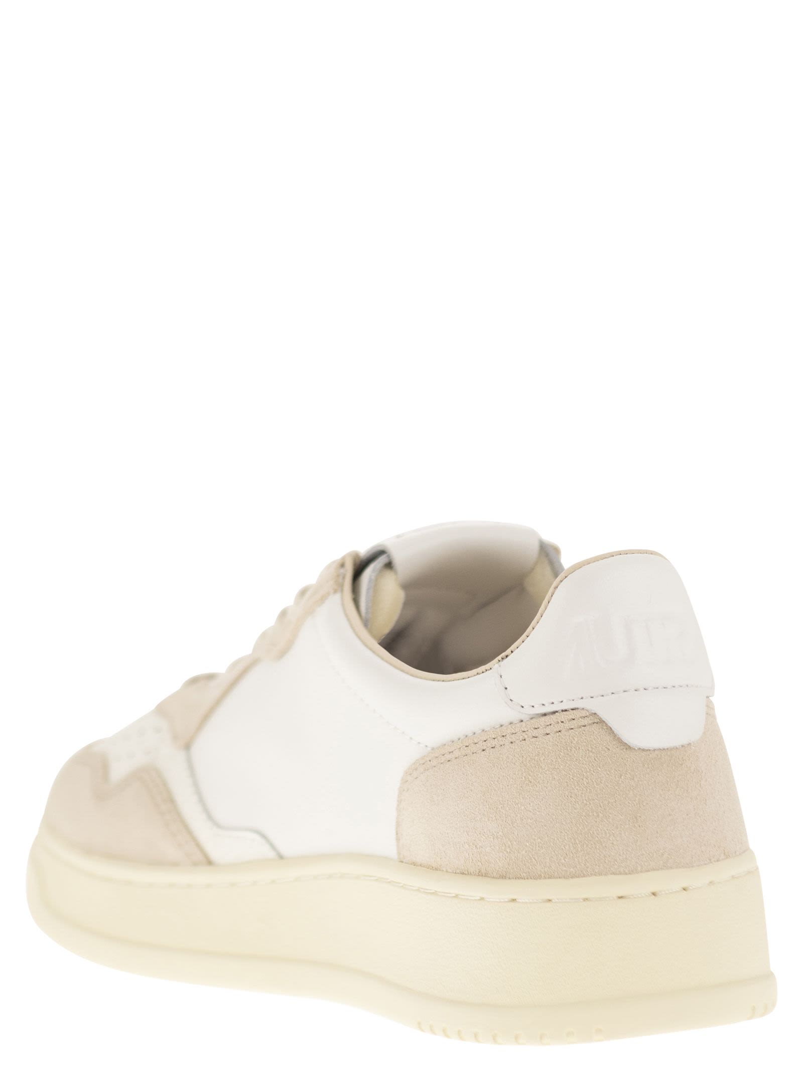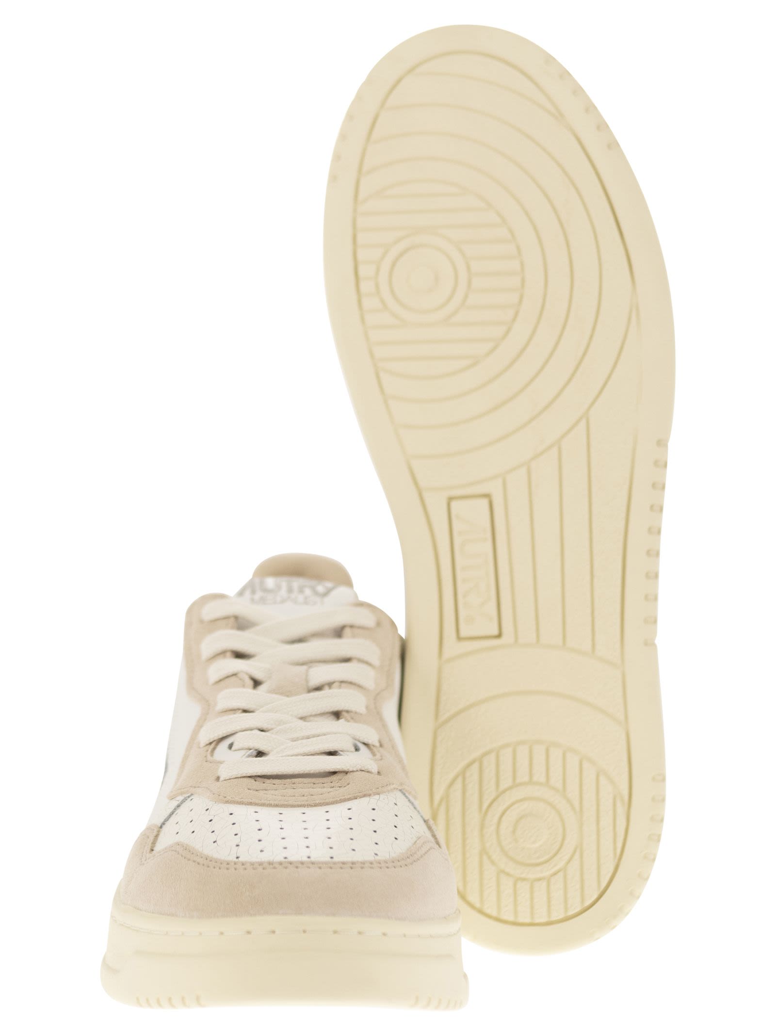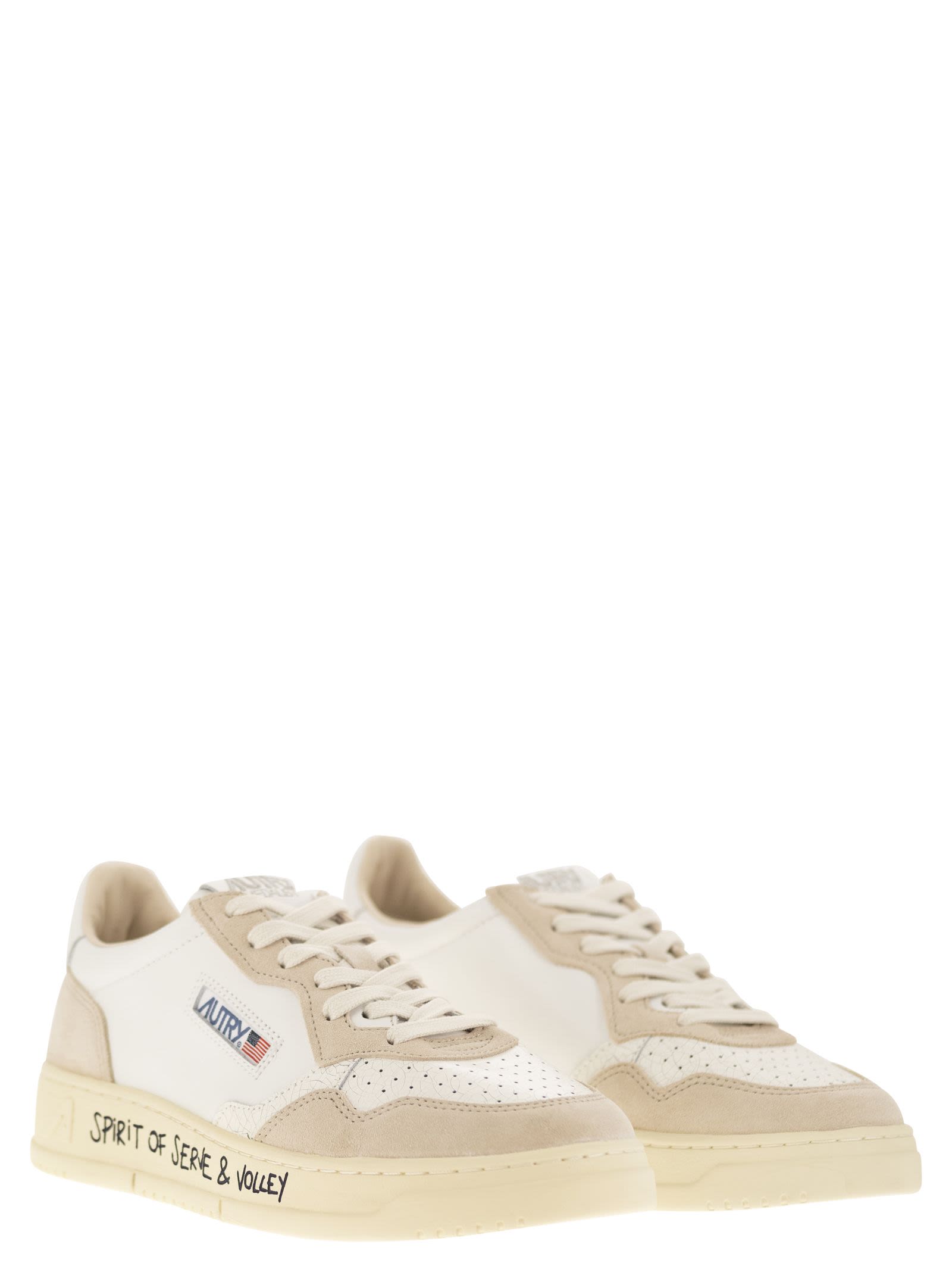 A timeless style: Autry Medalist is the shoe inspired by the vintage models of the 1980s, reinterpreted in a contemporary key. An unmistakable design made unique by the soft leather and suede upper and the iconic logo embossed on the back heel. - White leather upper with stitching that defines the multi-layered suede inserts - Perforated toe in cracked leather for breathability - Cotton flat laces - Leather tongue with foam padding and matching stitched label - Padded collar - Iconic tone-in-tone back heel with embossed logo - Leather and cotton terry lining - Logo-printed rubber sole with embossed 'Spirit of serve & volley' lettering DESIGNER ID: AULMVY01