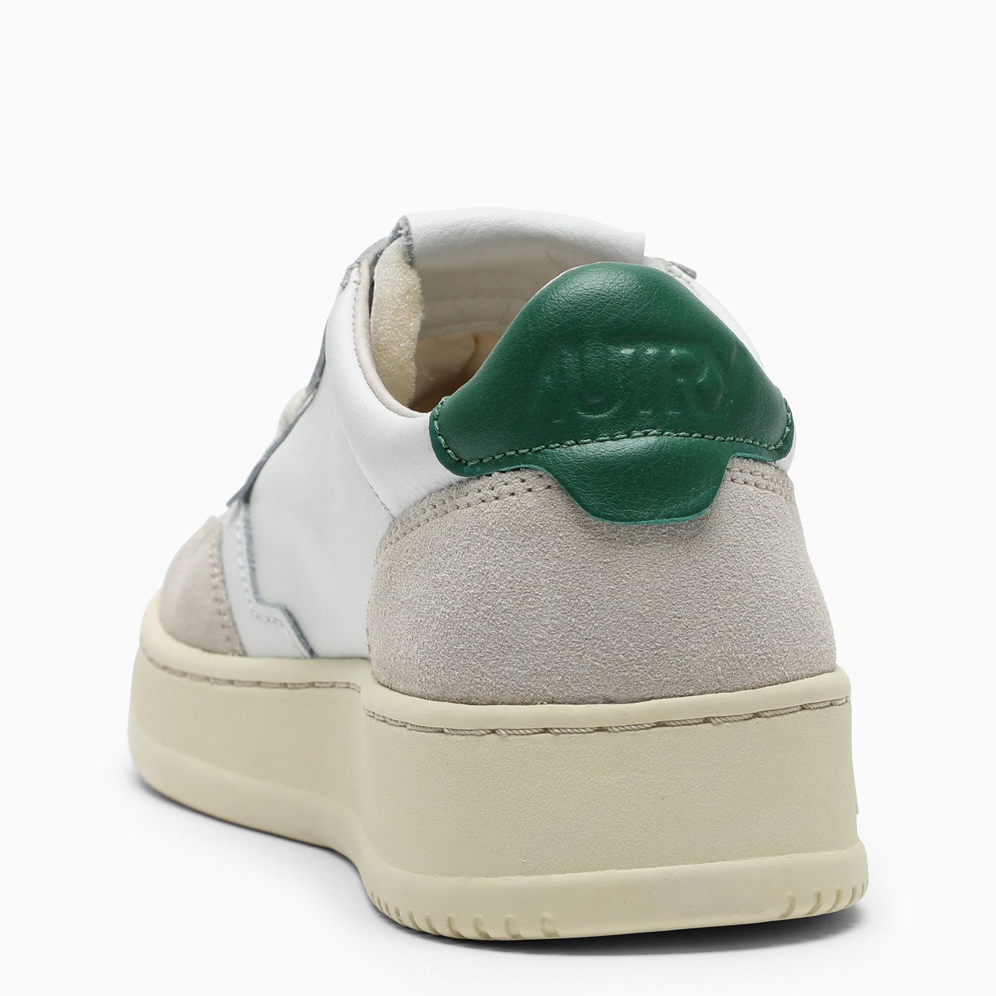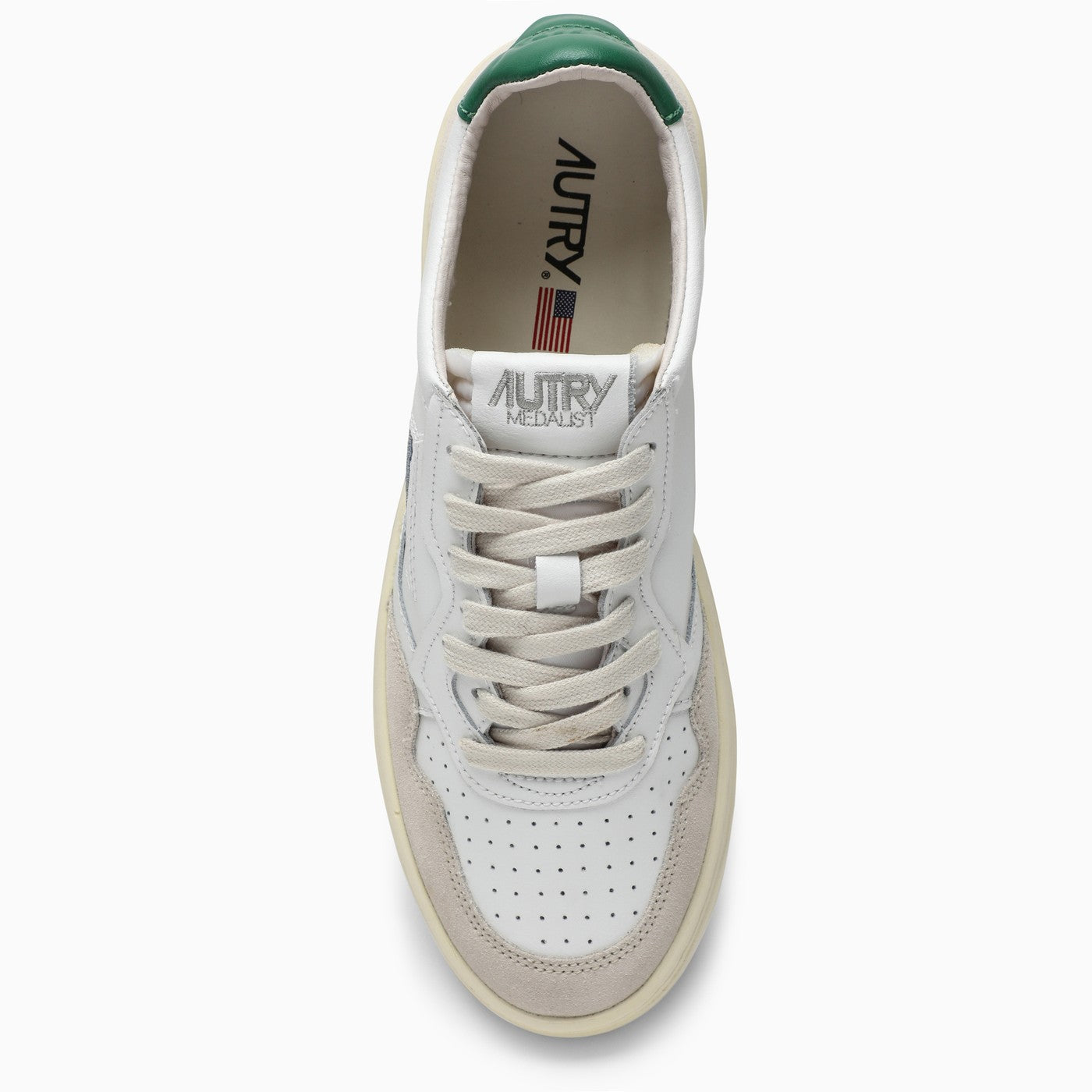 Medalist low-top sneakers by Autry in white leather and suede upper featuring perforated toe, front lace up fastening, tonal label seamed on a leather tongue, padded ankle collar, green back patch with embossed logo and cream rubber sole with logo.