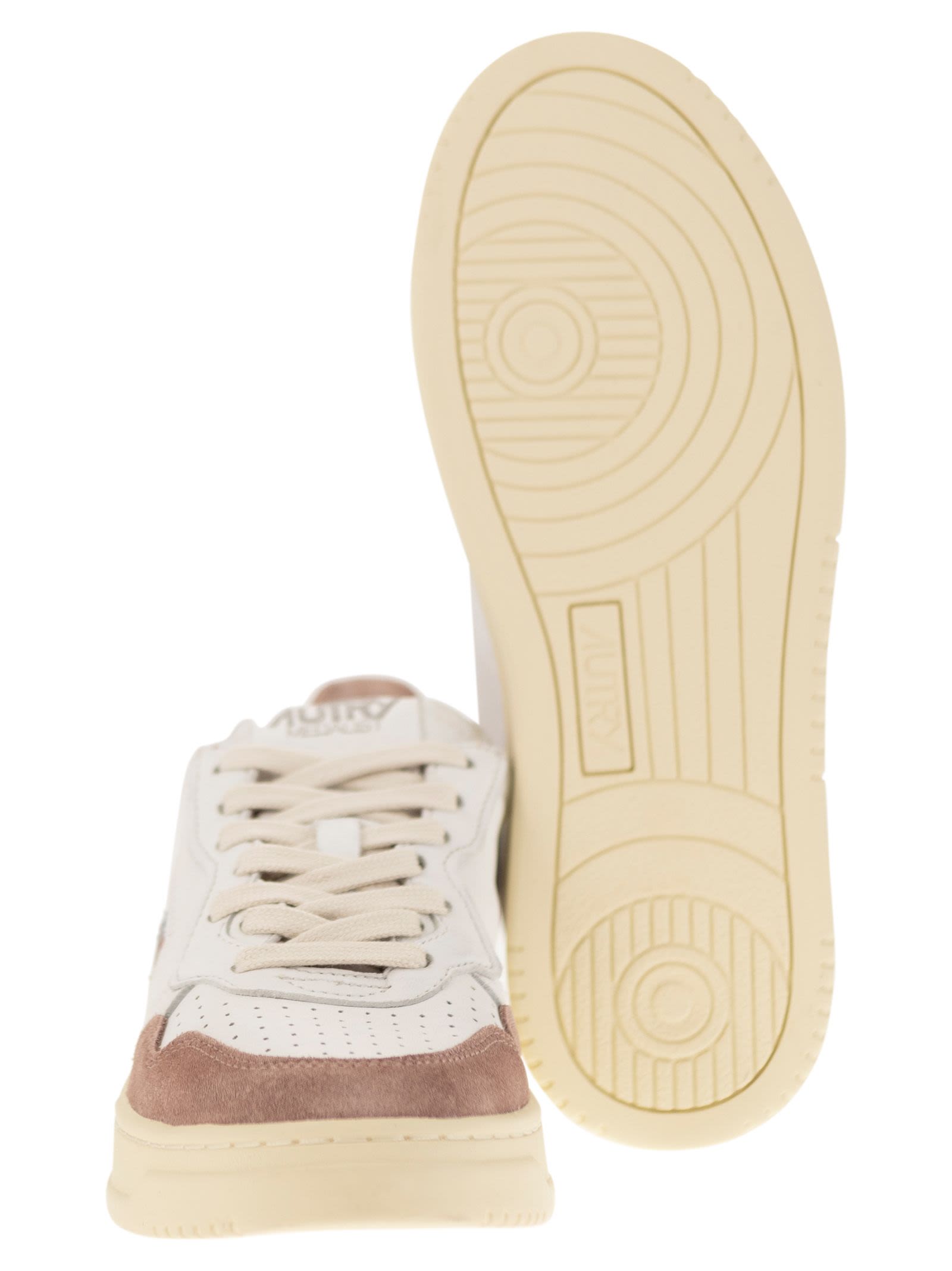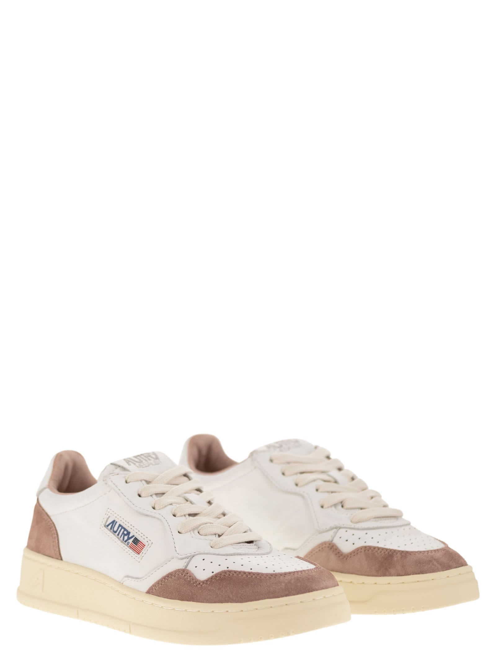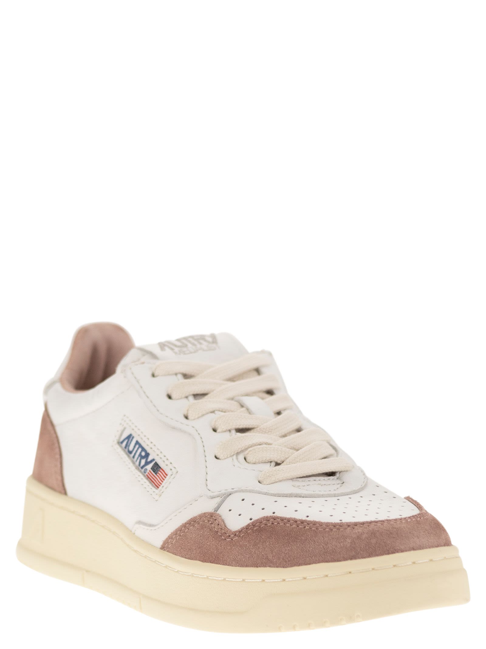 A timeless style: Autry Medalist is the shoe inspired by the vintage models of the 1980s, reinterpreted in a contemporary key. An unmistakable design made unique by the leather upper and the iconic logo embossed on the back heel. Low women's trainer inspired by vintage 1980s models. Leather upper Perforated toe for breathability Cotton flat laces Fabric tongue with tone-on-tone stitched label Padded collar Iconic back heel with embossed logo Leather and cotton terry lining Logo-embossed leather insole, raised 2 cm Tone-matched logoed rubber sole DESIGNER ID: AULWGS28