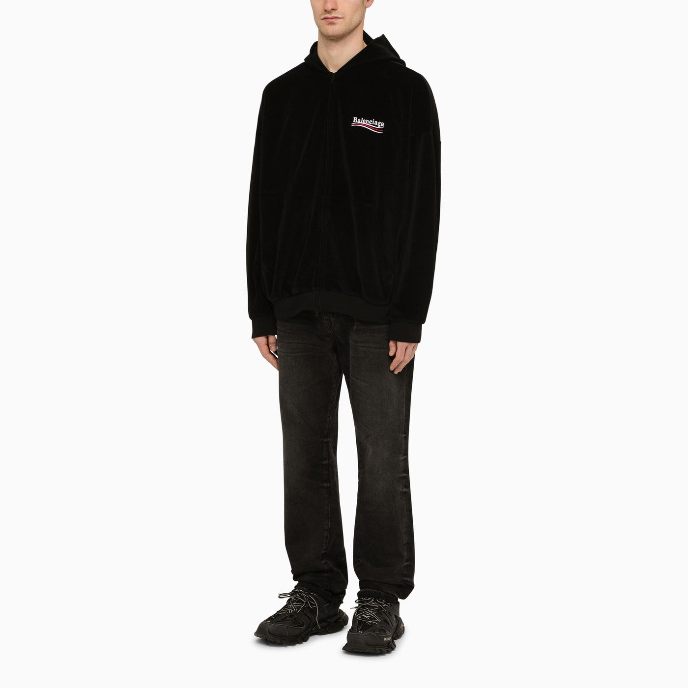 Black cotton-blend Balenciaga hoodie featuring long sleeves, Political Campaign embroidery on the chest and back, double zip front fastening and side pockets.