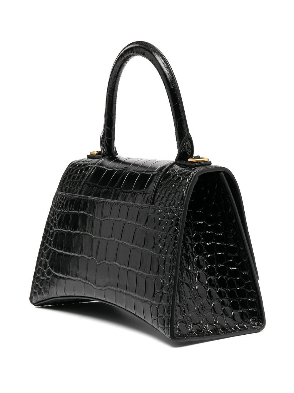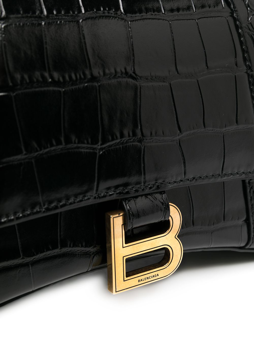 Black leather crocodile effect tote bag from Balenciaga featuring crocodile effect, logo plaque, gold-tone hardware, foldover top with magnetic fastening, single rounded top handle, thin strap, main compartment, internal logo stamp, internal zip pocket and patent finish.