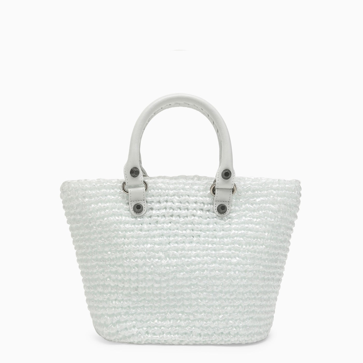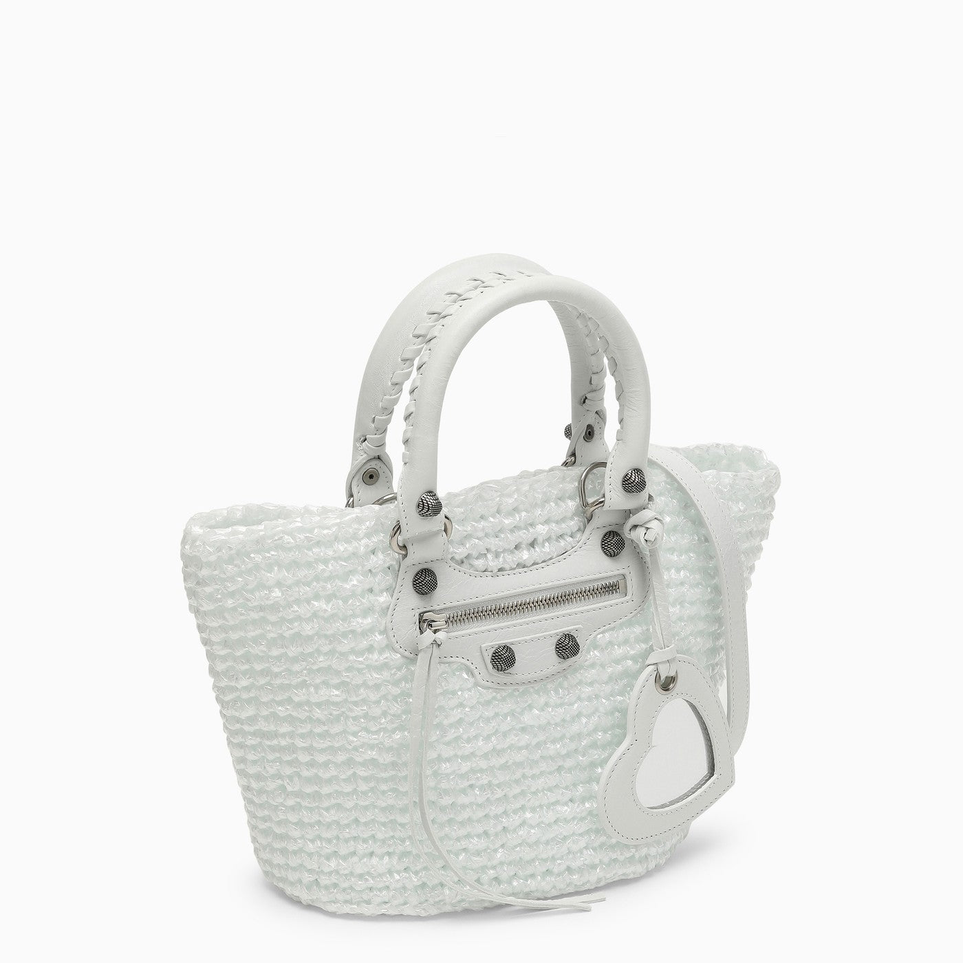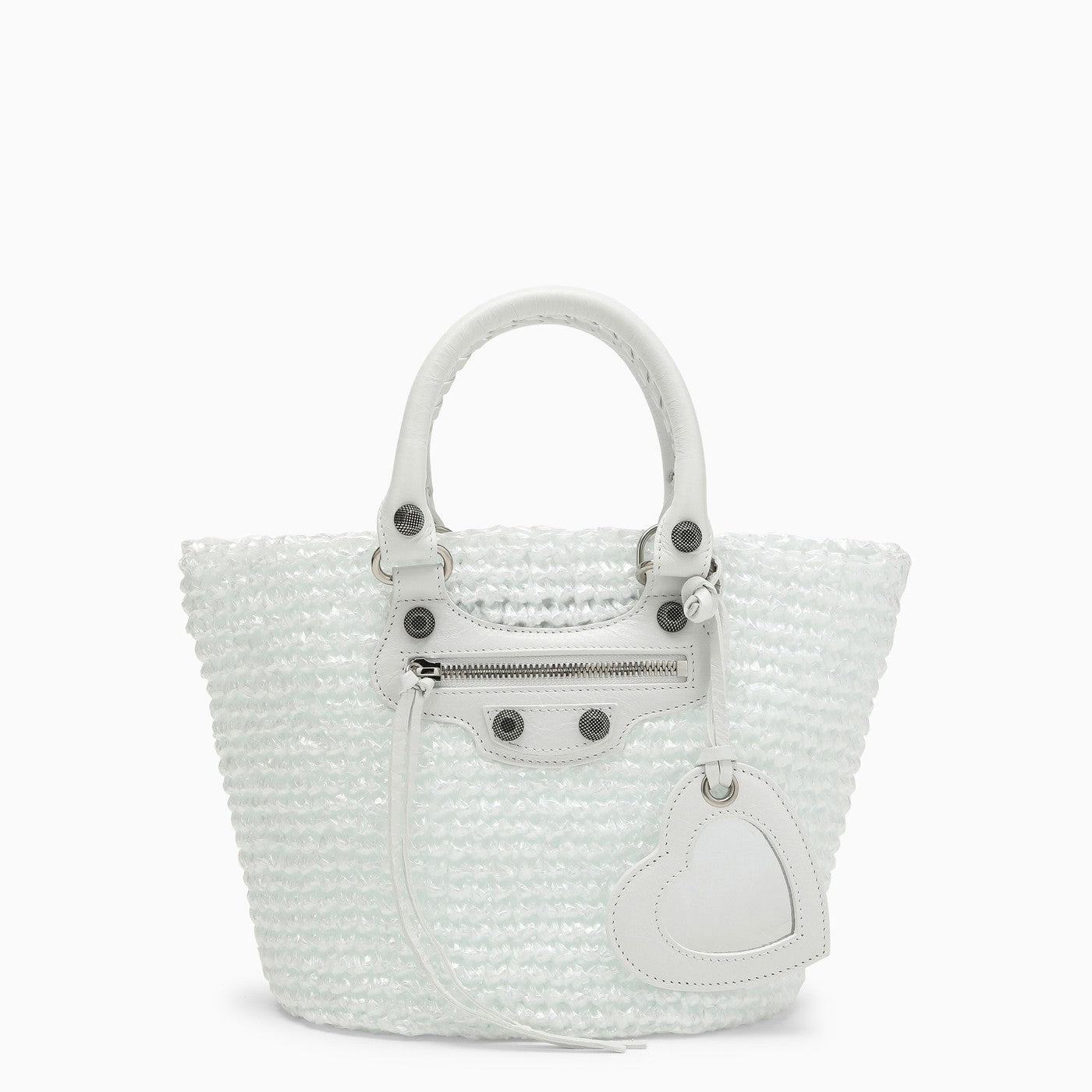 Small bucket bag by Balenciaga made of transparent woven nylon with a white raffia effect, featuring two top handles, a front zip pocket, a removable heart mirror with tone-on-tone logo and antiqued silver hardware.