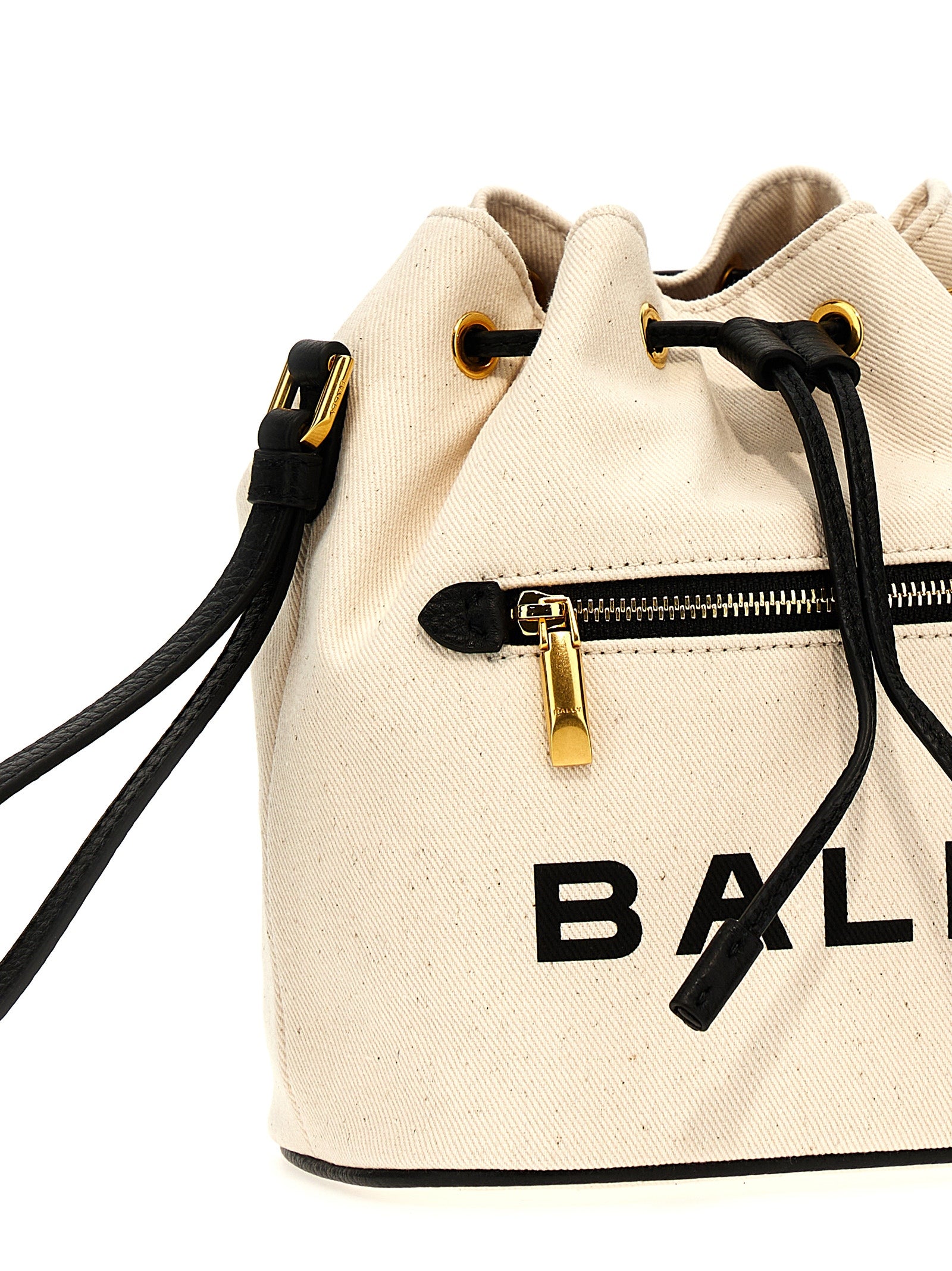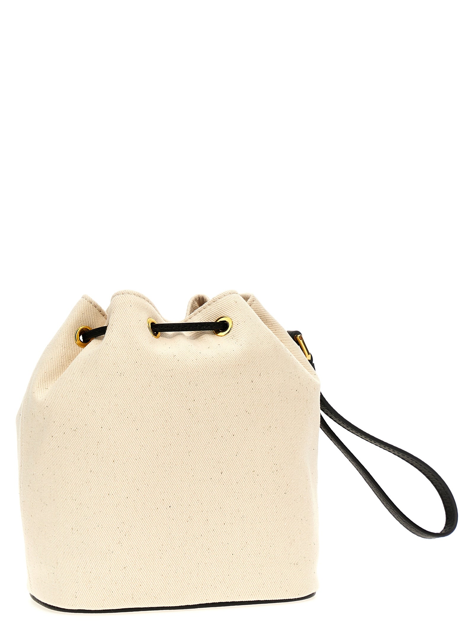 'Bar Mini' canvas bucket bag with logo print, leather details, adjustable shoulder strap.