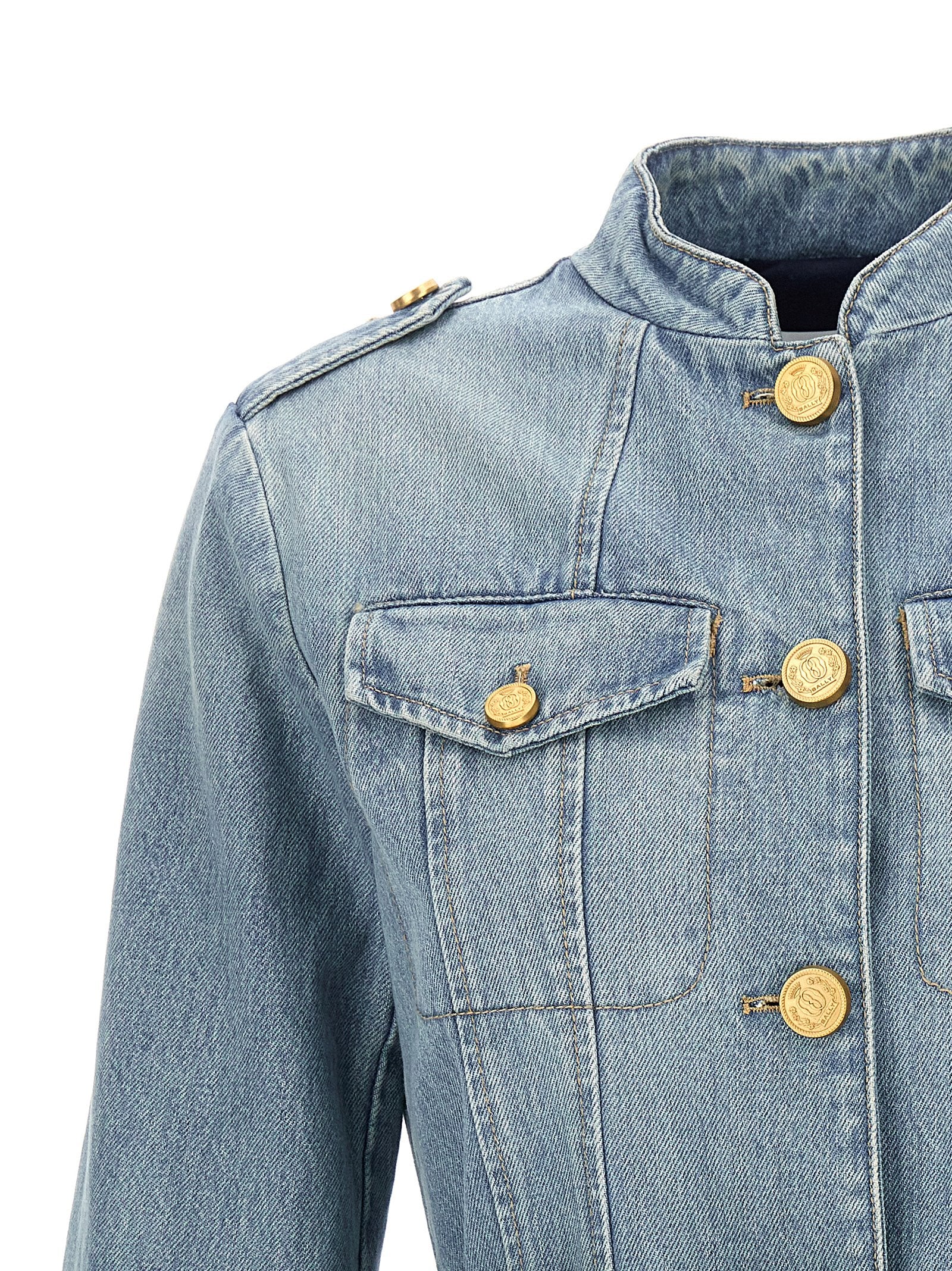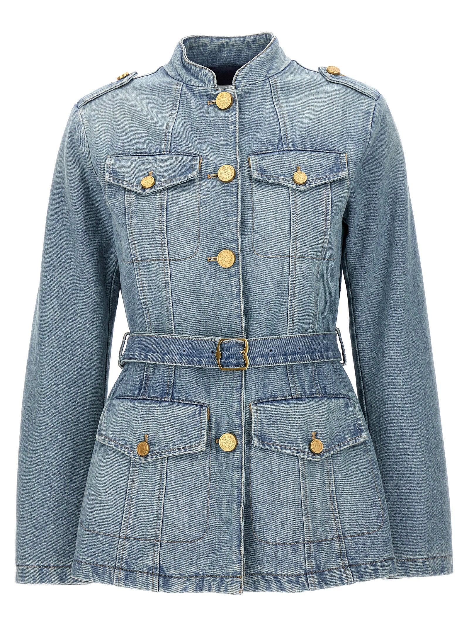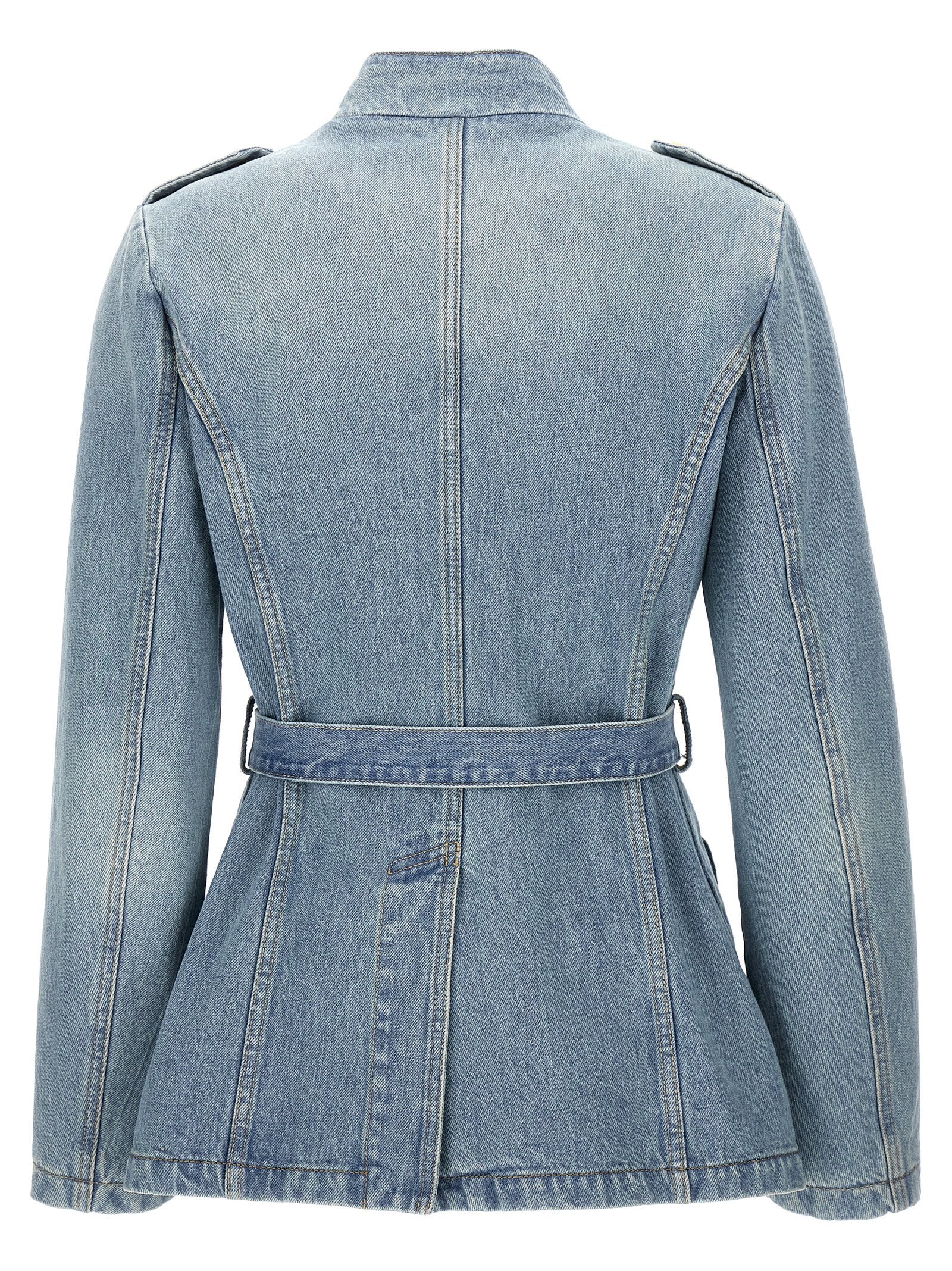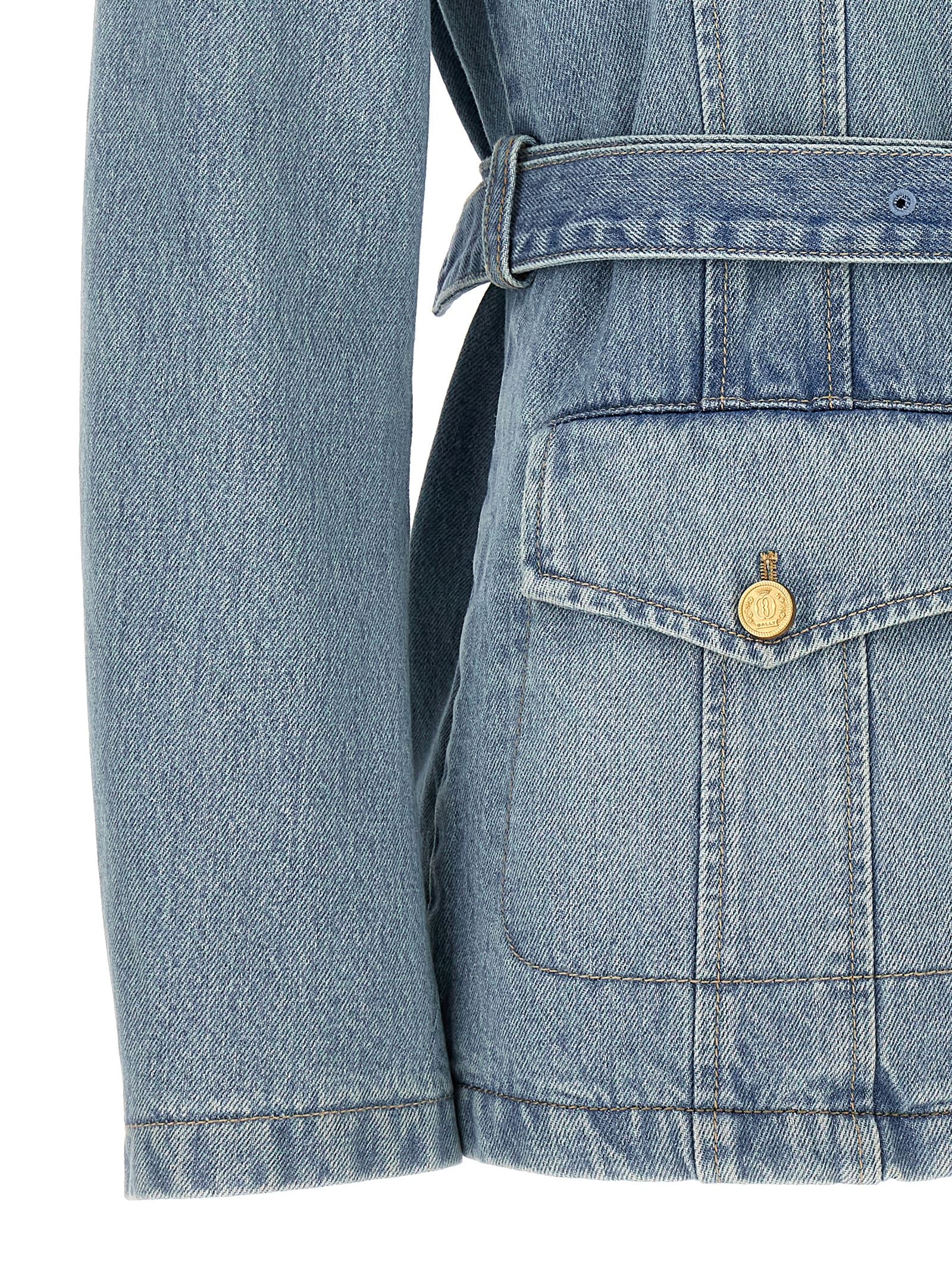 Cotton denim jacket with button closure, belt at the waist, pockets, long sleeves.