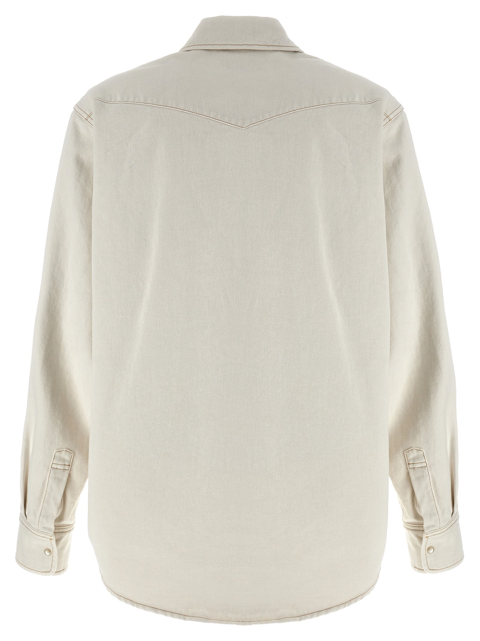 Denim shirt with mother-of-pearl snap button closure and chest pockets.
