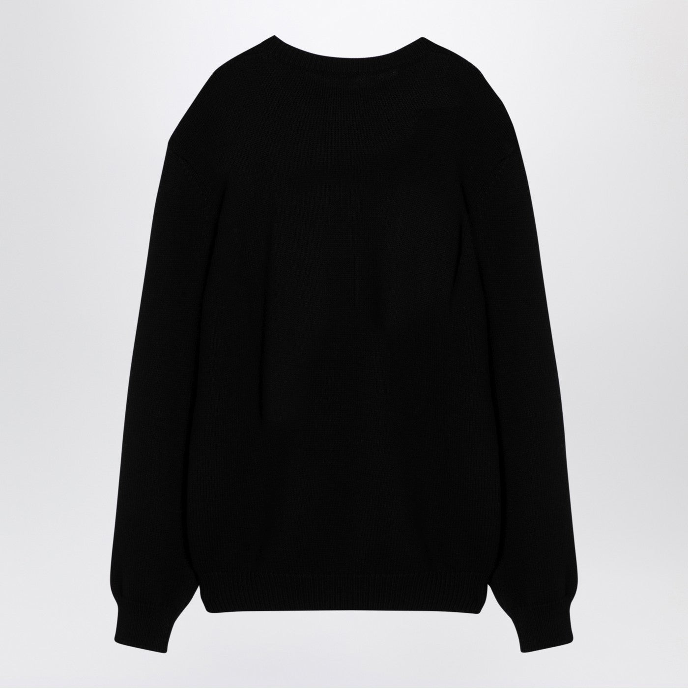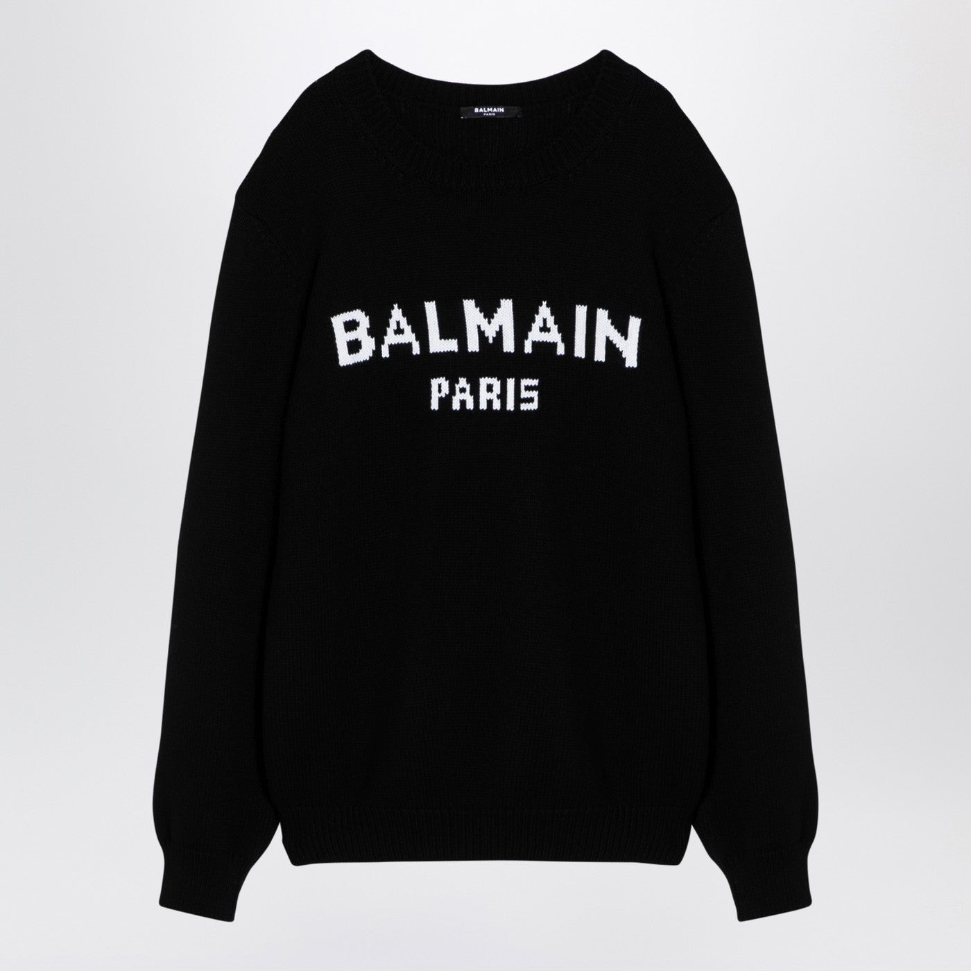 Black wool blend crew-neck sweater from Balmain featuring long sleeves, ribbed hems, contrasting inlaid lettering logo on the front and straight hem.