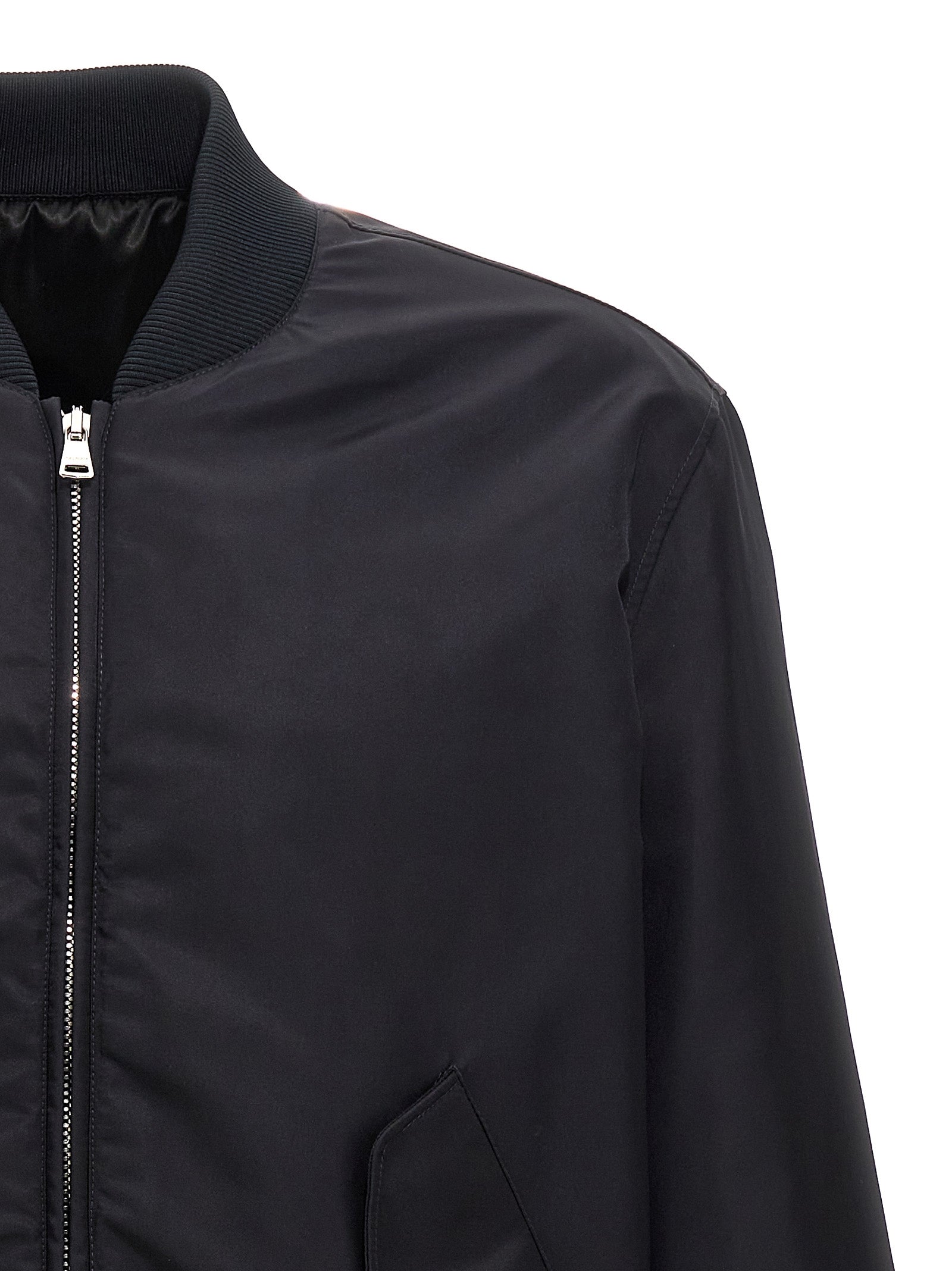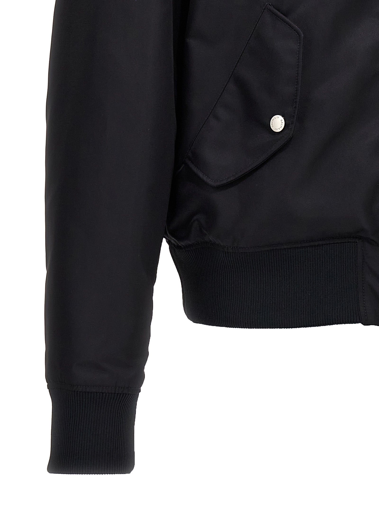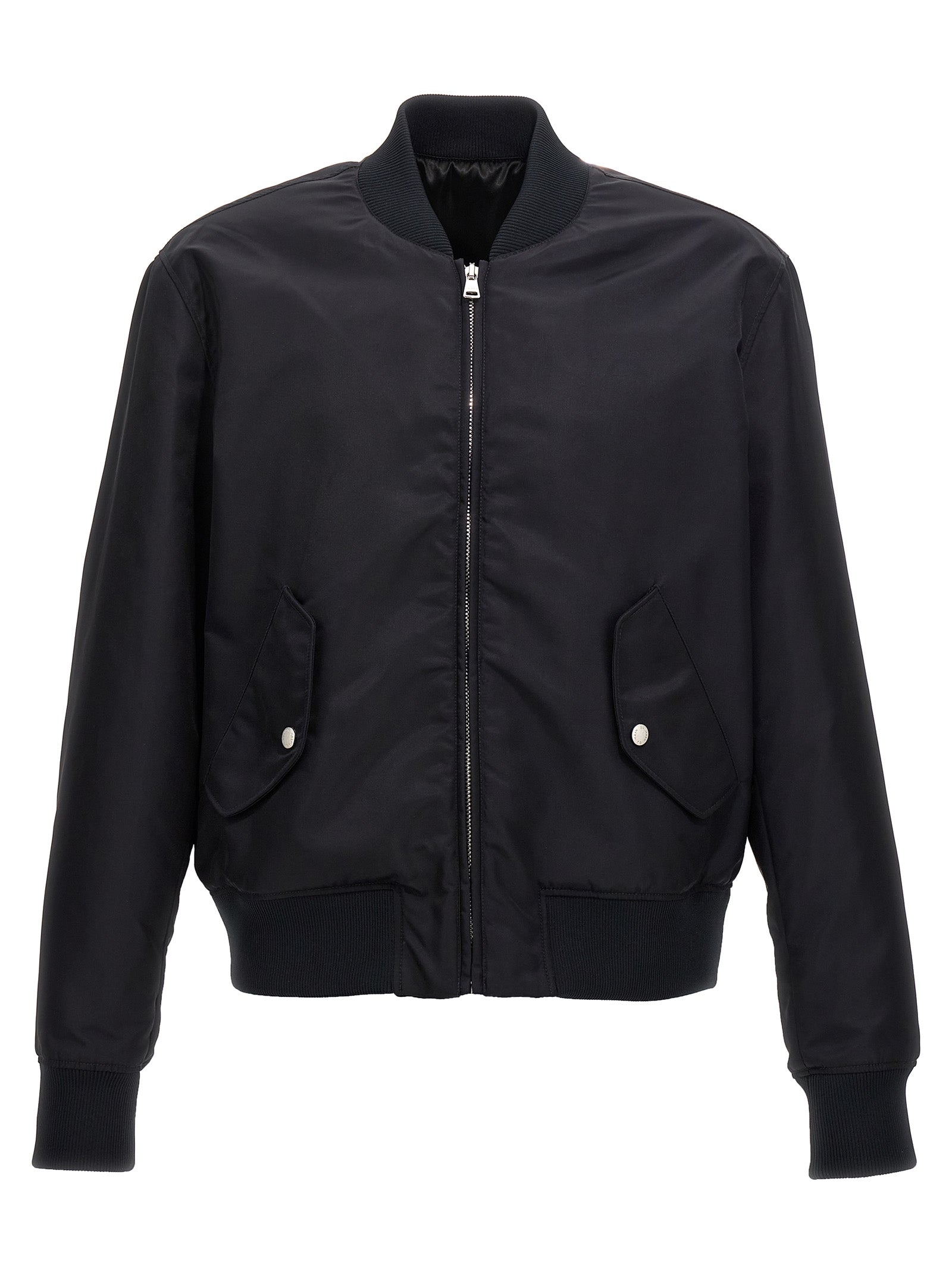 Nylon bomber jacket with logo embroidery on the back, front zip closure, button pockets, long cuffed sleeves.