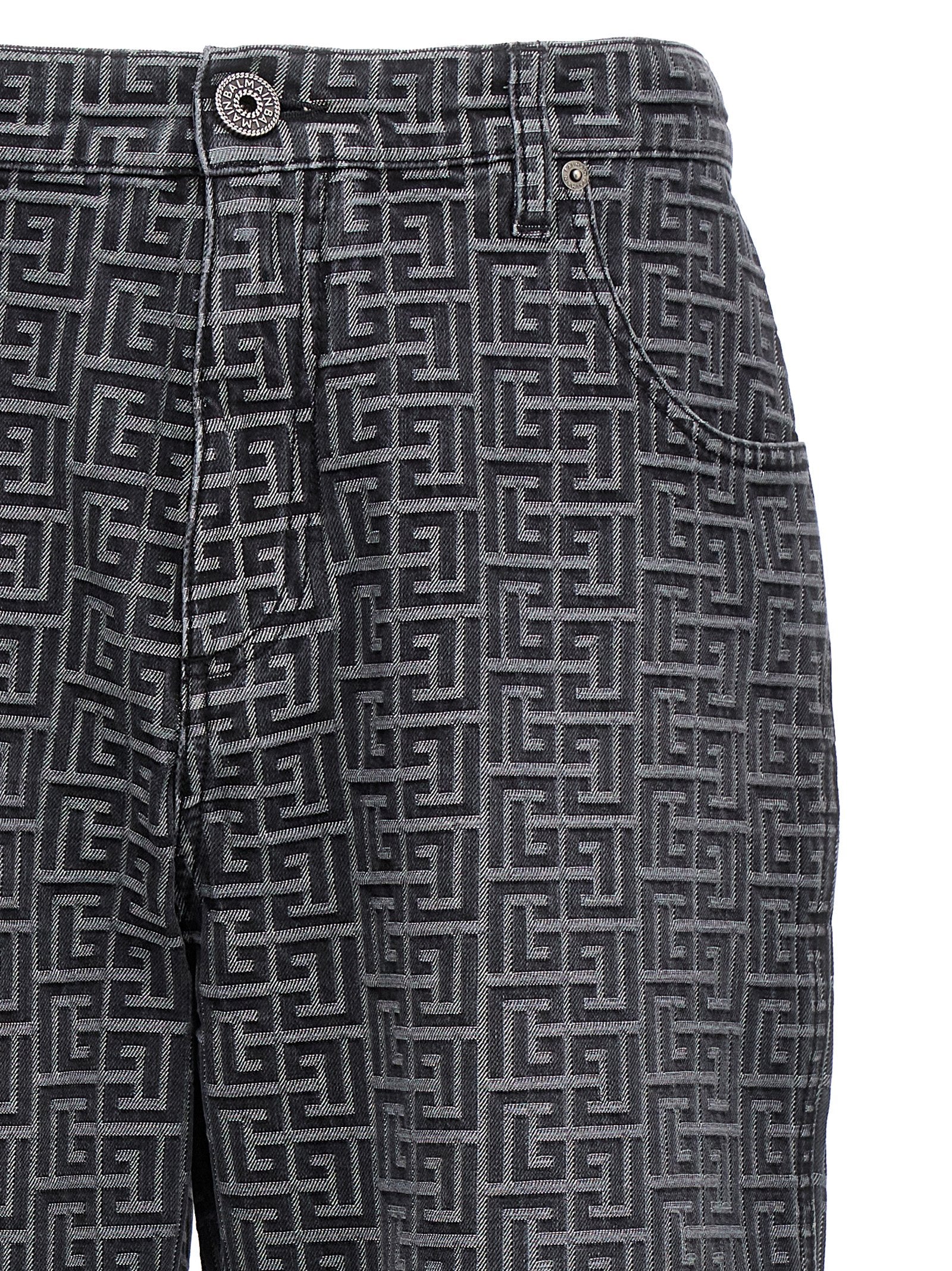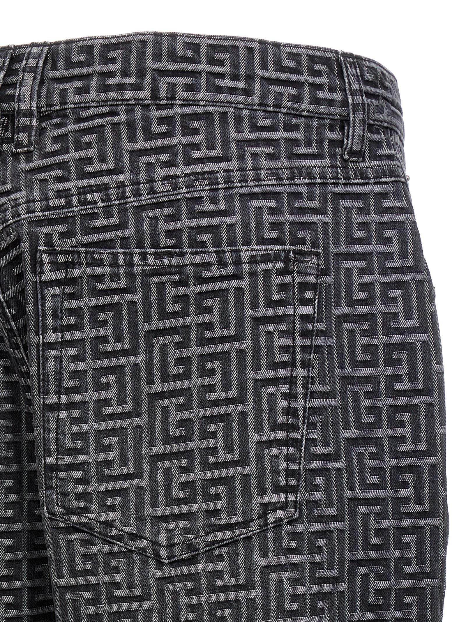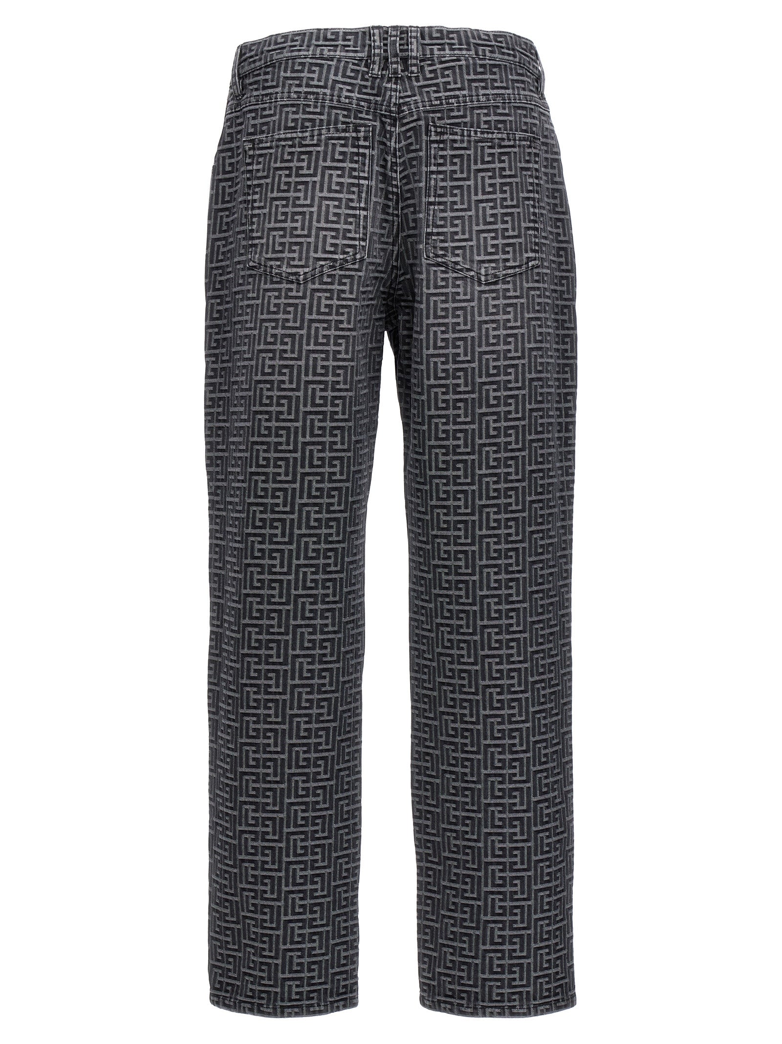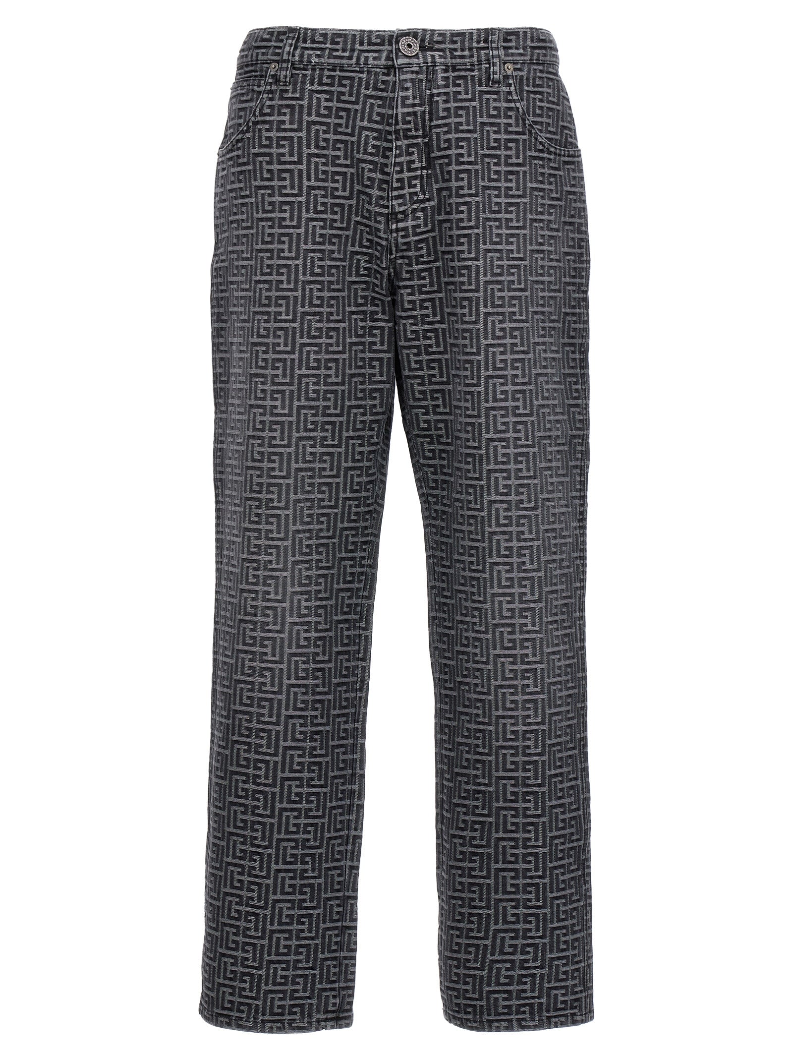 Cotton denim jeans with all-over logo pattern, zip and button closure and five pockets.