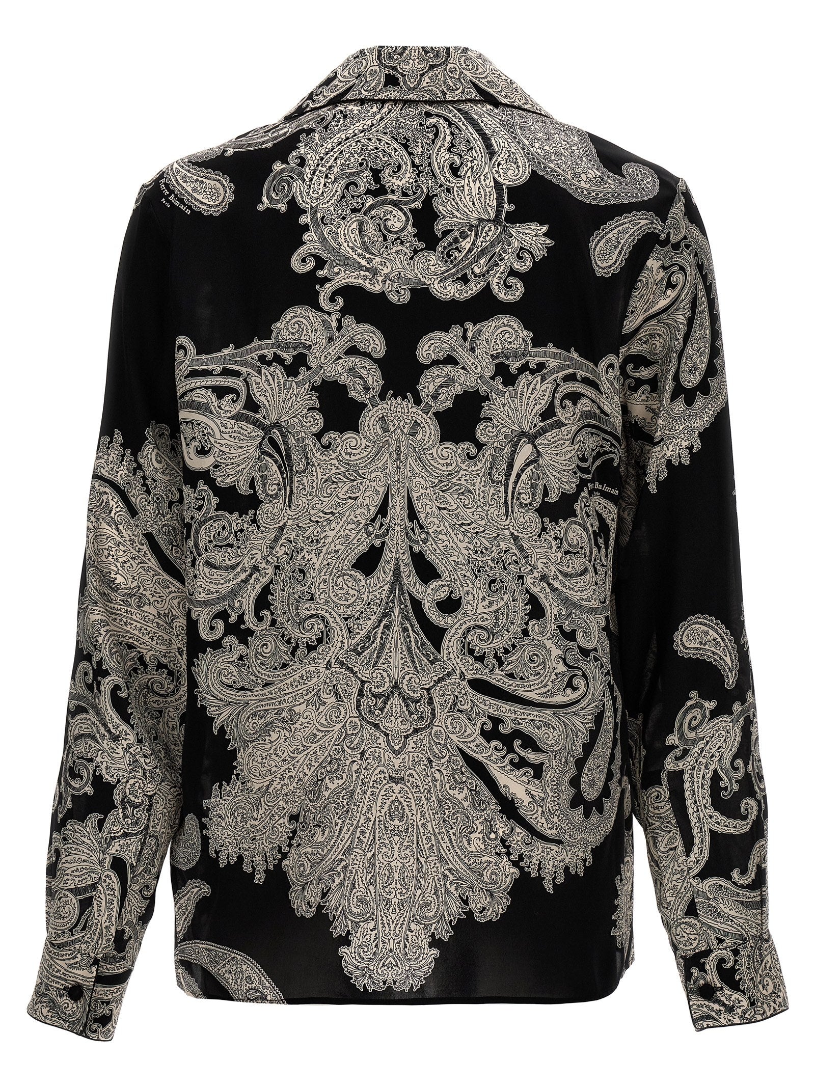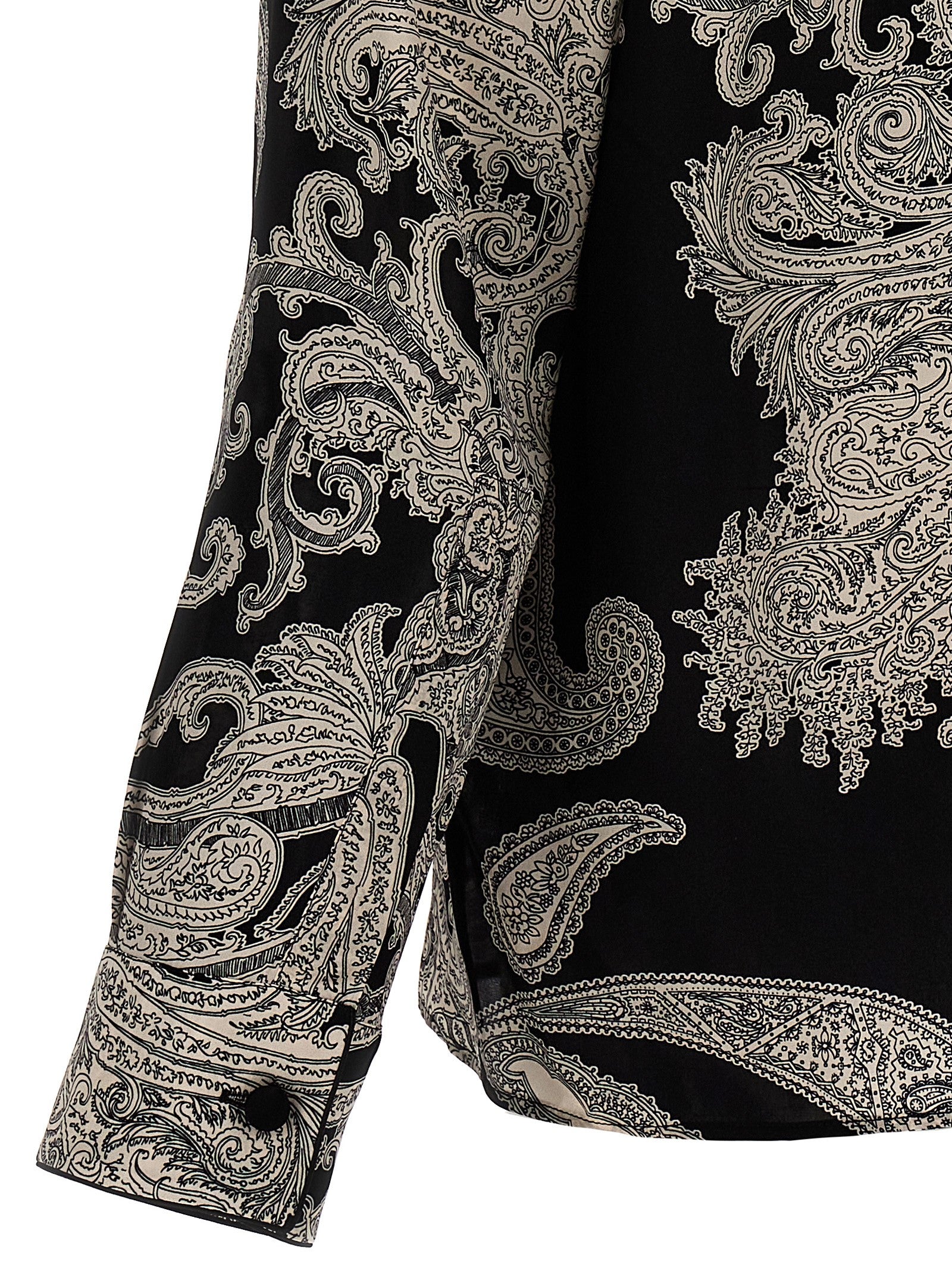 Silk shirt with paisley print, contrast pajama-style conpiping and a silk button closure.