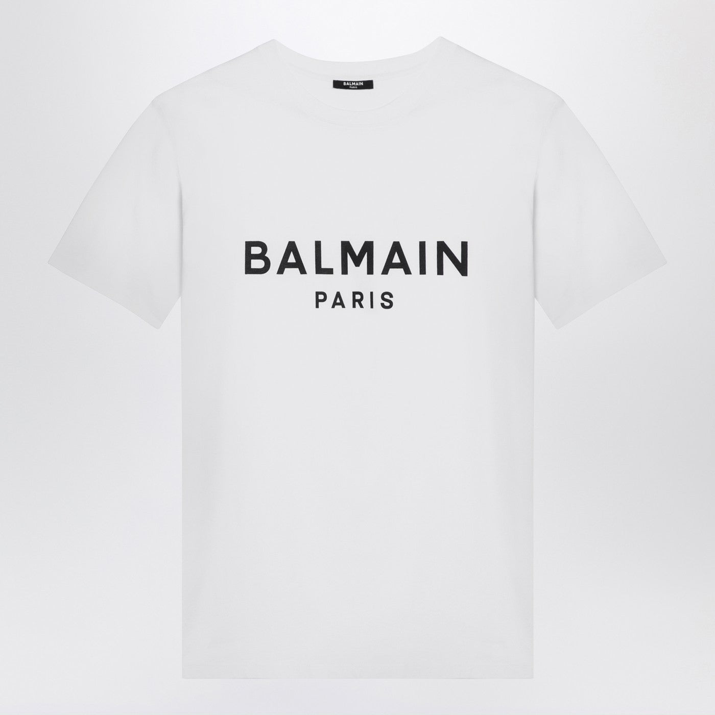 White cotton Balmain crew-neck T-shirt featuring short sleeves, contrasting front lettering logo and straight hem.