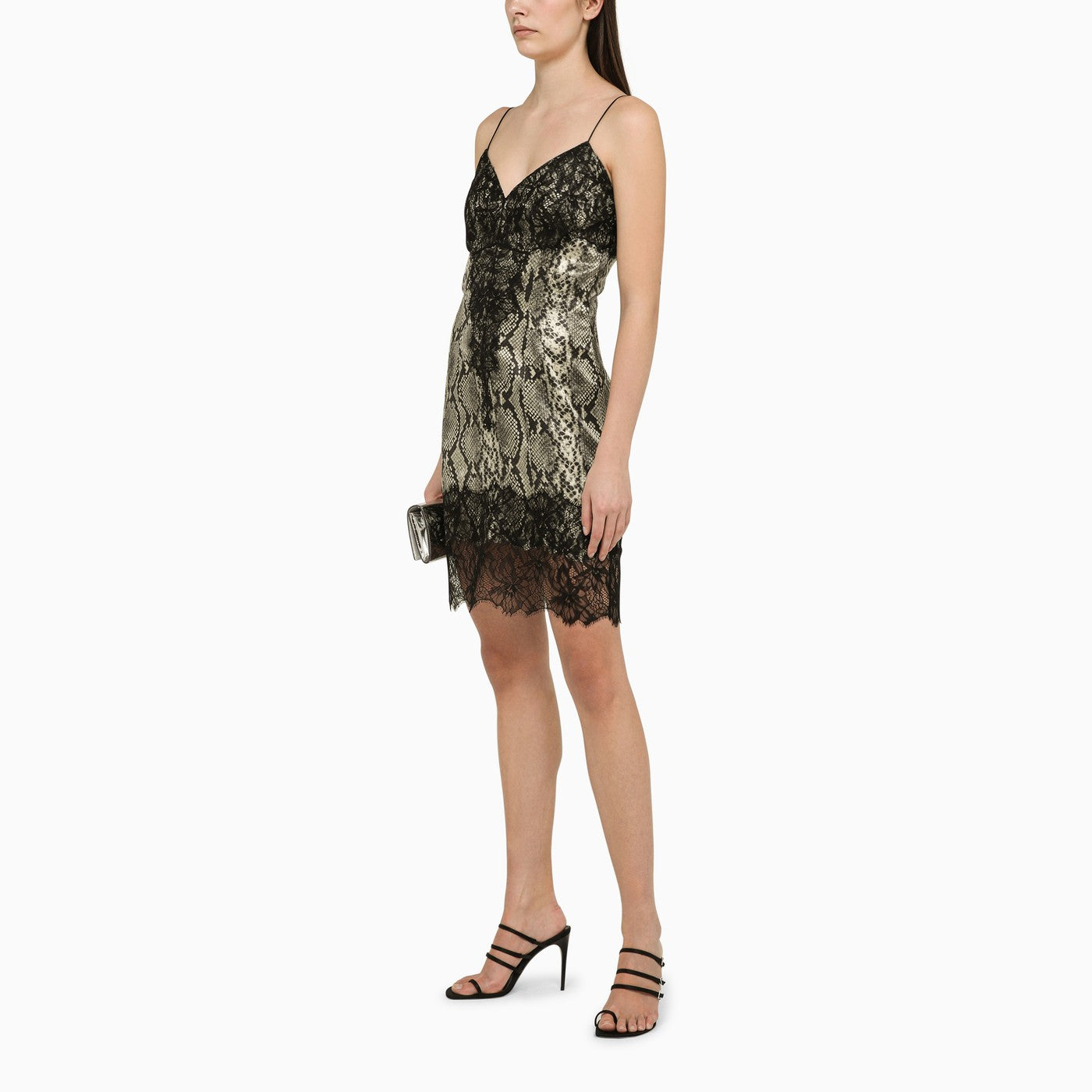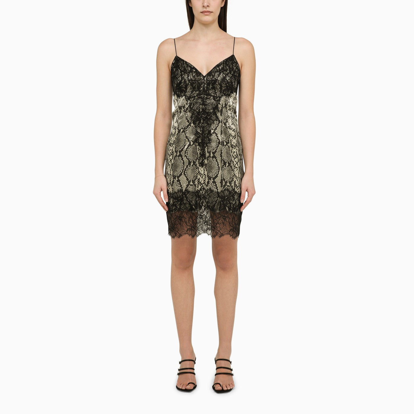 Silk dress by Balmain featuring a python-effect print embellished with contrasting lace, featuring thin straps, a V-neck, a side slit and a slim fit.