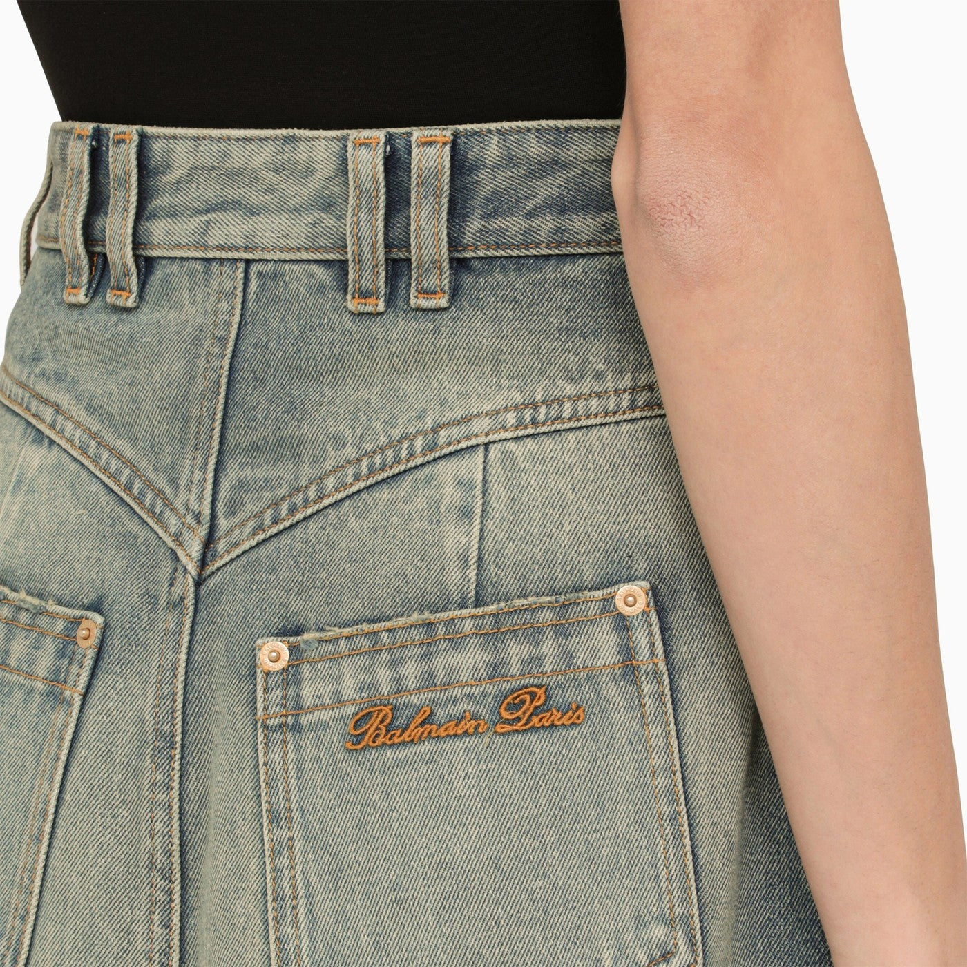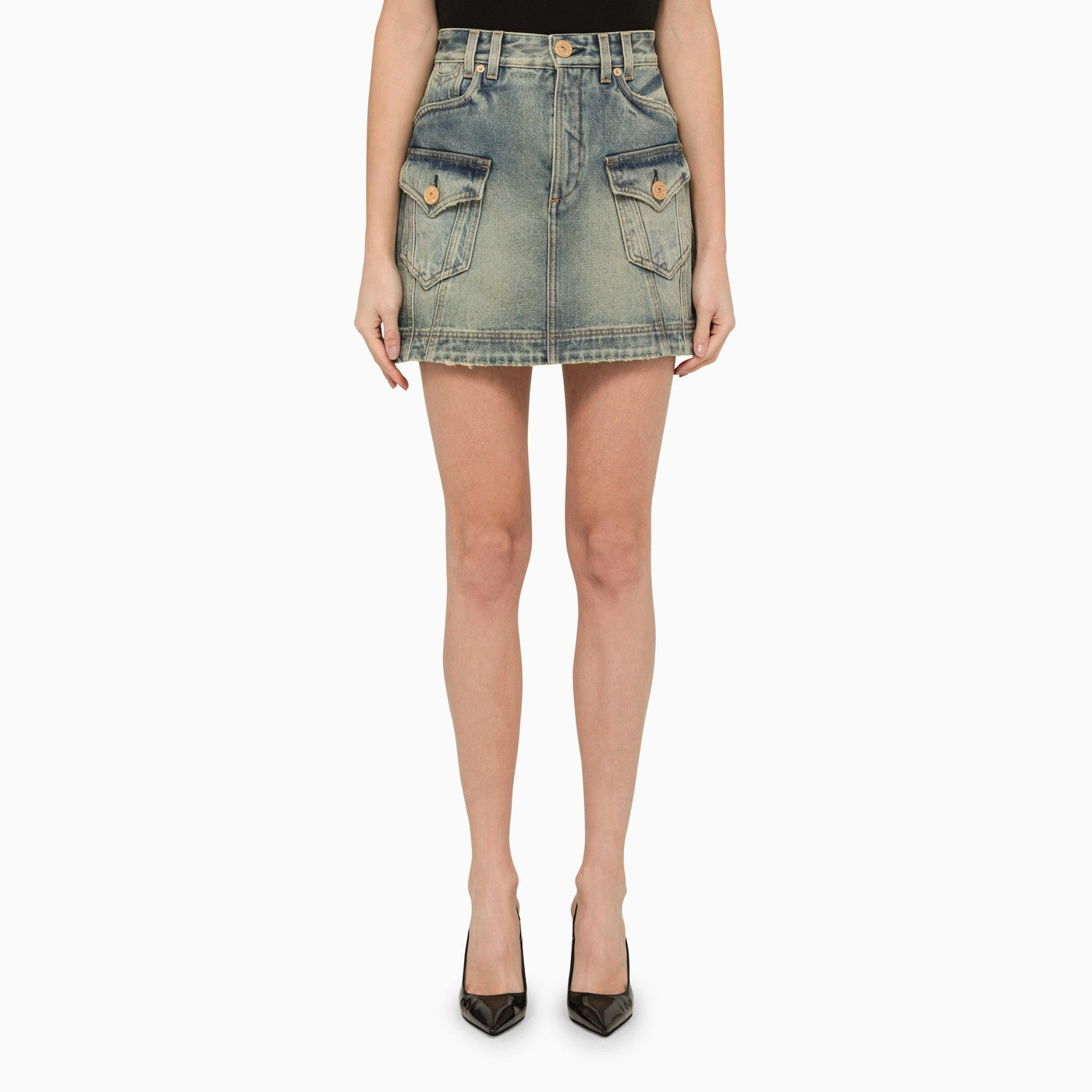 Blue washed-effect cotton denim miniskirt from Balmain featuring a front zip and button fastening, belt loops at the waist, five classic pockets, two front patch pockets with decorative gold-tone buttons and a back logo.