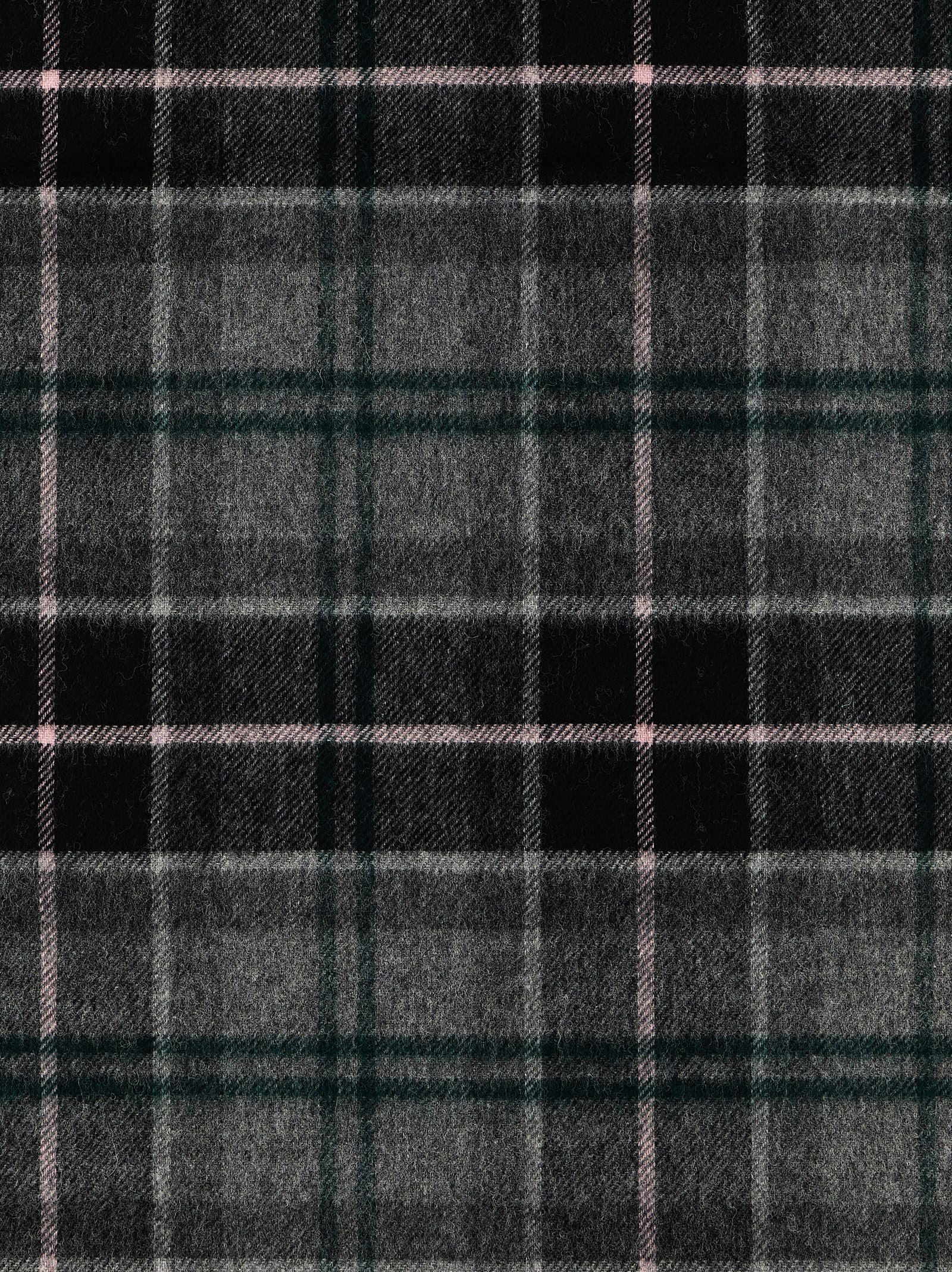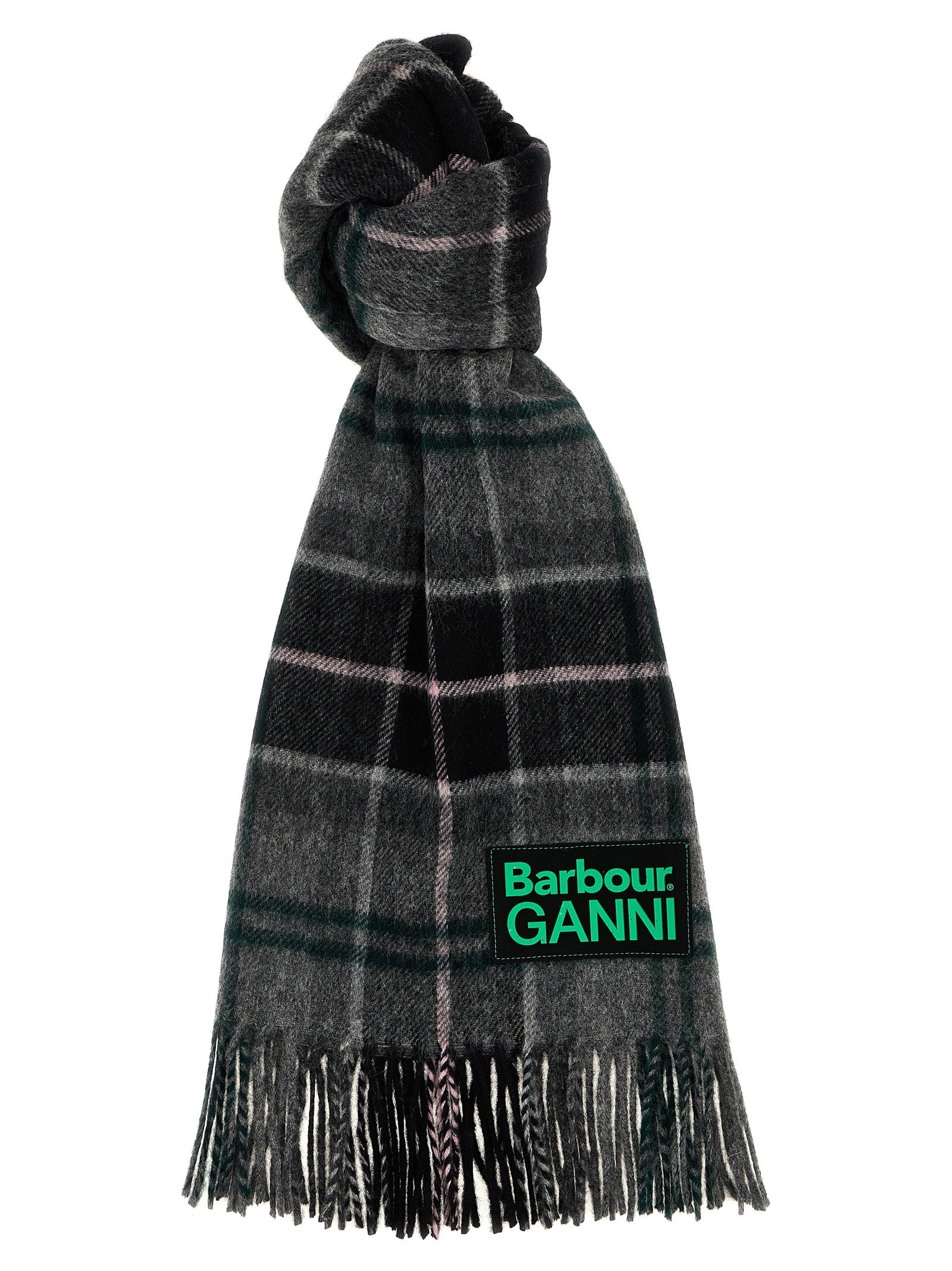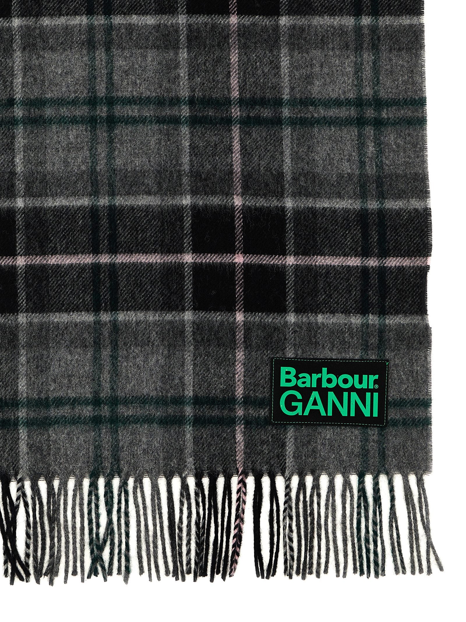 Barbour x GANNI scarf in tartan print wool, logo patch, fringed edges. SUSTAINABLE: product made with recycled materials and/or organic cotton.