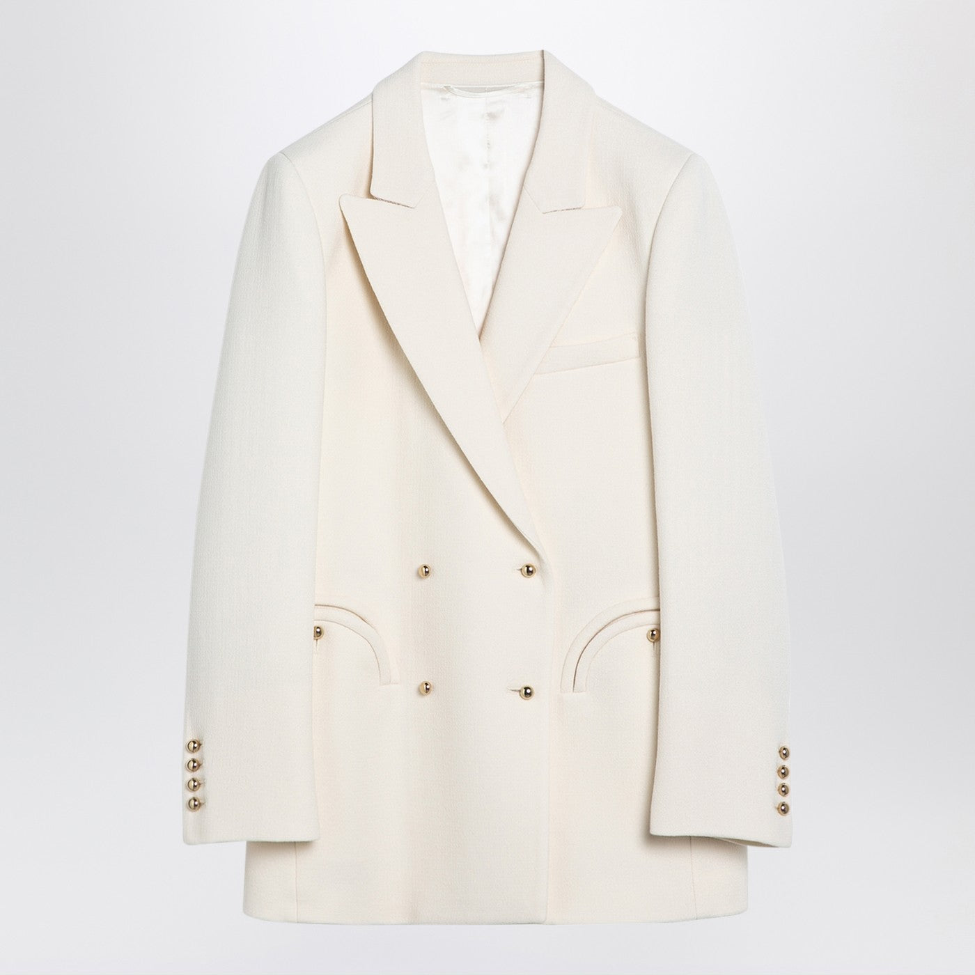 Cream-coloured virgin wool jacket by Blazè Milano. Double-breasted design featuring a front fastening with gold-tone spherical buttons, long sleeves, buttoned cuffs, peaked lapels and three welt pockets on the front.