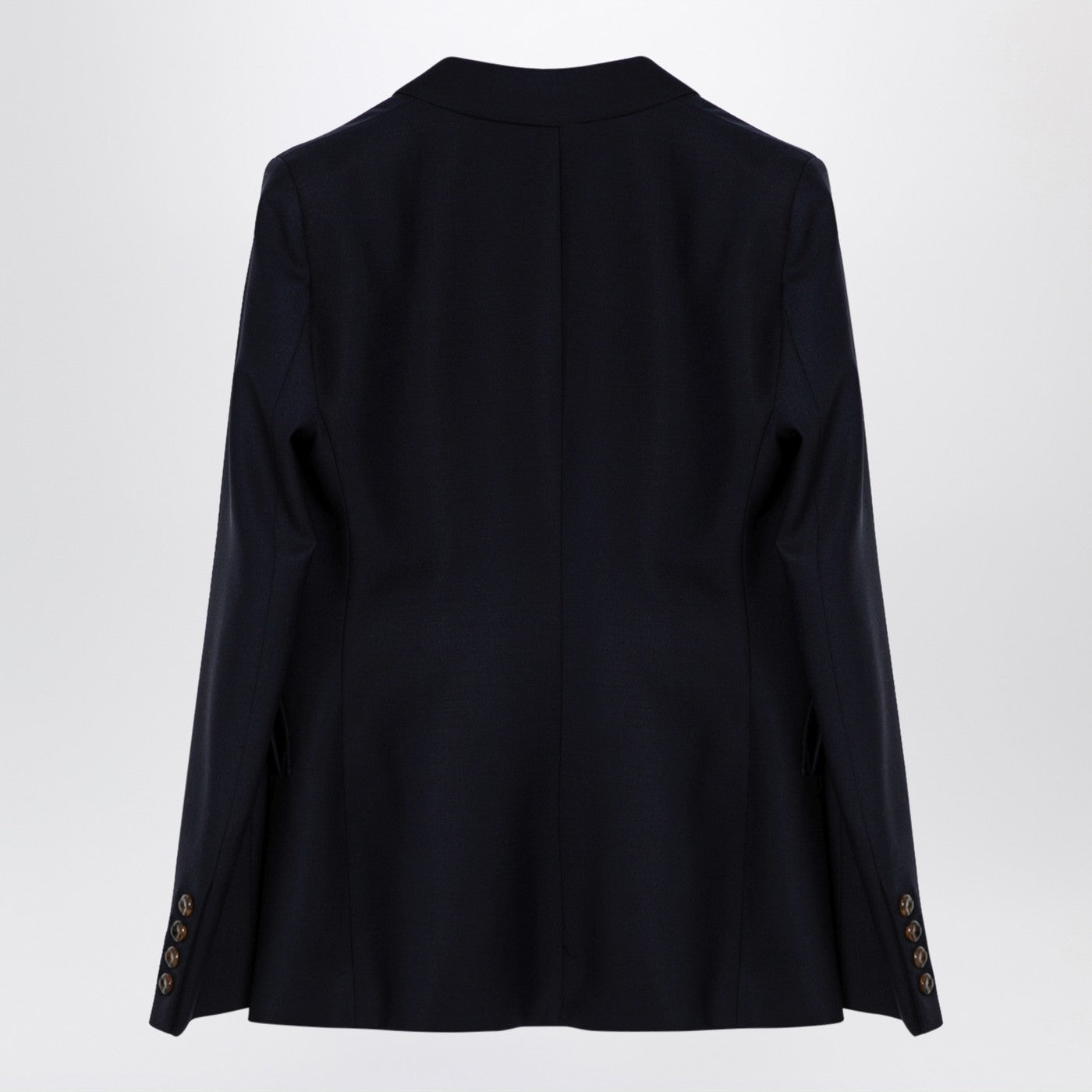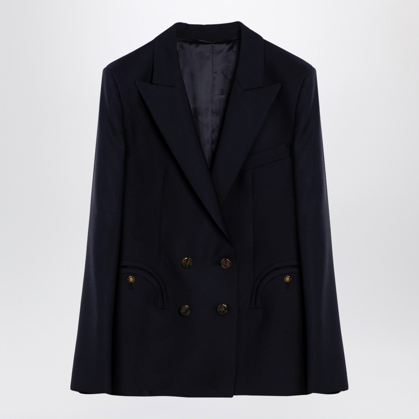 Navy blue virgin wool blend jacket by Blazè Milano. Double-breasted design featuring a front button fastening, long sleeves, buttoned cuffs, peaked lapels and three welt pockets on the front.