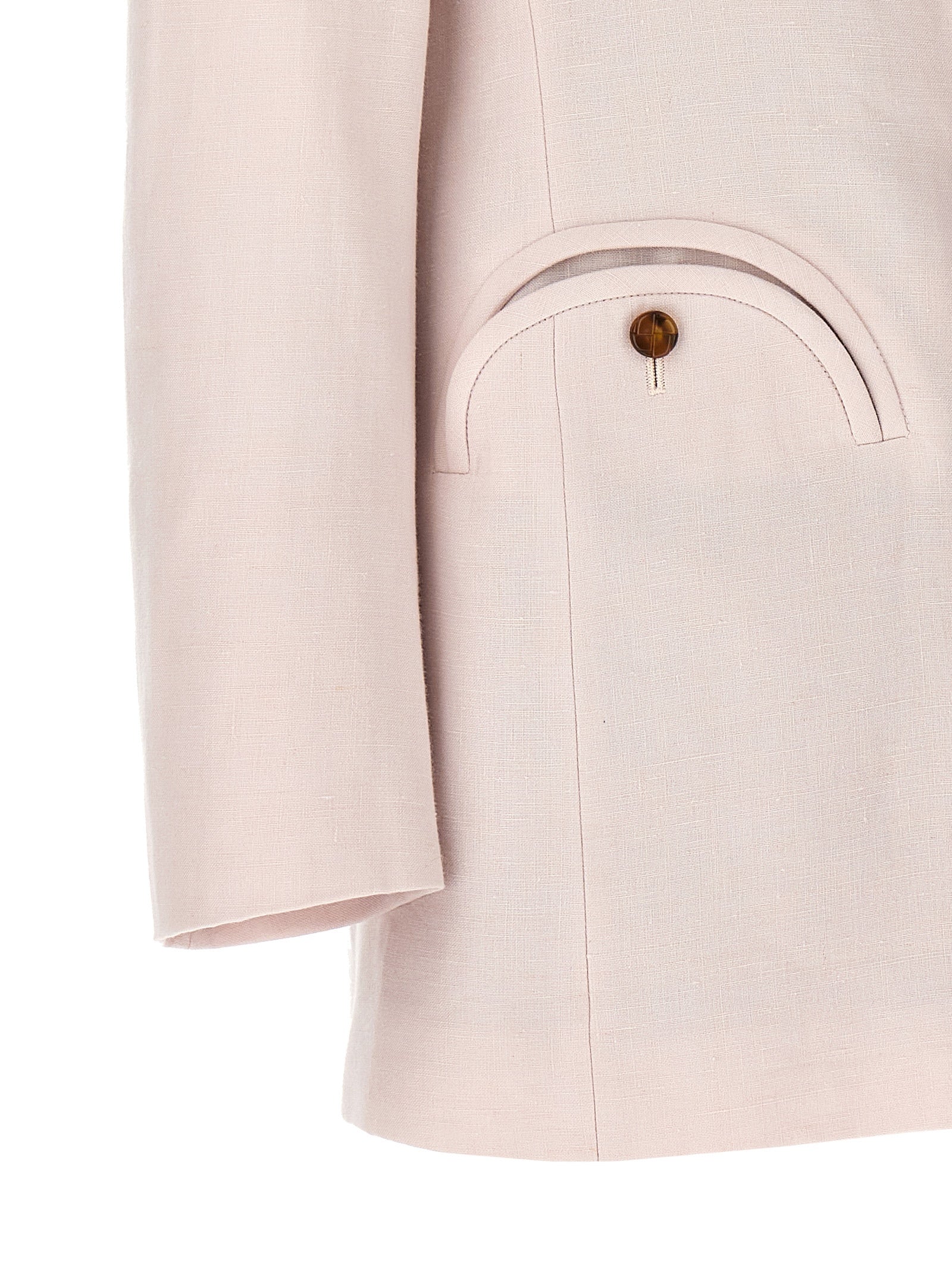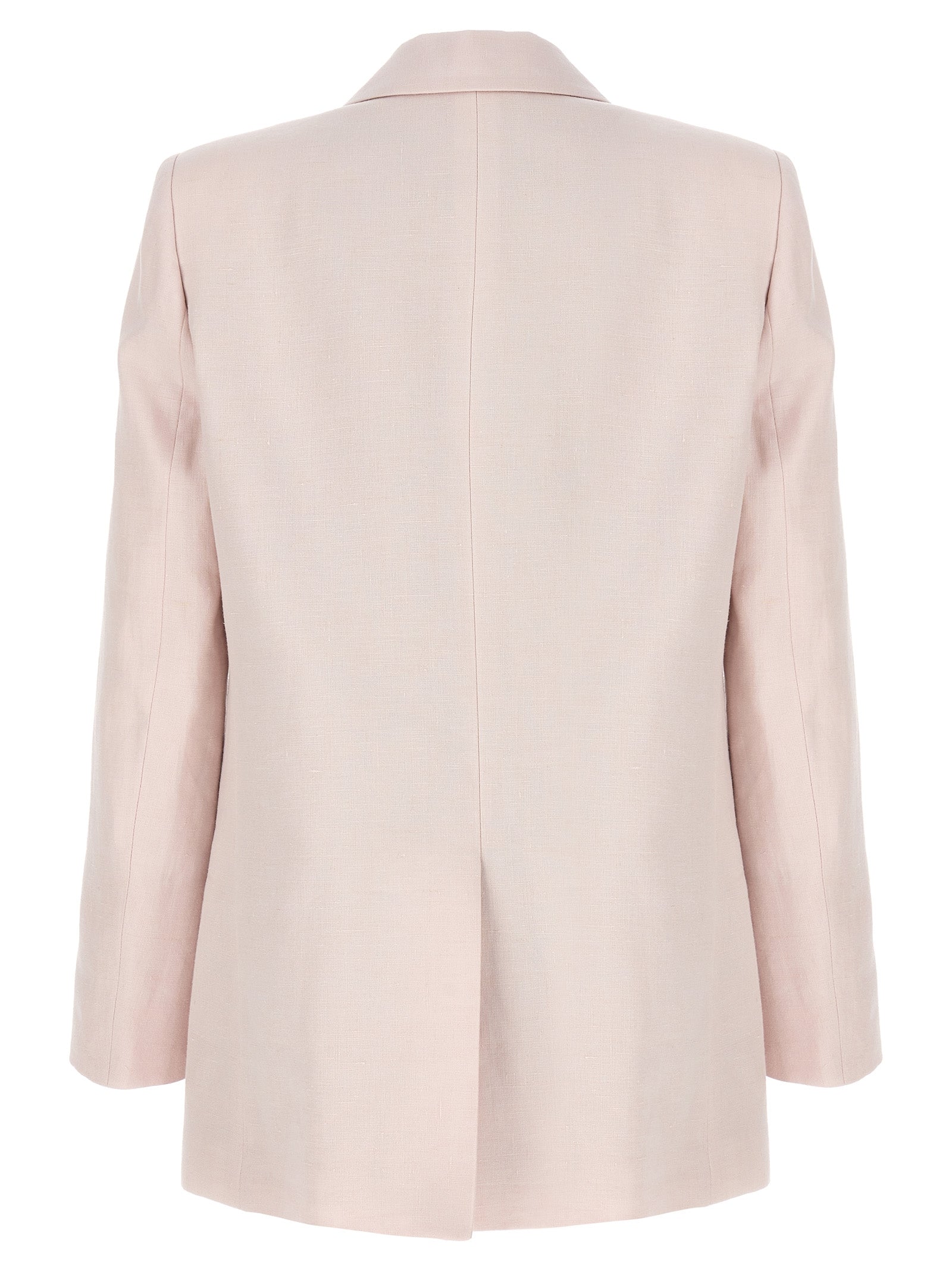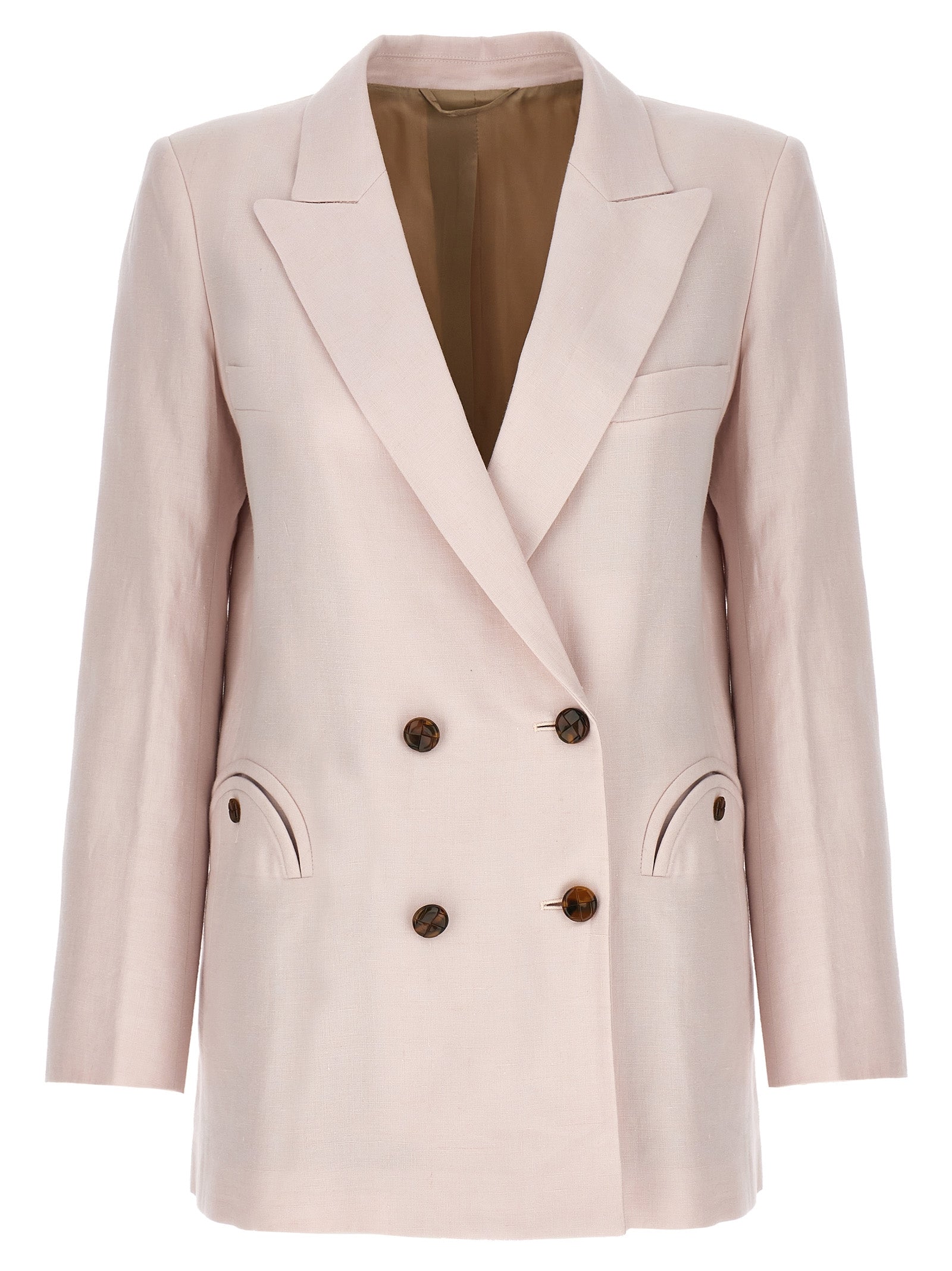 'Midday sun' double-breasted linen blazer with contrast button closure, peak lapels, padded shoulders, pockets and fully lined.