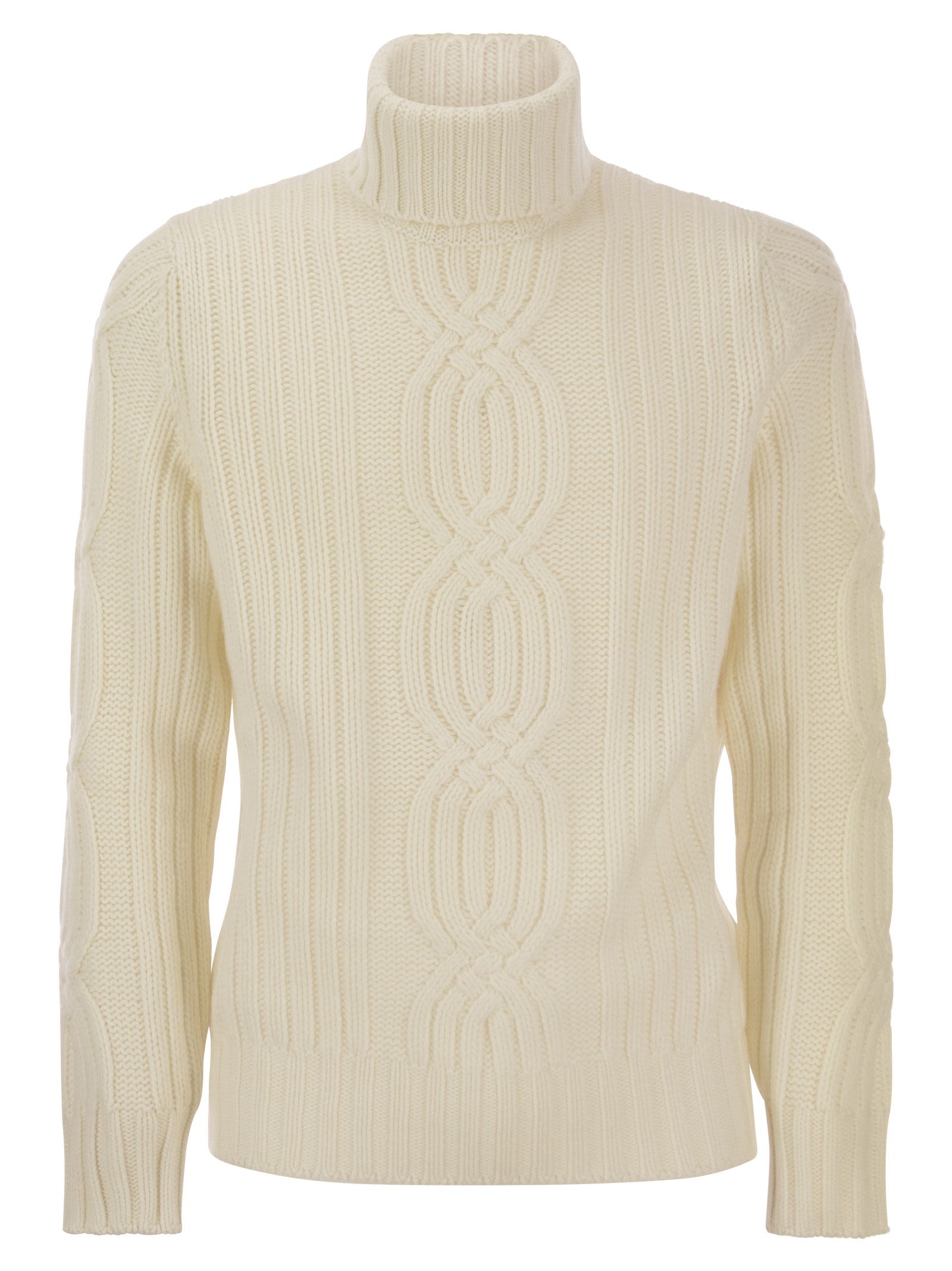 The classic taste of the cable-knit sweater is enriched by the fine materials of Brunello Cucinelli. The pure cashmere yarn, with its balanced weight, gives the garment a warm taste that is ideal for interpreting the cold season. - High ribbed crew neck - Ribbed knit cuffs and hem - Braided knit DESIGNER ID: M22300003 C2723