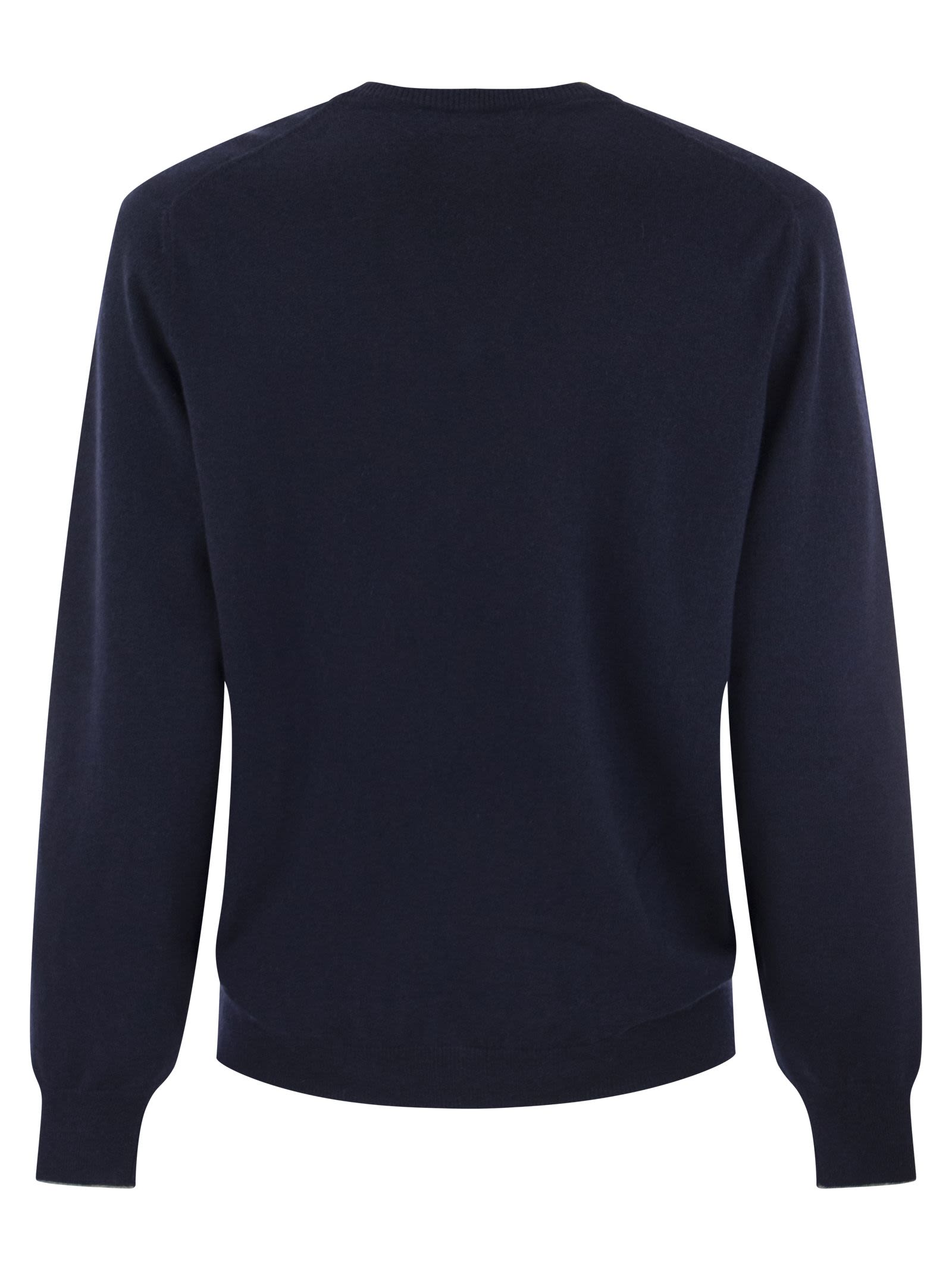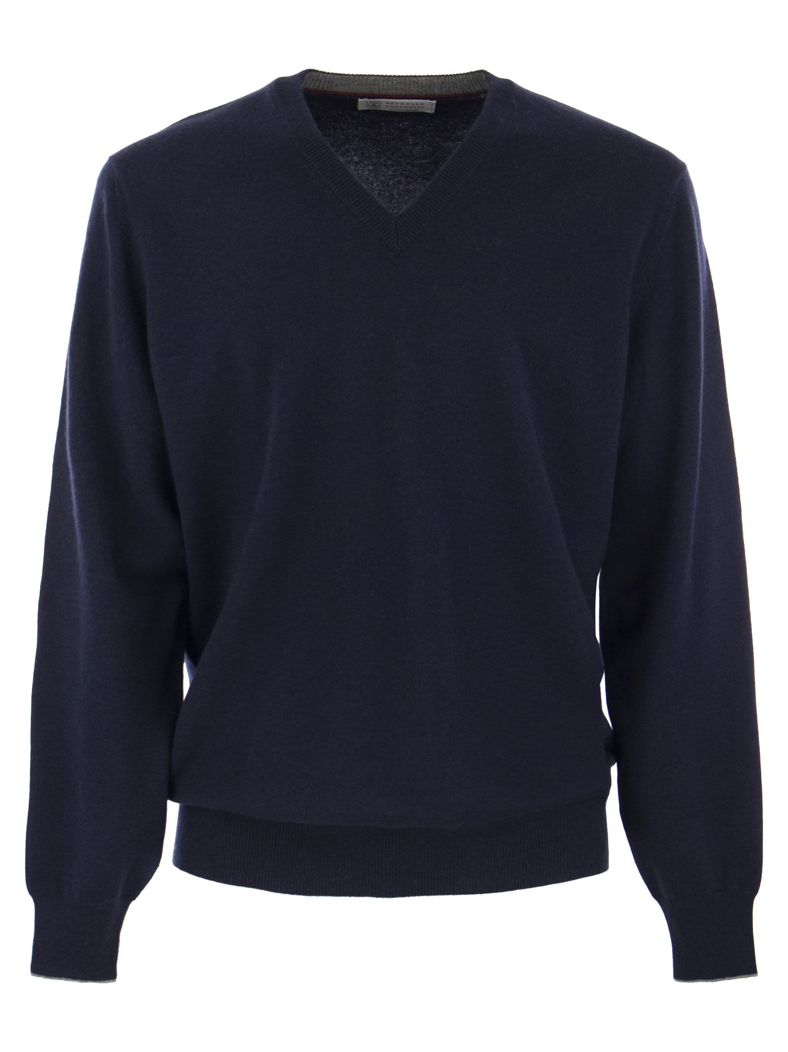 Fine cashmere fibre enriches the long-sleeved pullover, a four-season element of the male wardrobe. The subtle contrast-colour piping along the edges of the collar and cuffs adds a refined detail to the style of the garment, which offers a regular fit with volumes that stay close to the body. - Rib-knit V-neck - Rib knit cuffs and hem - Shaved knit DESIGNER ID: M2200162 CW425