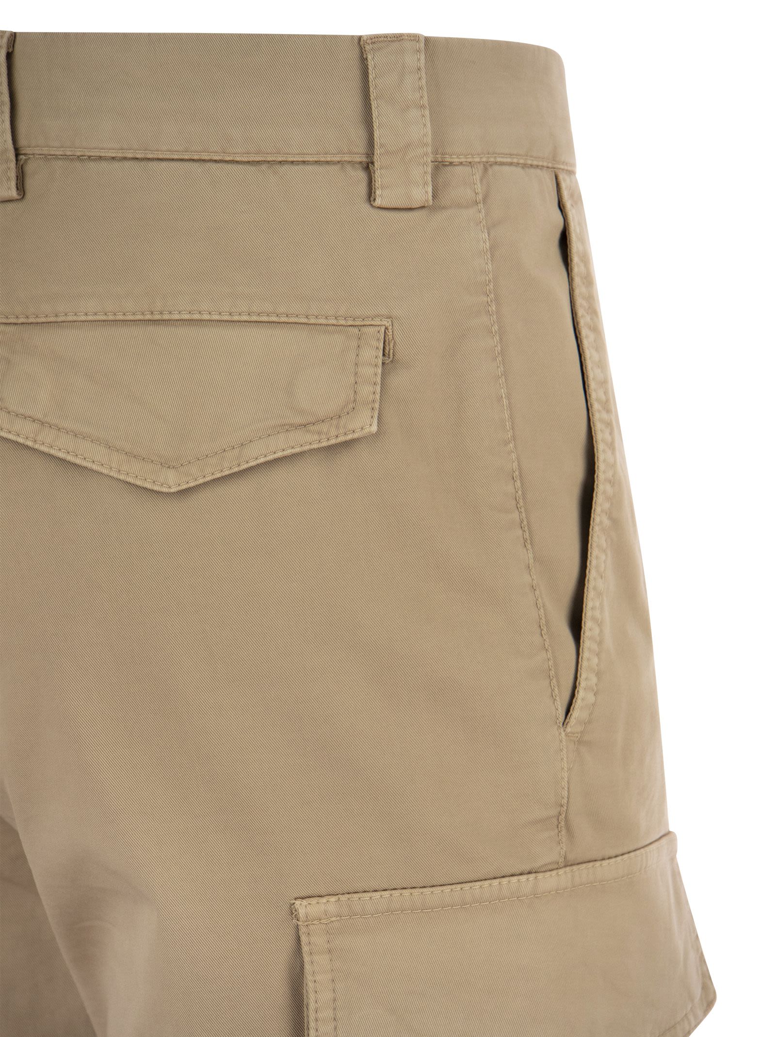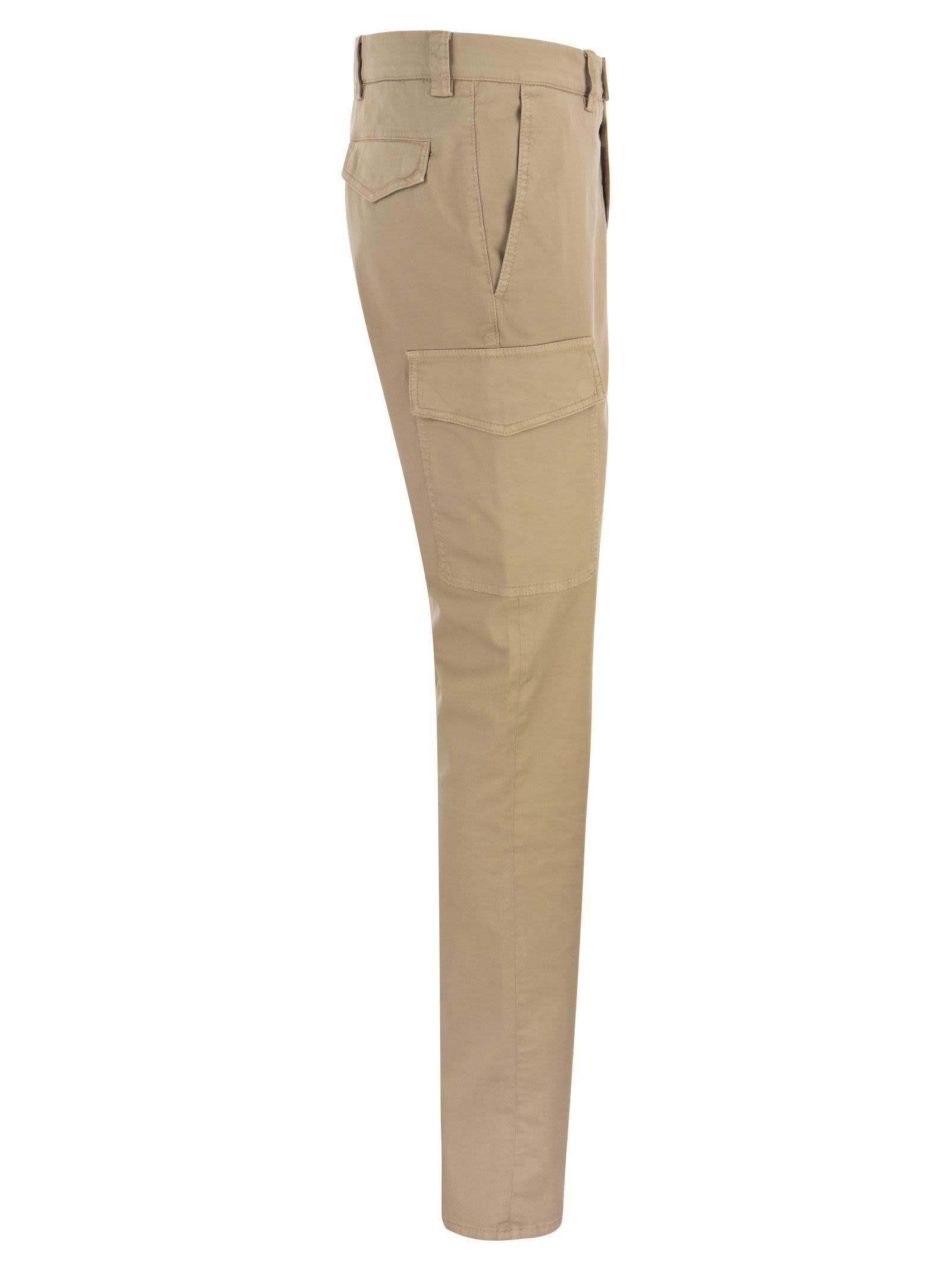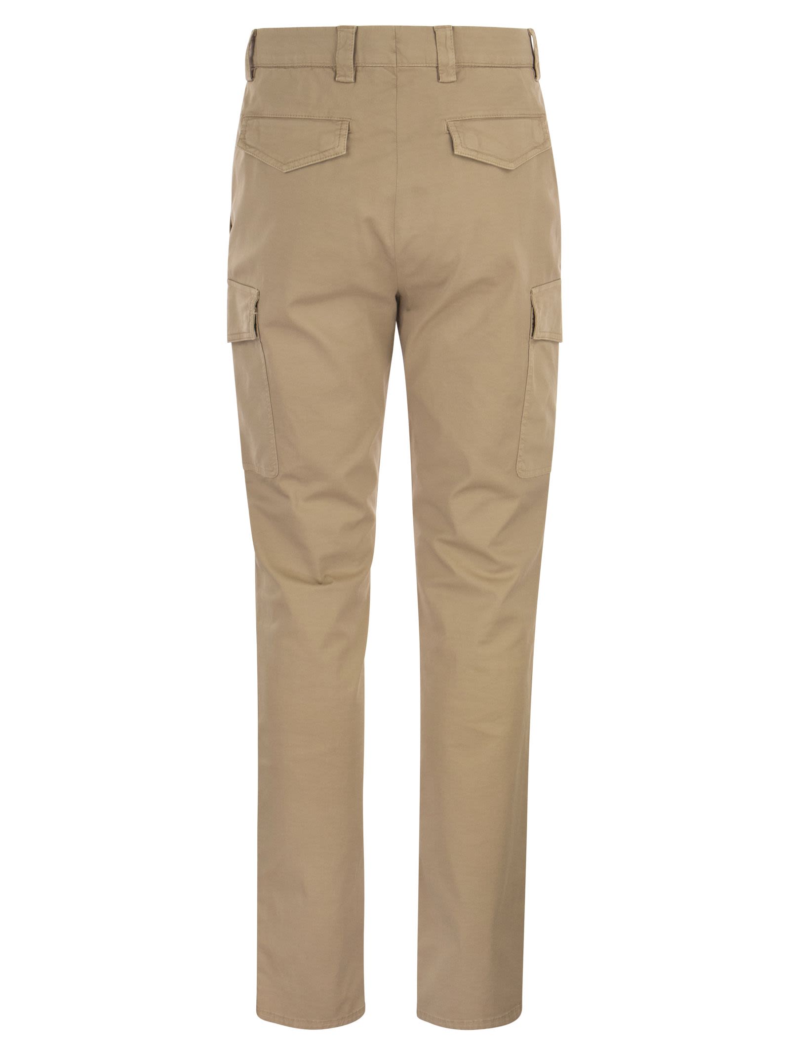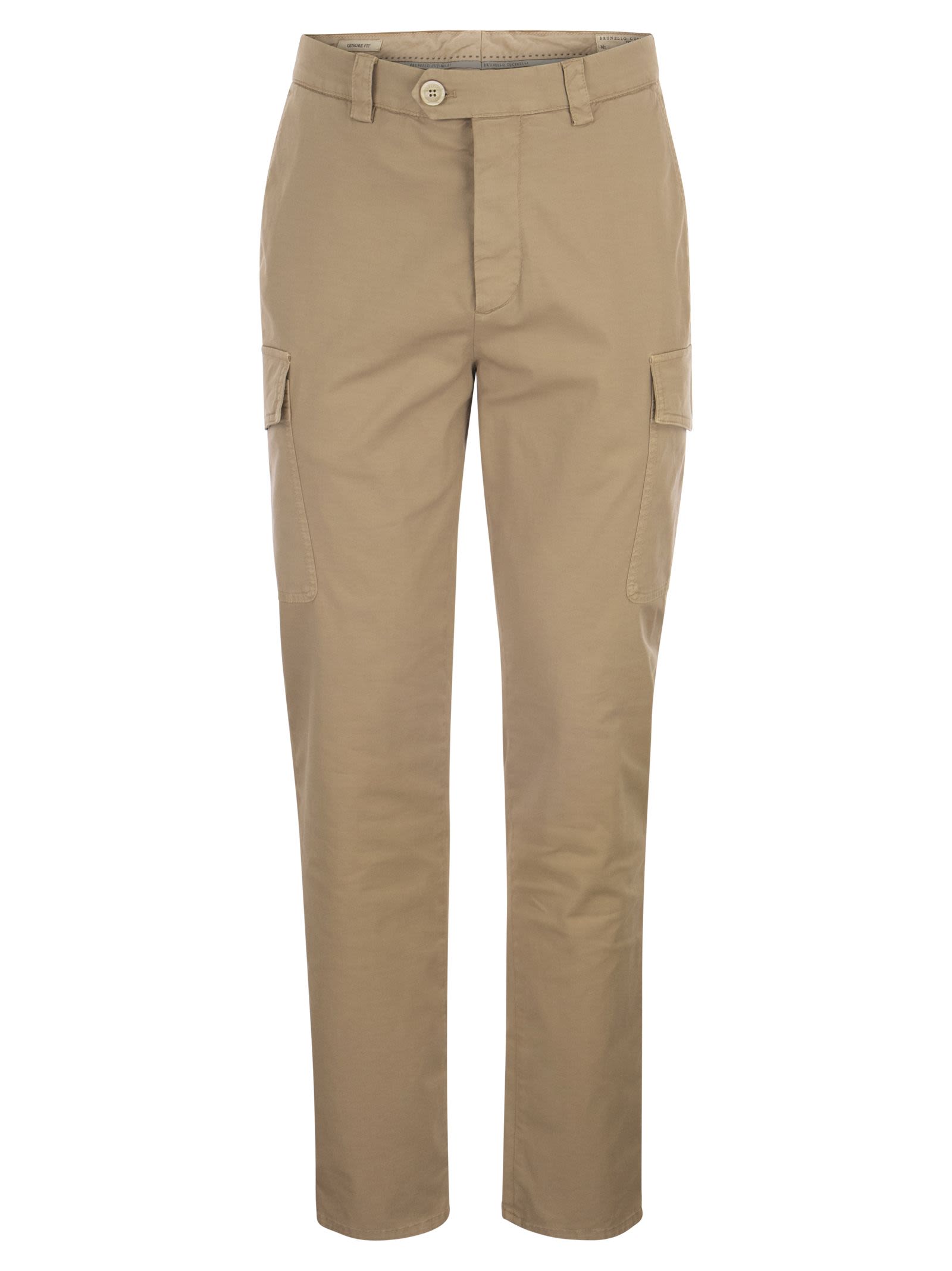 The refined qualities of American Prima cotton gabardine enrich the sporty style of the cargo trousers, which feature large, military-inspired pockets. A modern leisurewear fit offers soft proportions in the seat and a slightly low waist, while the leg cut remains close to the body. - Zip fastening with button, metal hook and button fastening - Slanted front pockets - Cargo pockets with flap and buttons - Back welt pockets with flap and buttons - Leisure fit DESIGNER ID: M289LE1890 C6294