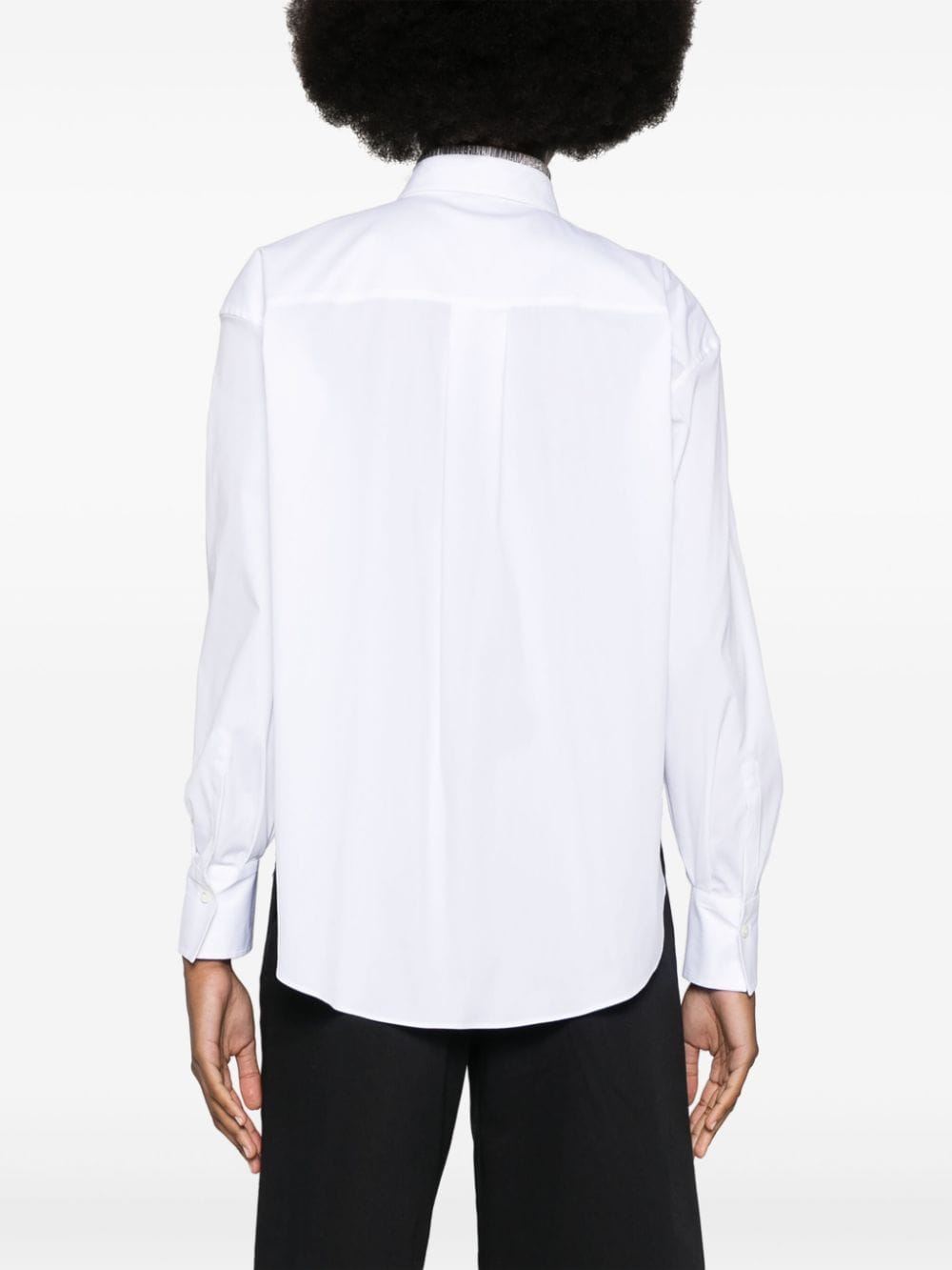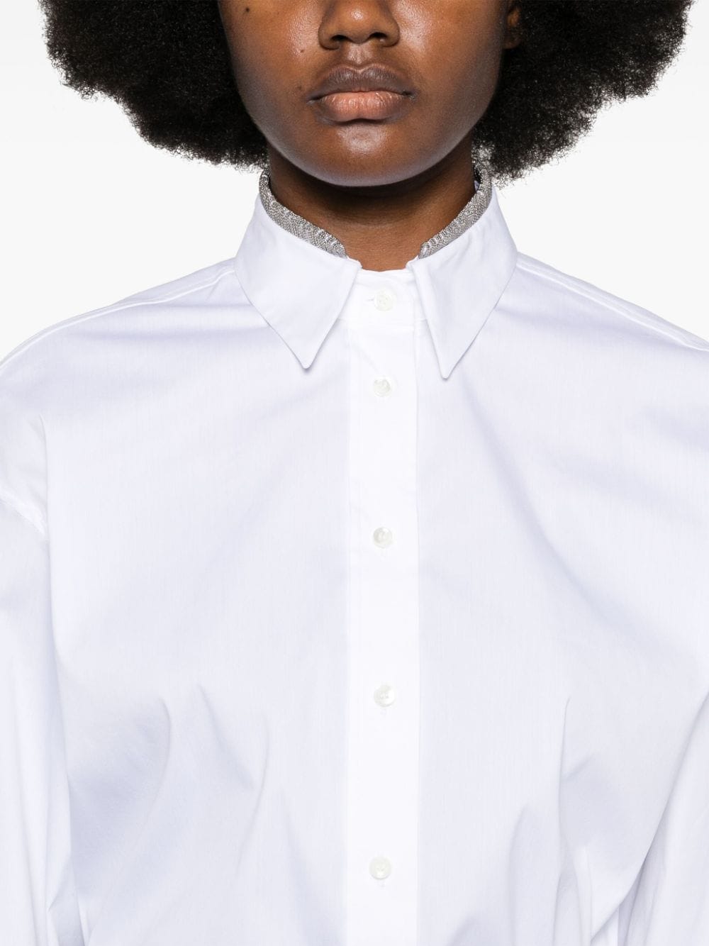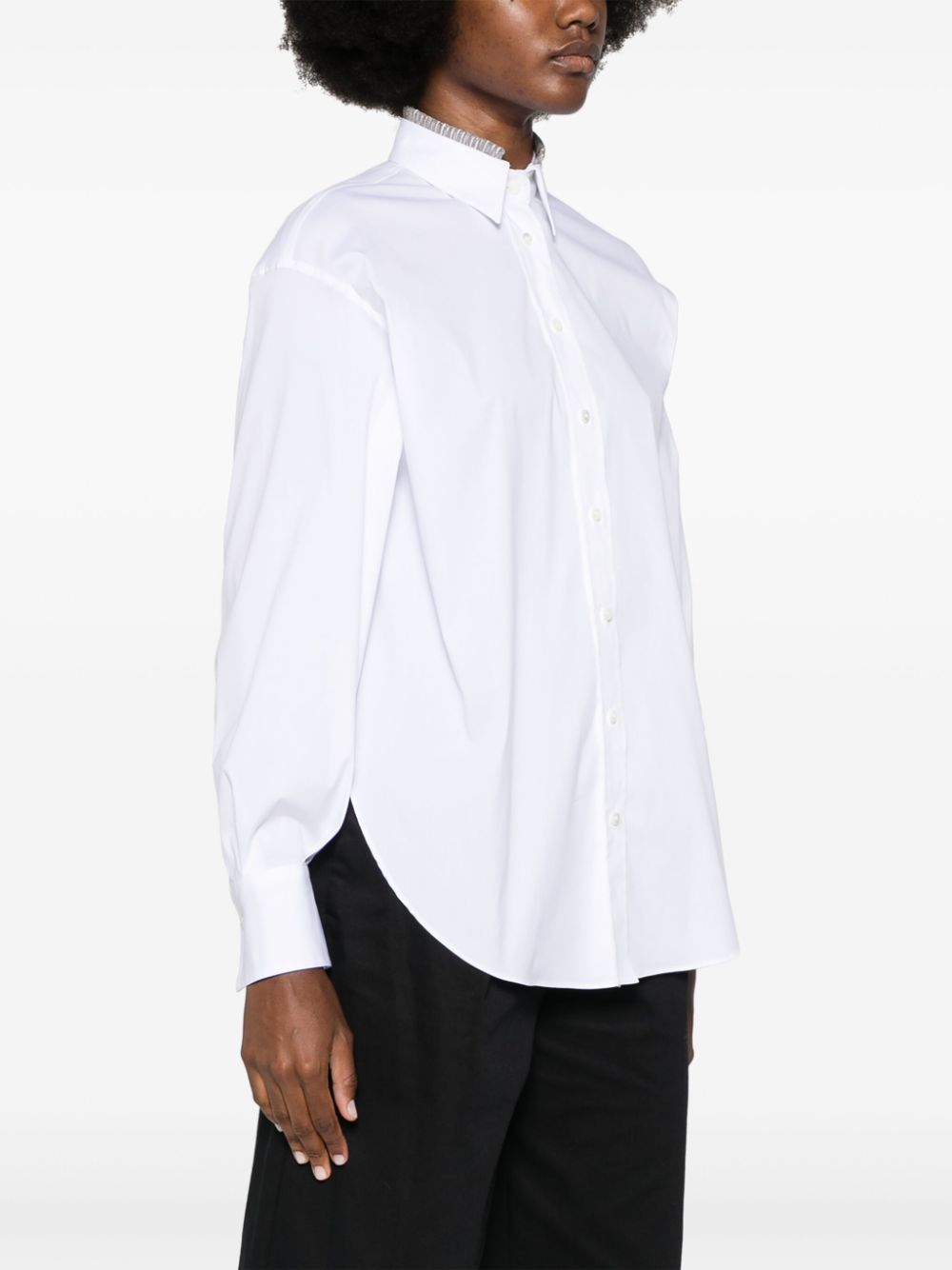 white stretch-cotton poplin texture bead detailing front button fastening long sleeves buttoned cuffs curved hem