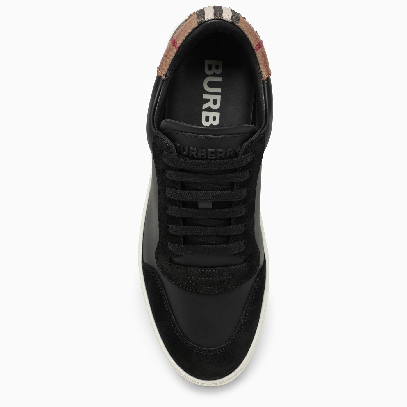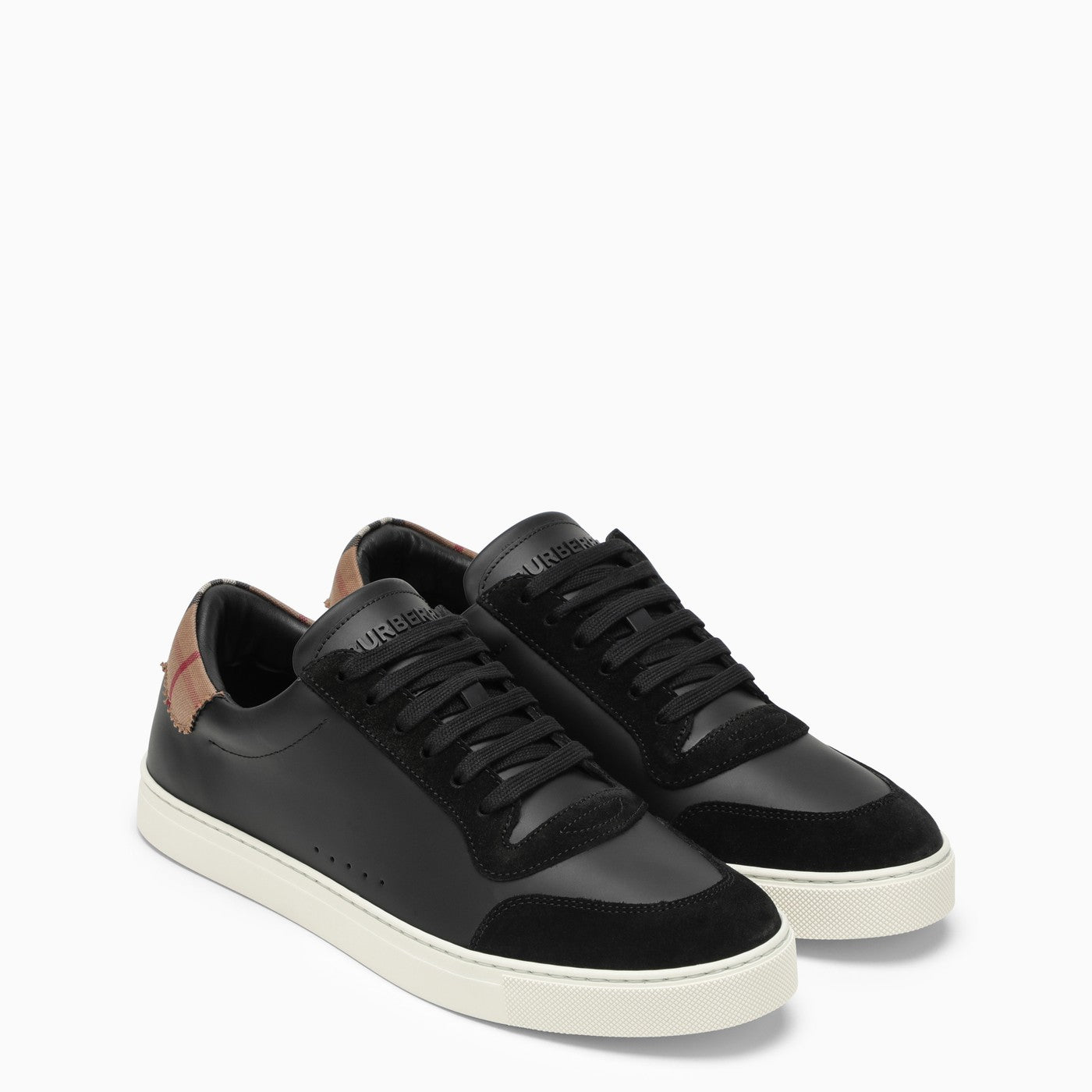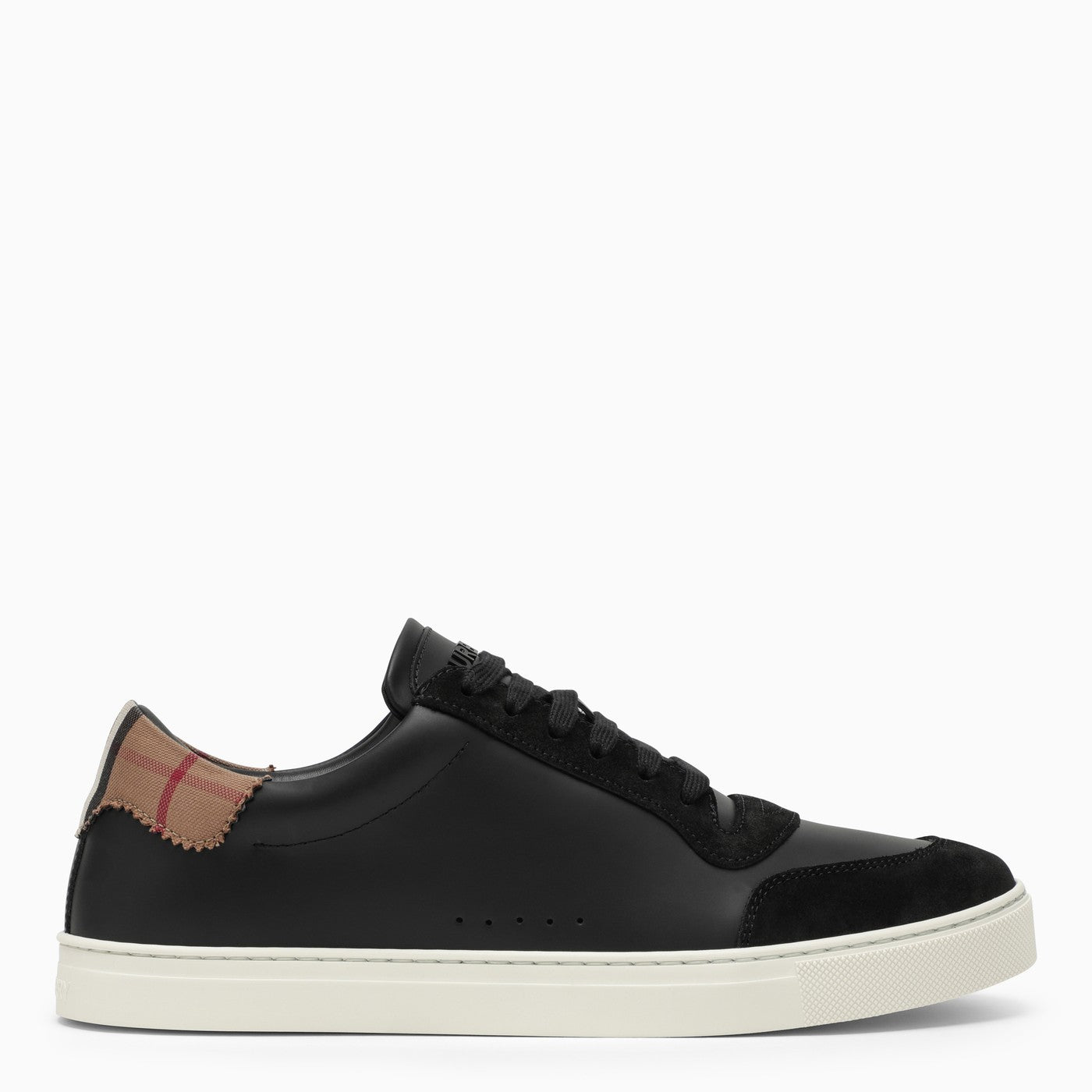 Black leather trainer from Burberry featuring a check pattern on the heel, lace-up fastening, round toe, suede detailing, logo lettering on tongue and rubber sole.