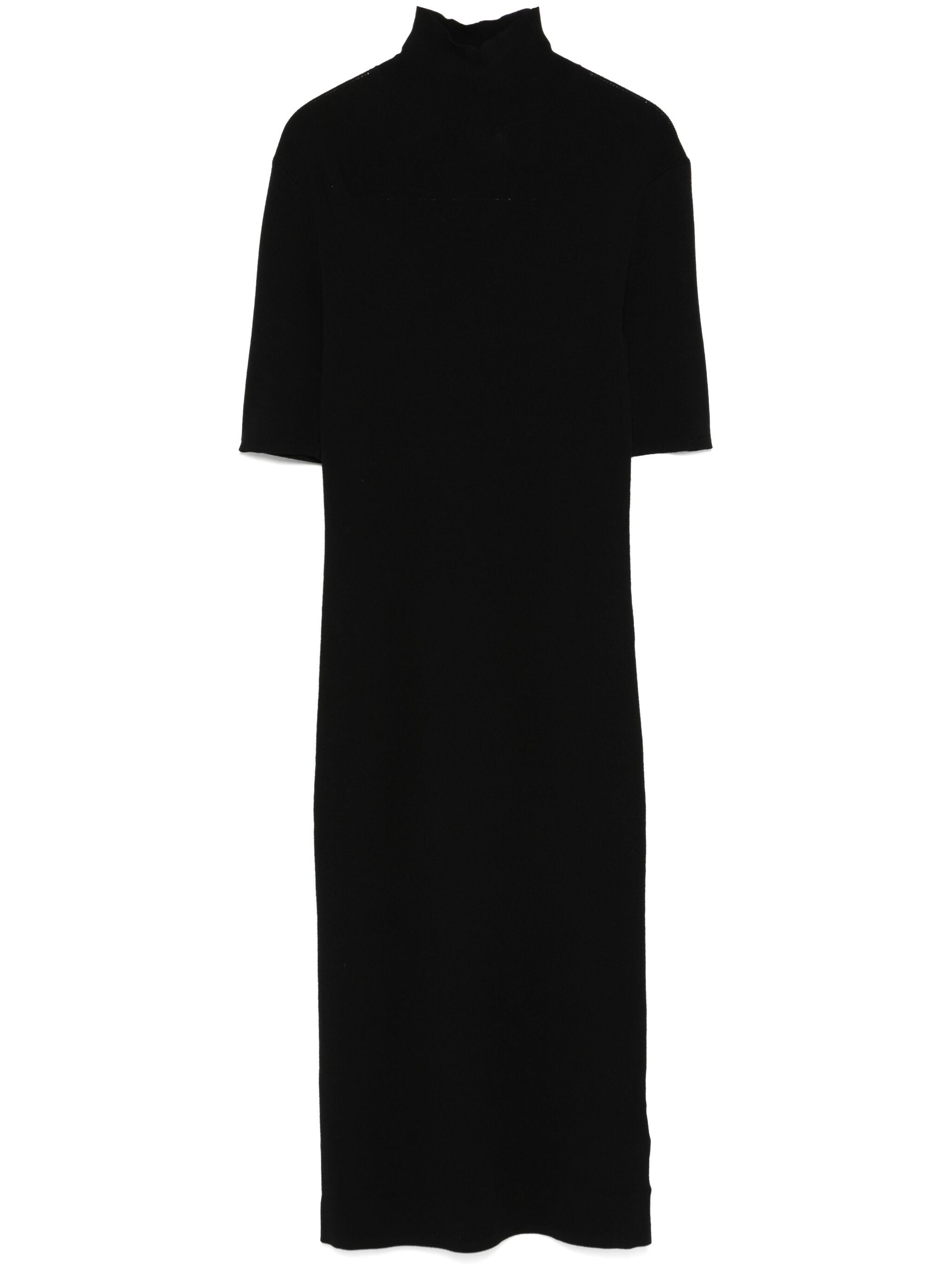 Abito in maglia nera Calvin Klein, con colletto alto e maniche corte per un look sofisticato e minimalista. Il taglio dritto e l`orlo uniforme conferiscono una silhouette elegante e versatile. Perfetto per ogni occasione, questo abito è ideale da indossare da solo o con accessori per un outfit chic.