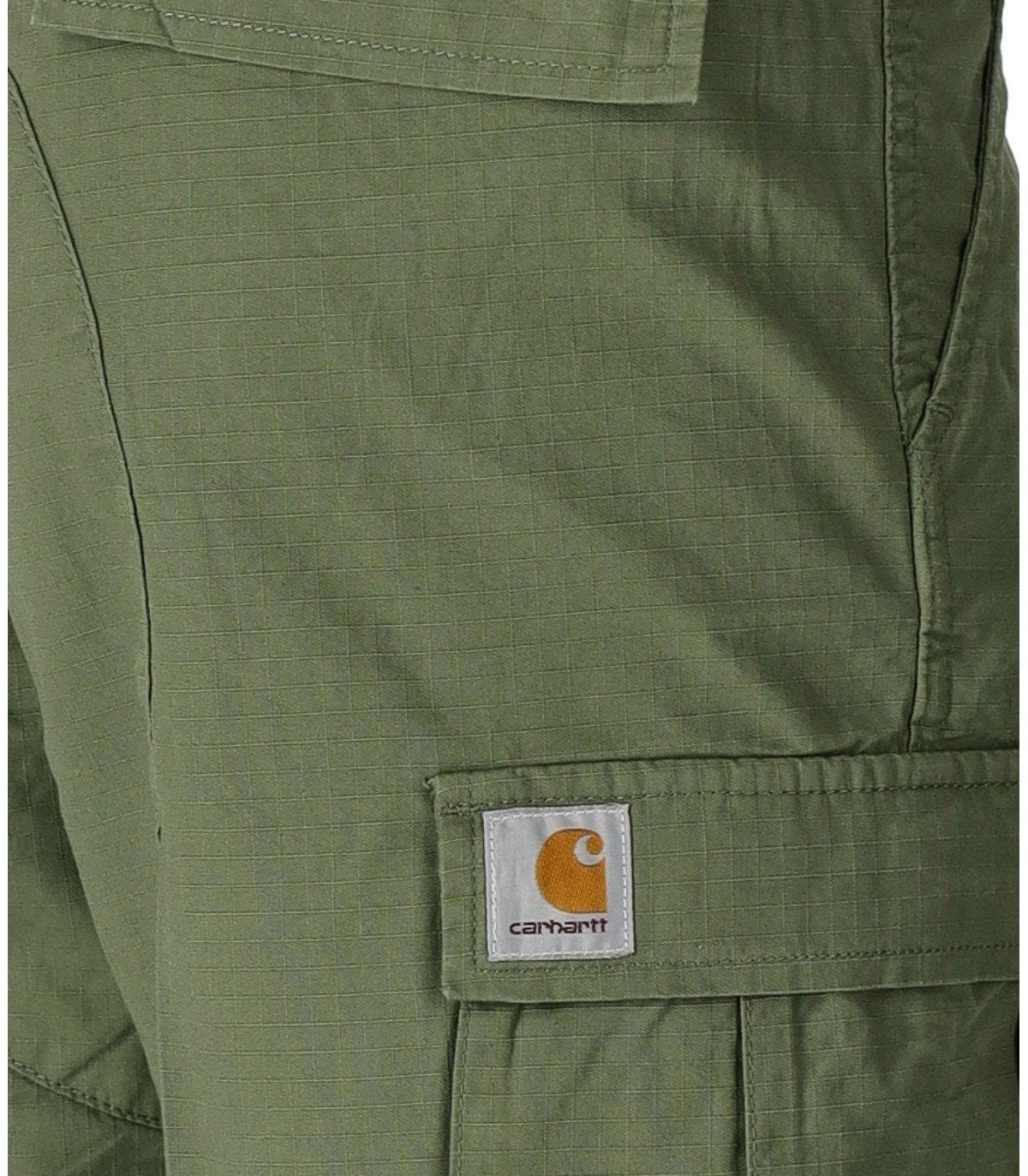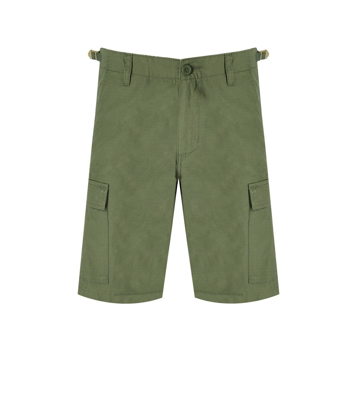 Aviation bermuda shorts by Carhartt Wip made of green ripstop cotton, equipped with cargo pockets, logo patch on the left pocket, zip and button closure. Adjustable waist with fabric straps and buckle. Low waist, slim fit. Composition: 100% cotton.