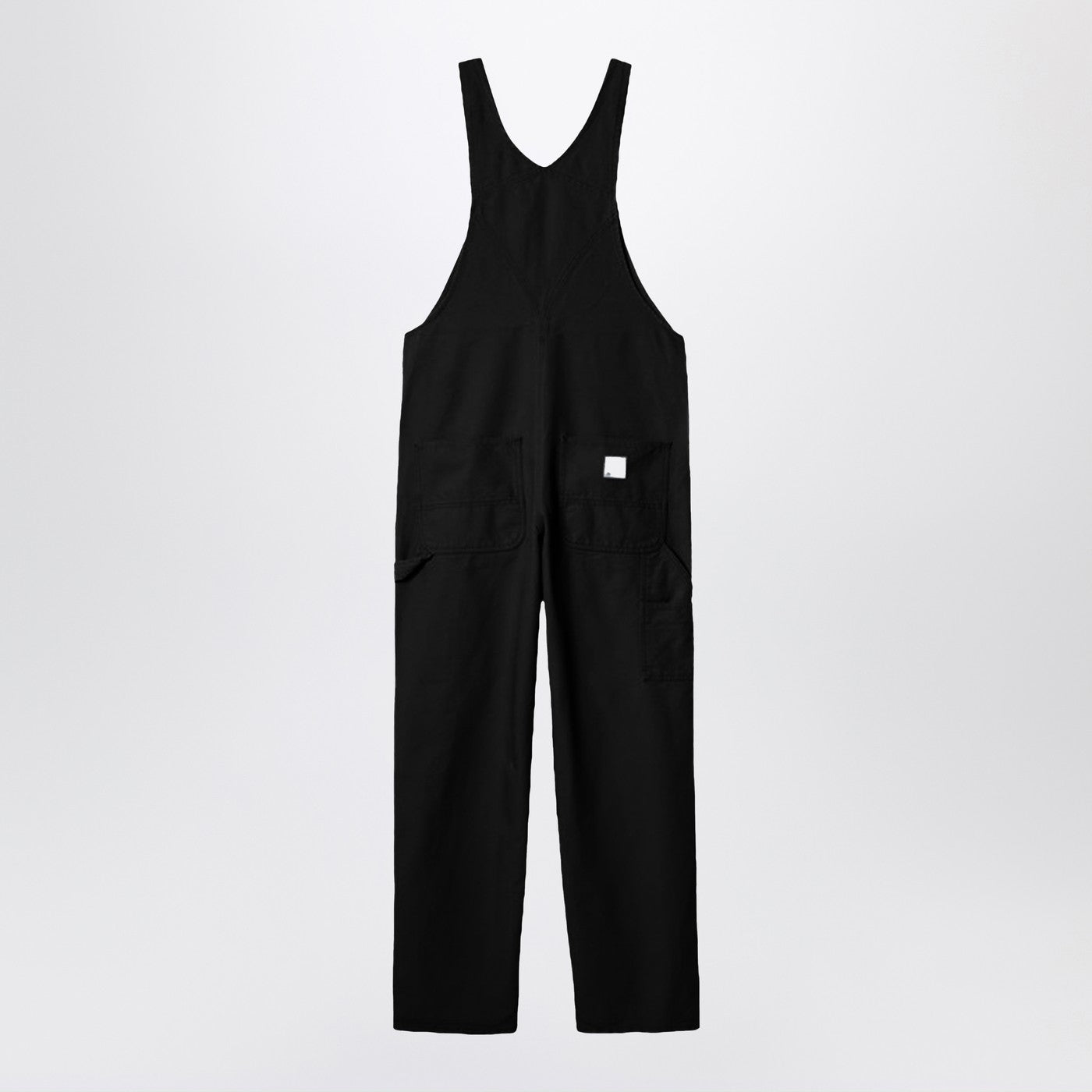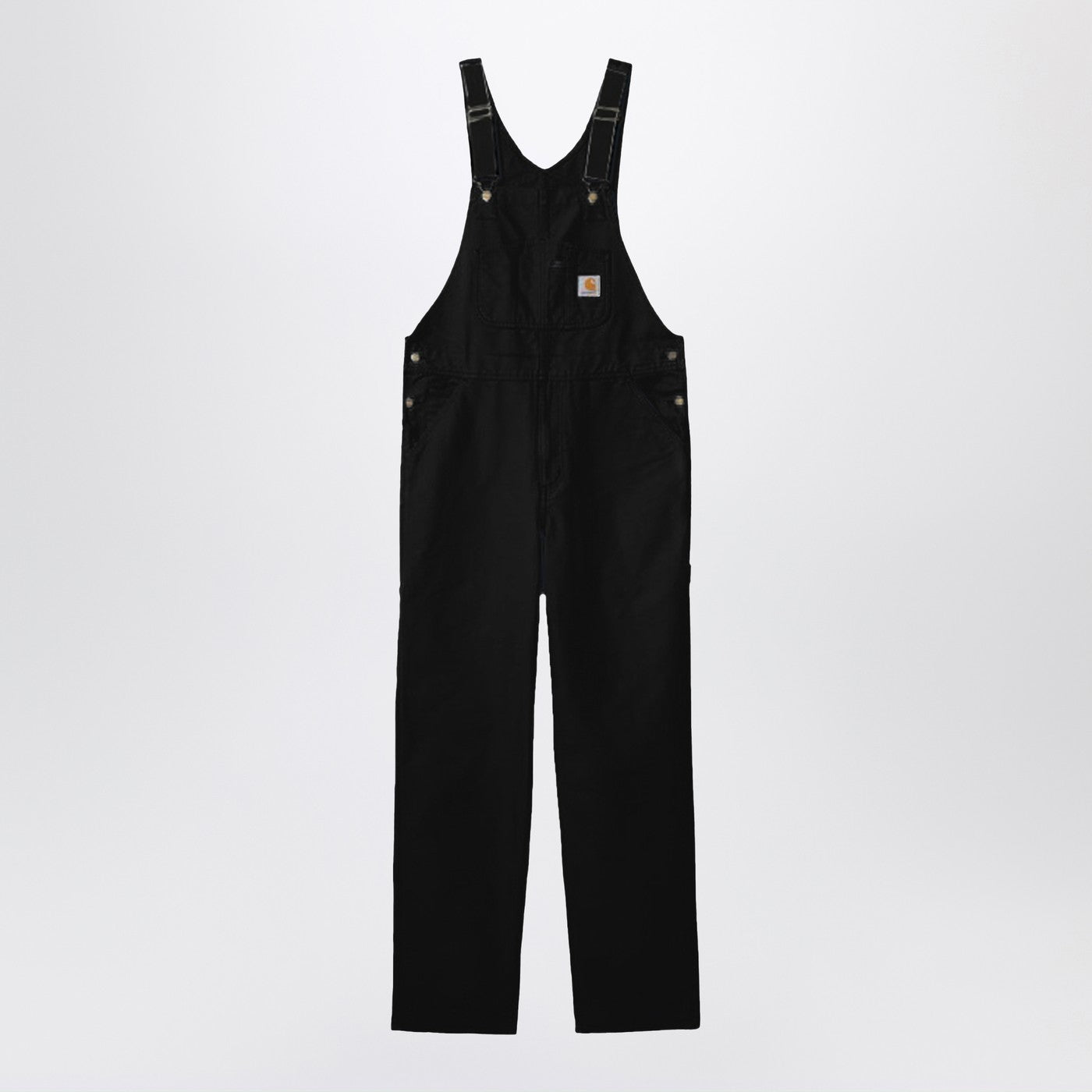 Black organic cotton Dearborn canvas coverall by Carhartt WIP, featuring numerous pockets, square front and back fabric logo label, adjustable elastic braces, triple stitching, reinforced stitching, tool pocket, hammer loop and side button fastening.