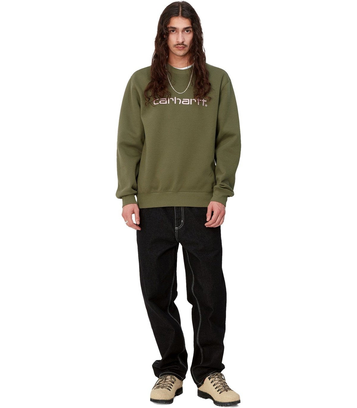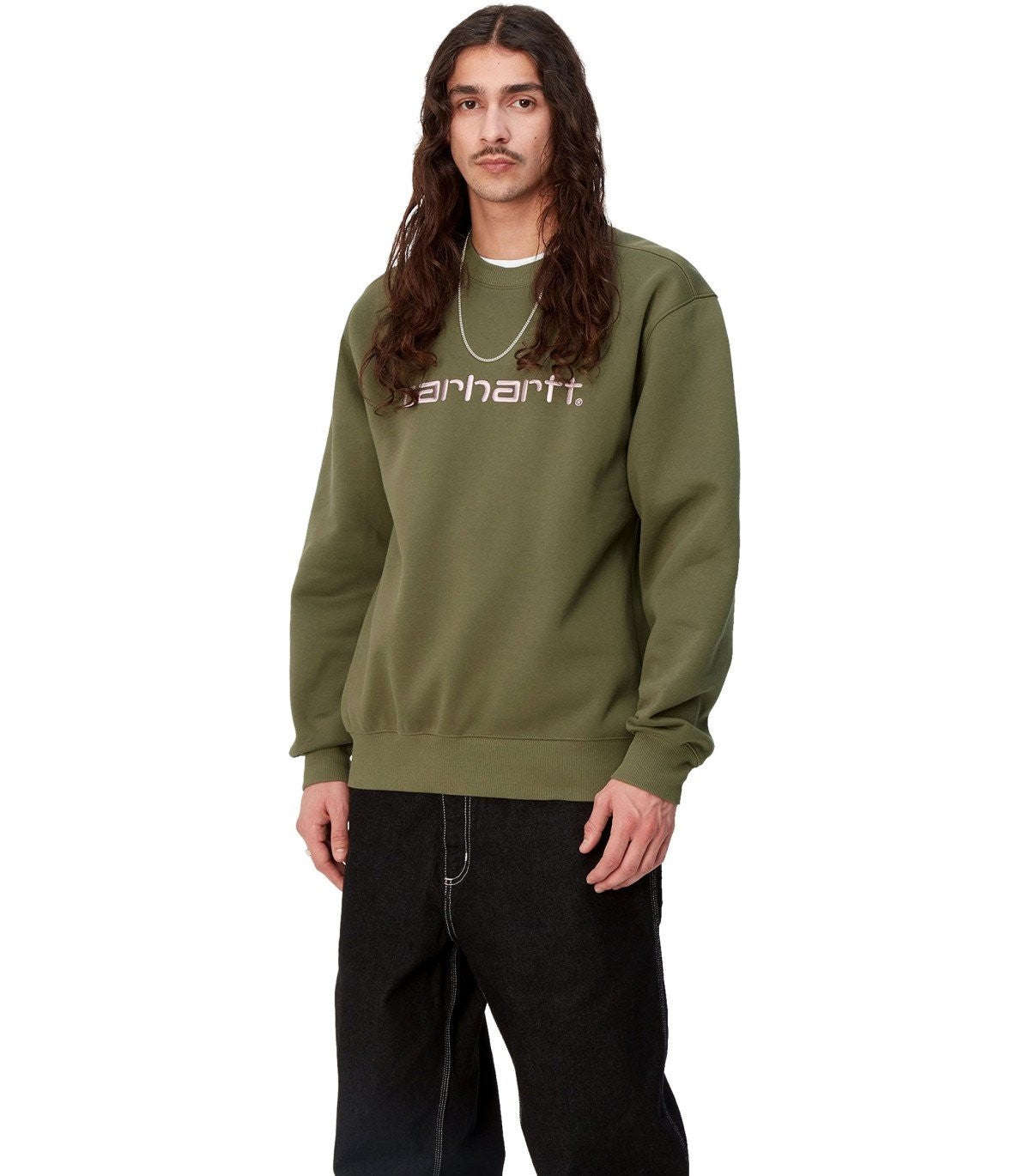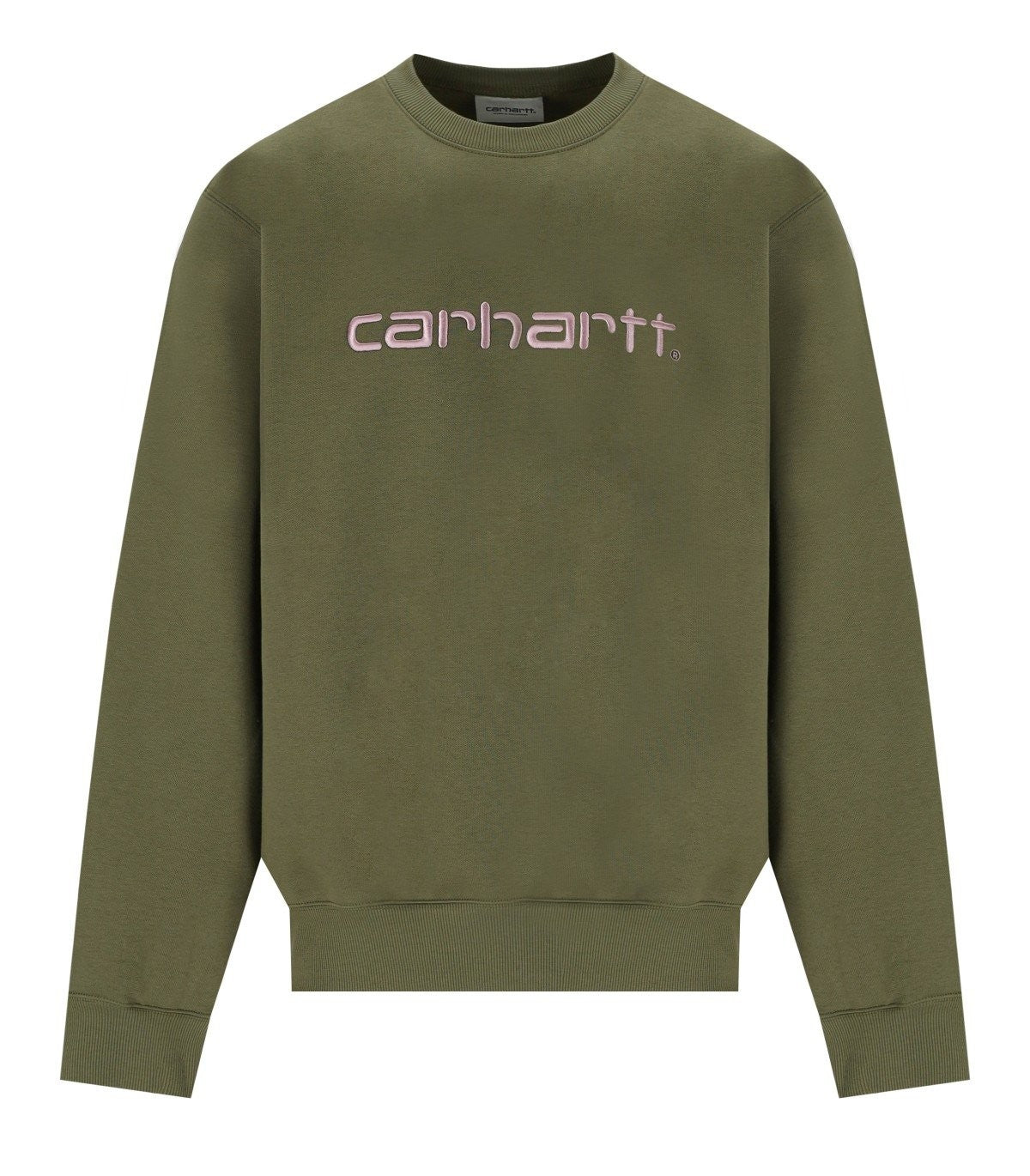Carhartt Wip sweatshirt made of military green brushed cotton blend. Embroidered logo on the front in shades of pink, ribbed collar, cuffs and hem. Loose fit. Composition: 58% cotton, 42% polyester.