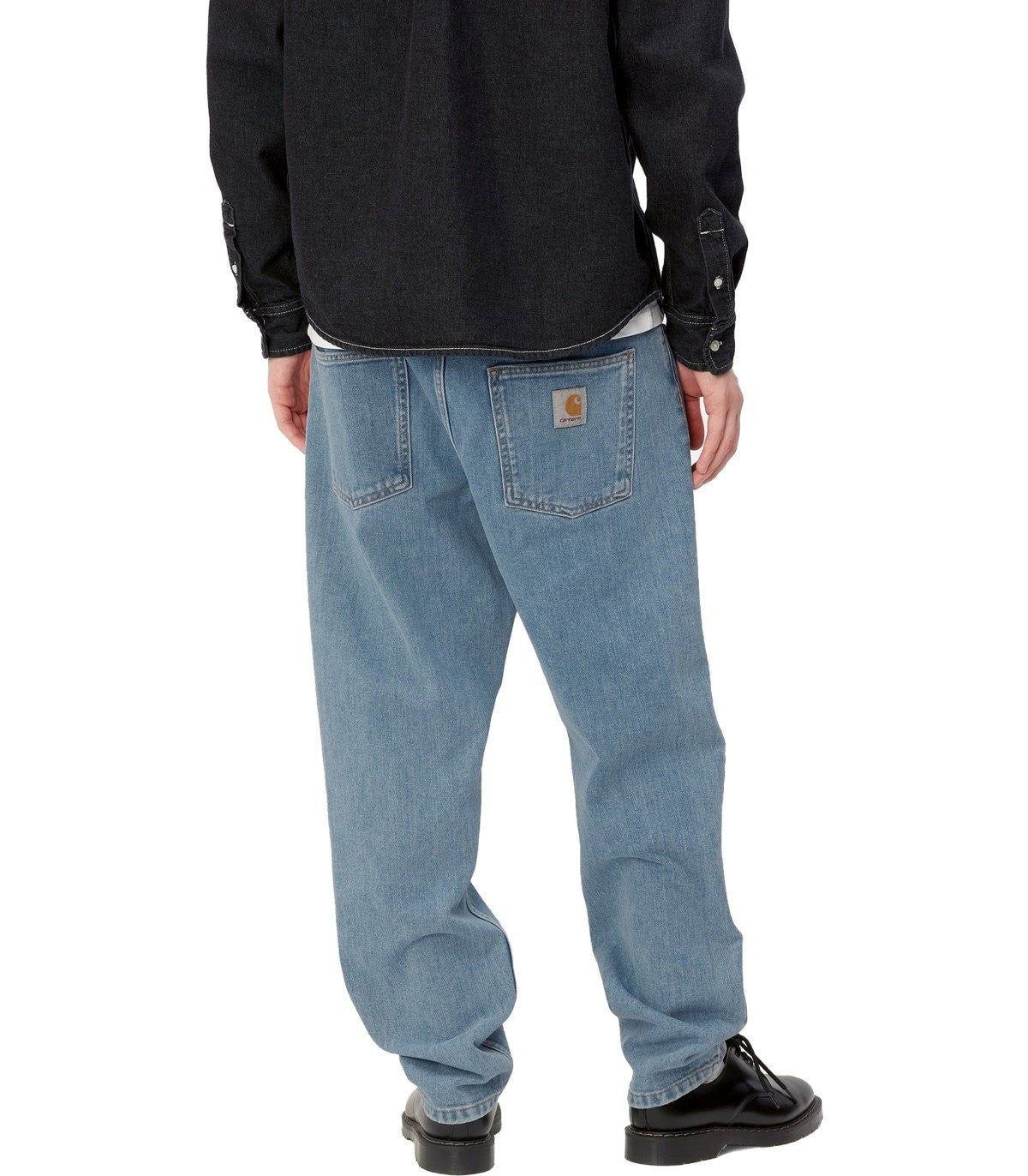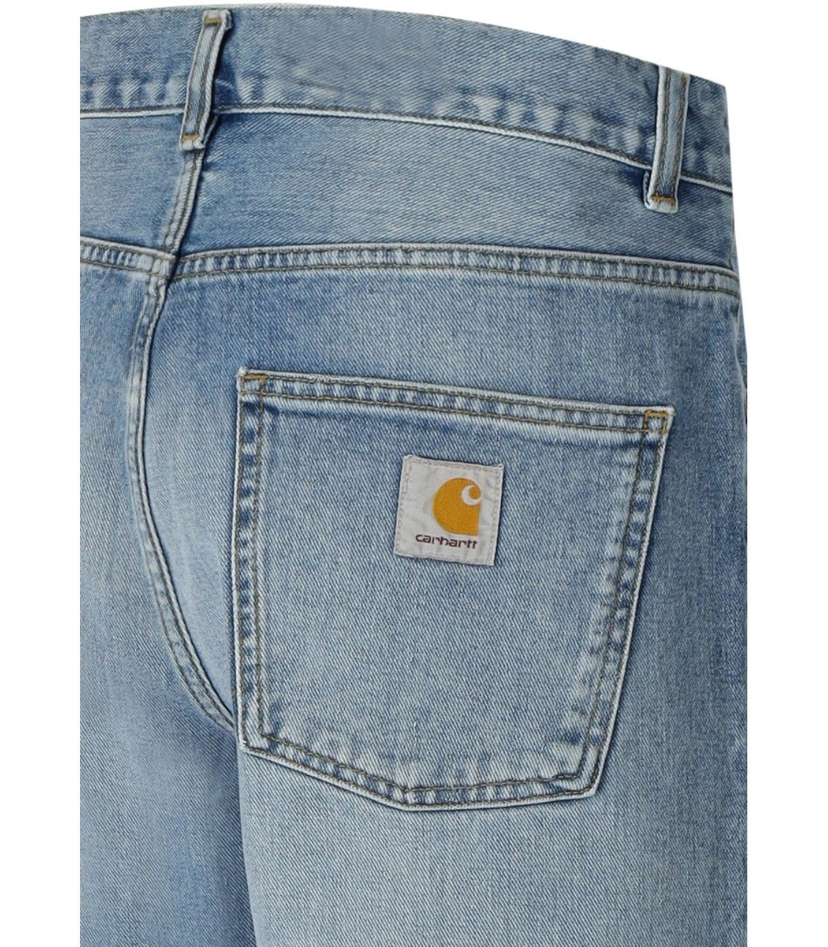 Carhartt Wip Newel Jeans are made from light-wash denim, featuring contrasting stitching and a rear logo patch. They have a regular waist with belt loops, and a zip and button closure. The fit is relaxed but narrower at the bottom. Composition: 100% cotton. Pocket lining: 65% polyester, 35% cotton.
