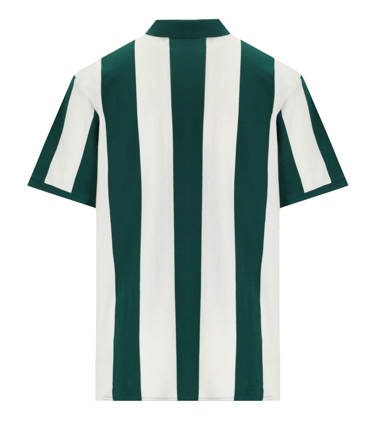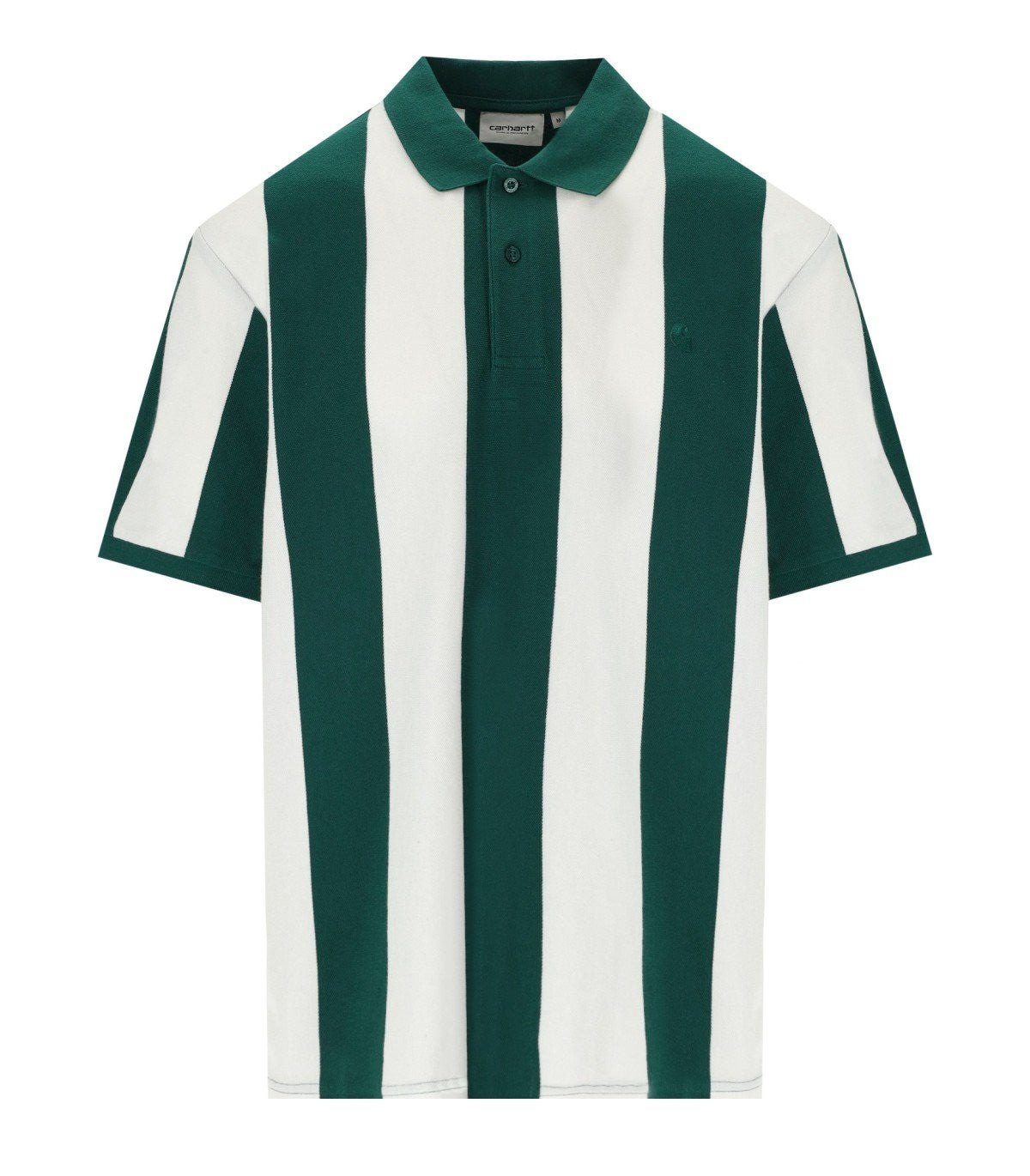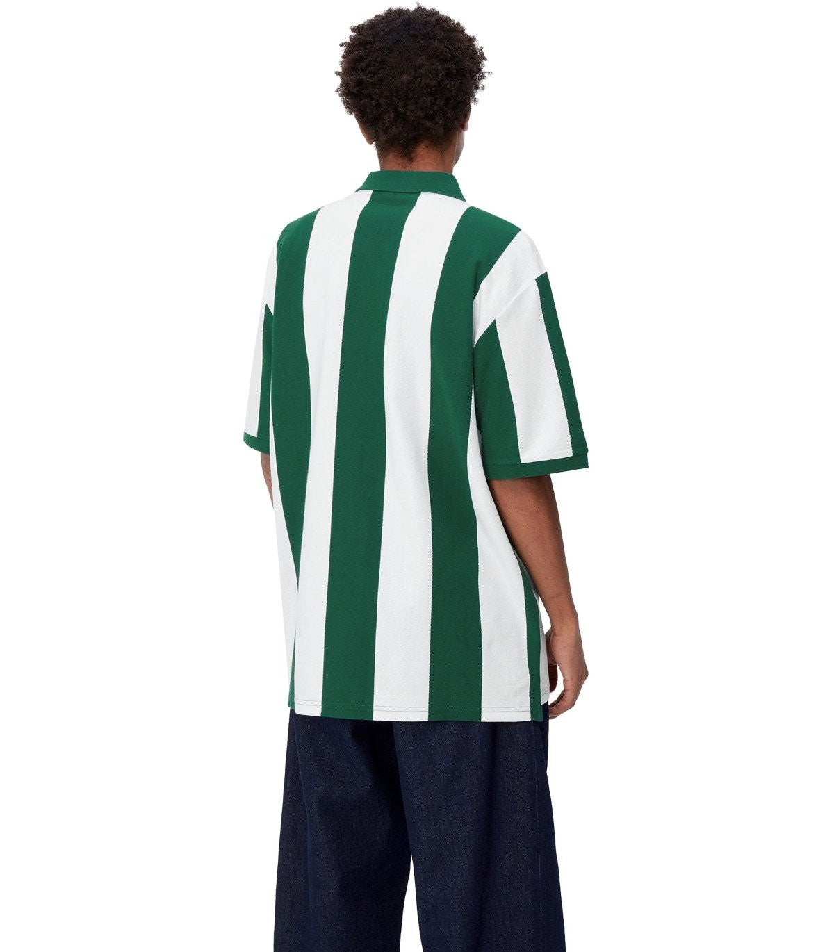 Short-sleeve Hinton Polo by Carhartt Wip made of pique cotton with white and green vertical stripe pattern. Loose fit. The model is 175cm tall and is wearing size M. Composition: 100% cotton.