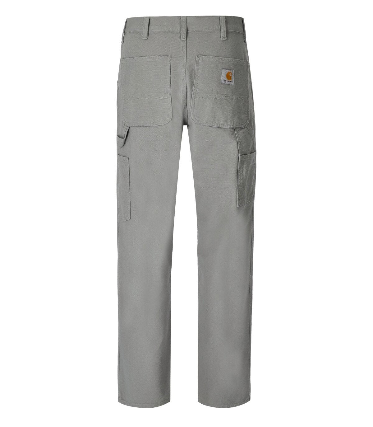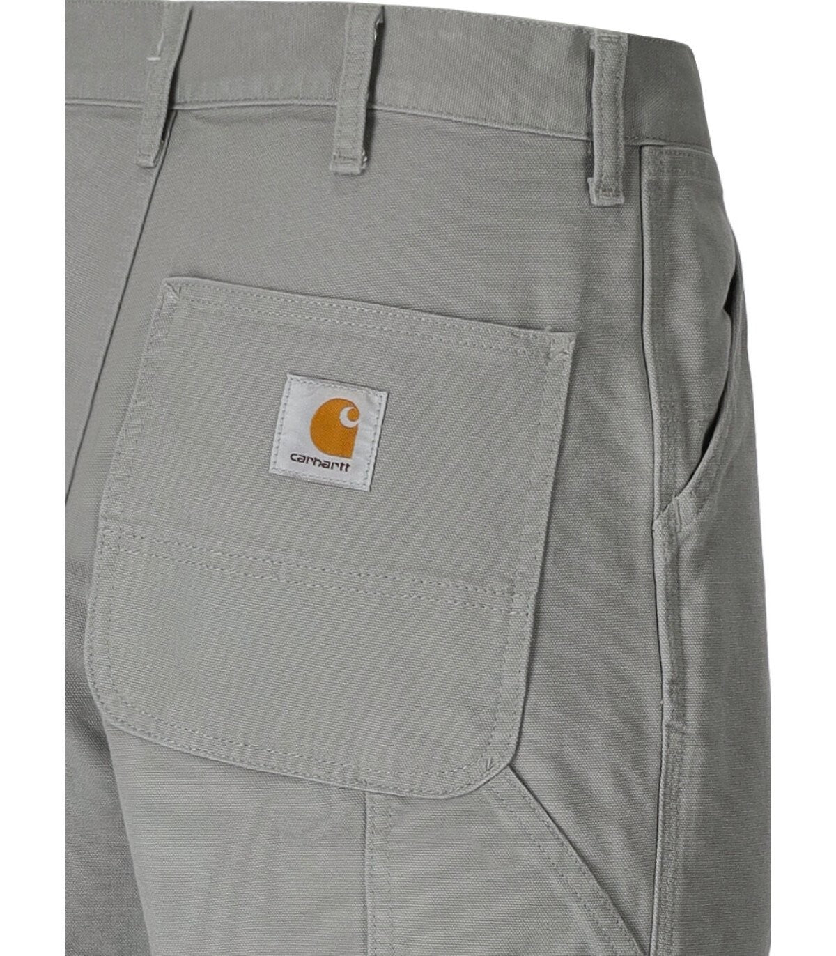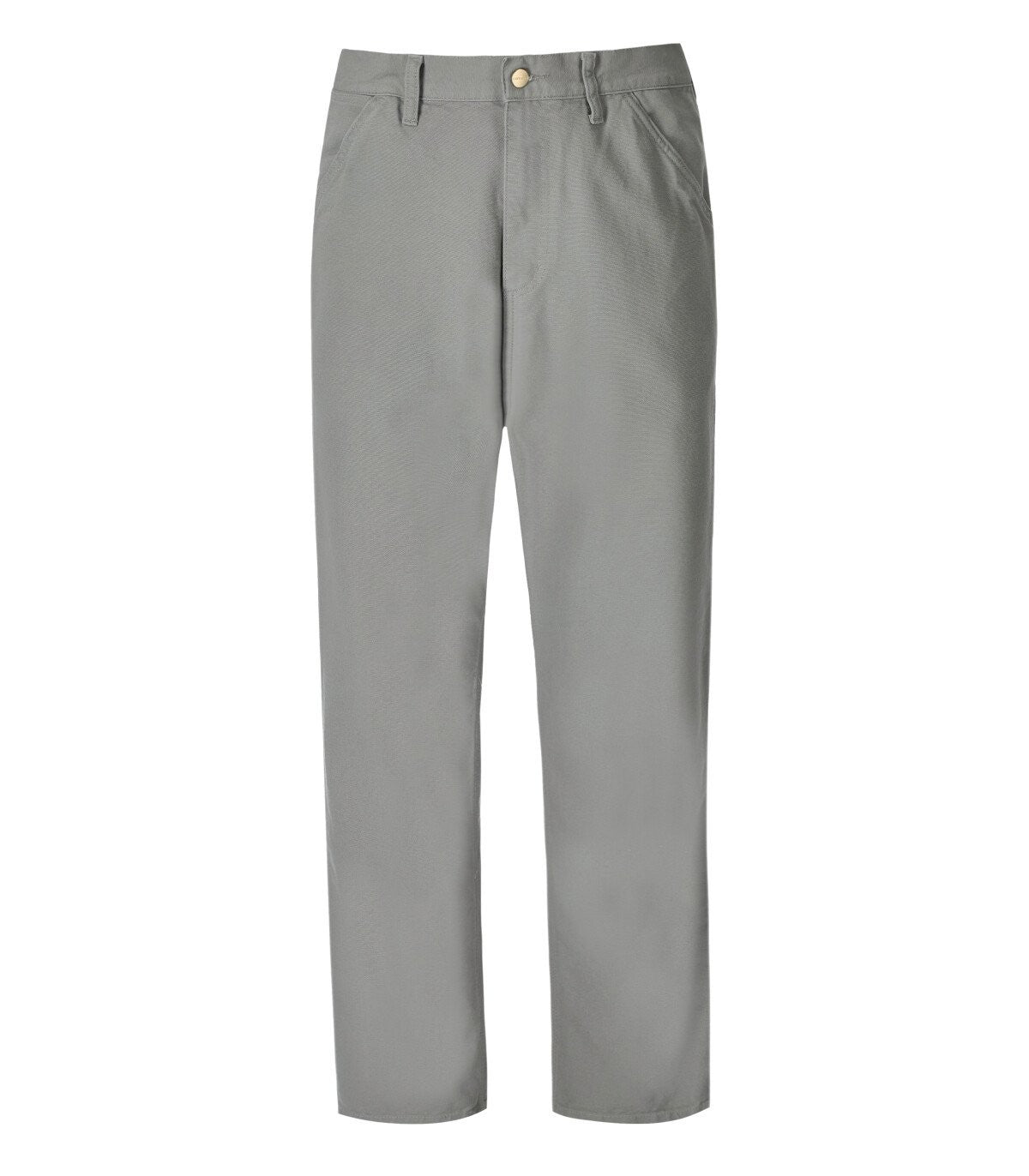 Carhartt Wip Single Knee trousers made of grey cotton canvas. It features several work pockets, logo patch on the back, belt loops, zip and button closure. Relaxed straight fit with regular waist, length 32. Composition: 100% organic cotton.
