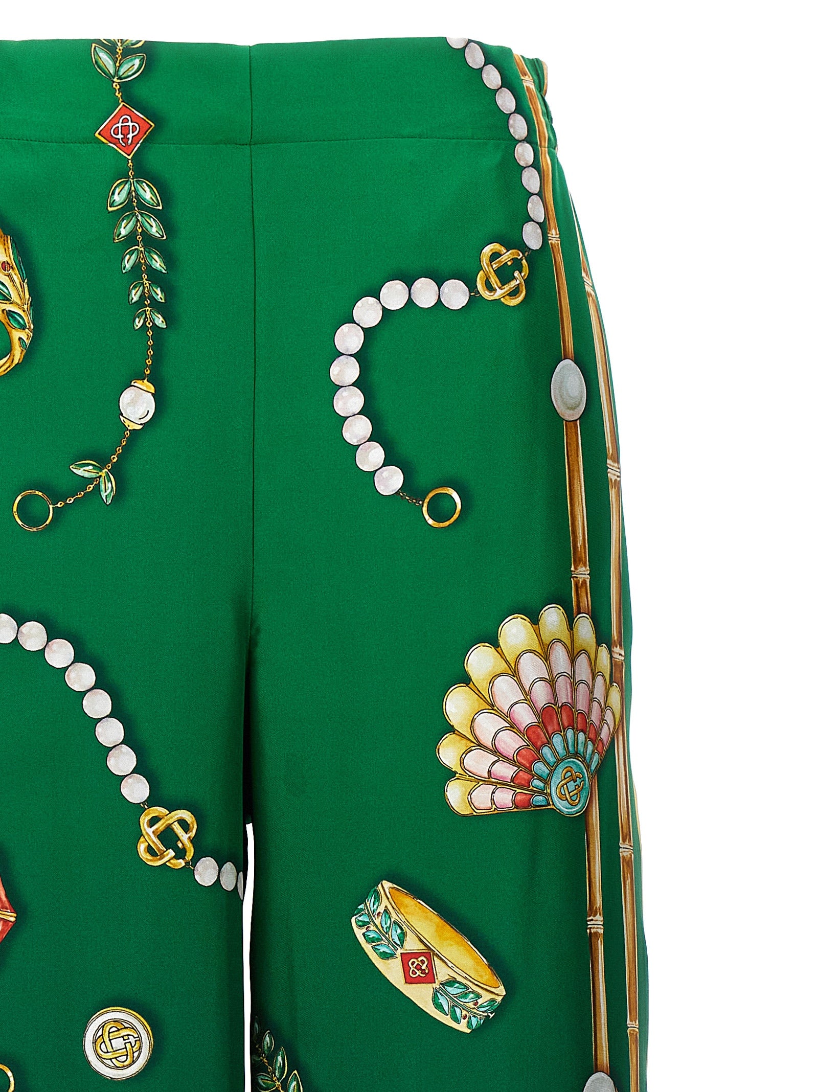 'La Boite a Bijoux' printed silk pants with elastic waistband, pockets, wide leg.