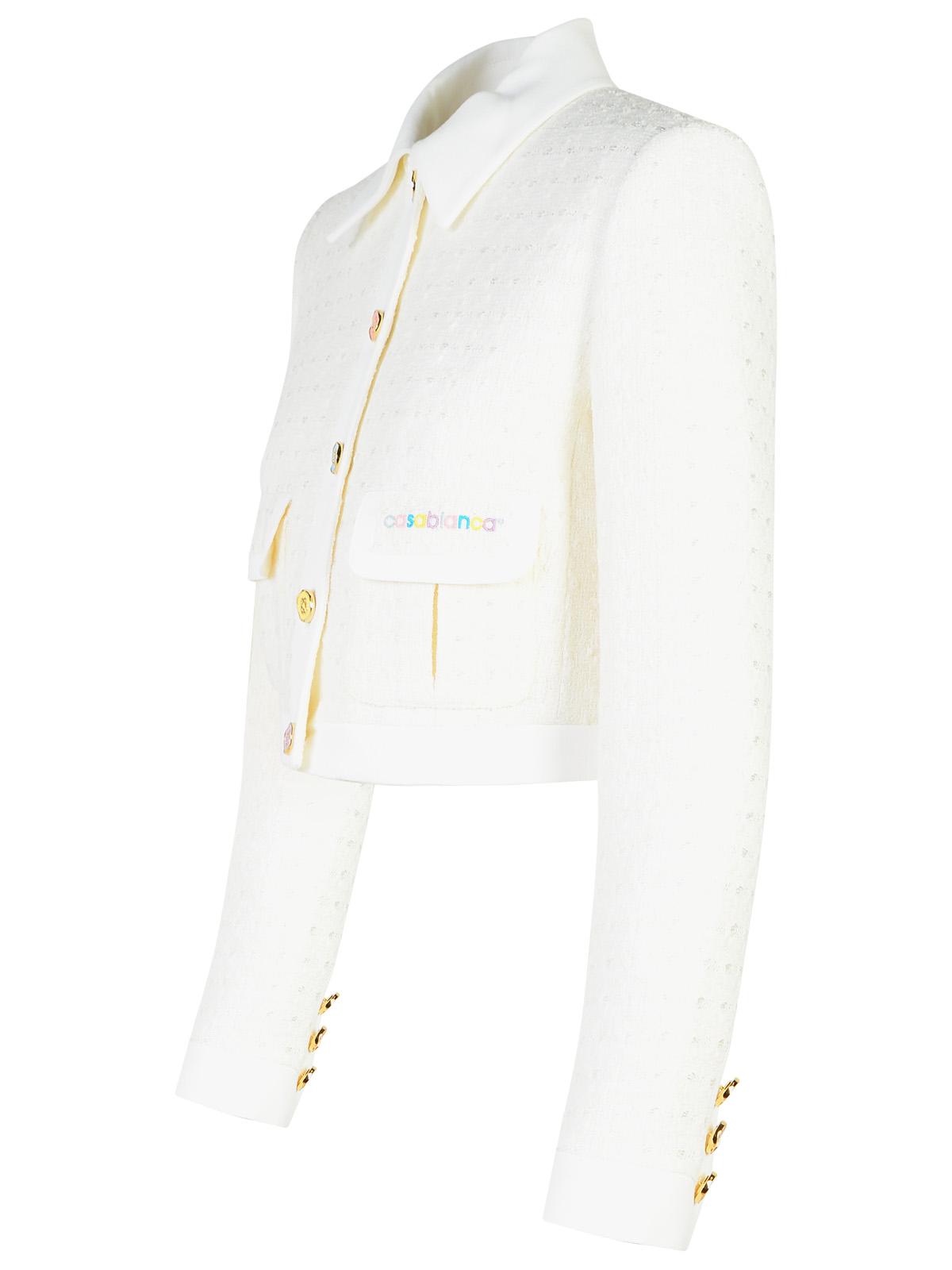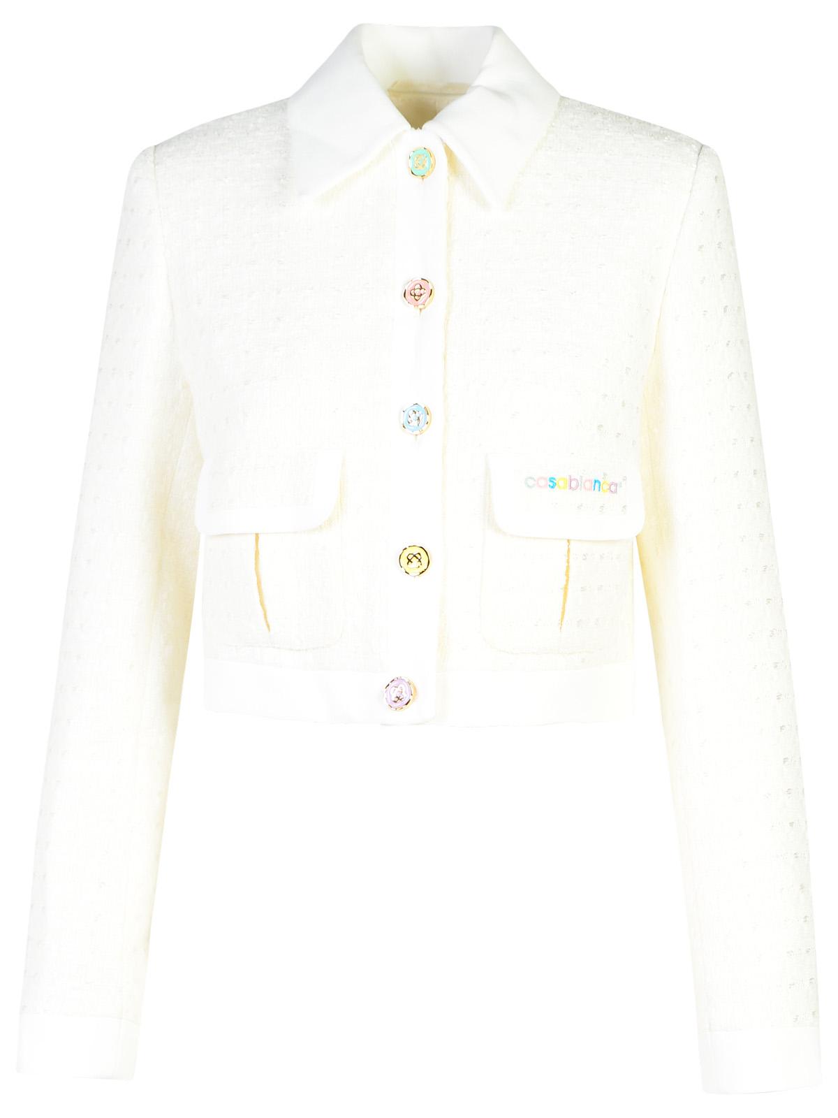 Pointed collar, tone-on-tone finish, logo and colored front button closure, side pockets with logo embroidery, padded shoulders, buttoned cuffs, tone-on-tone hem