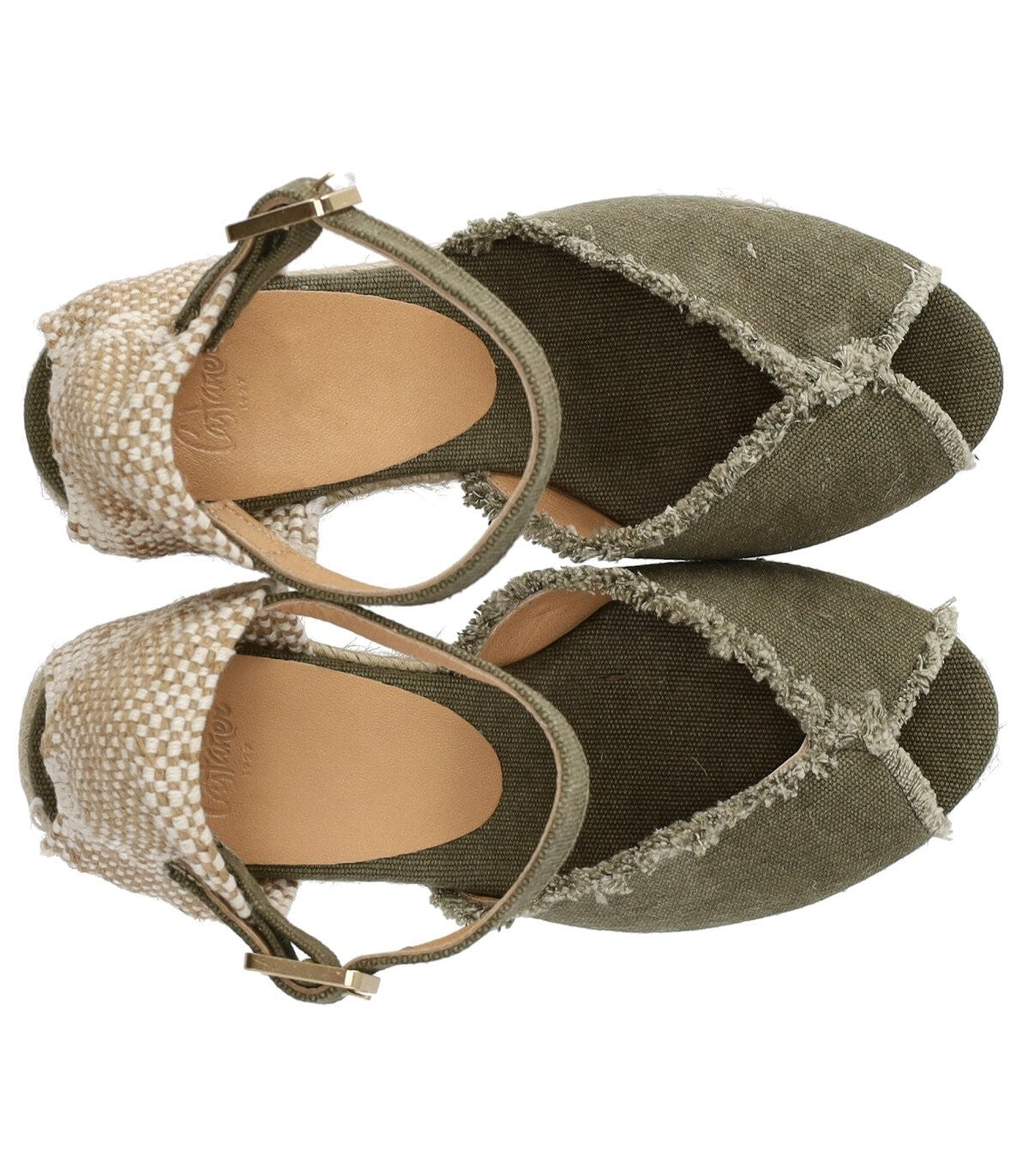 Betina espadrille by Castañer made of olive green cotton canvas with fringed ends. Leather lining, ankle strap closure and rubber sole. Wedge height 9 cm with 2 cm platform. External composition: 100% cotton. External composition: 100% sheepskin.